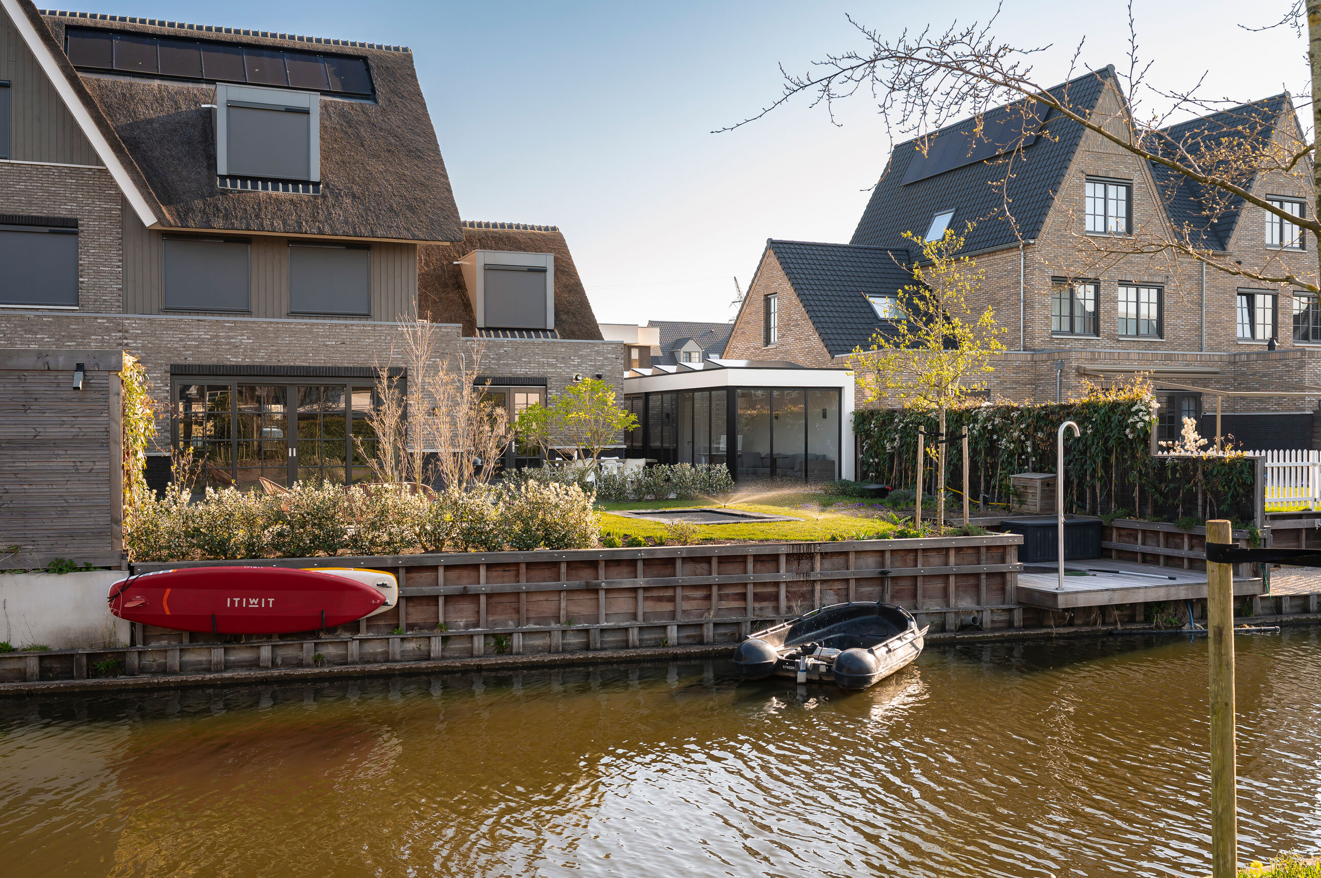 Hout dat gelijkmatig vergrijst, gevels met een rustige tekening en glas dat veel licht binnenlaat zorgen samen voor samenhang. De veranda de tuinkamer en de berging lijken daardoor onderdelen van één groter geheel. Je ziet geen sprong in stijl of afwerking en dat maakt de tuin ruimer dan hij in meters is.