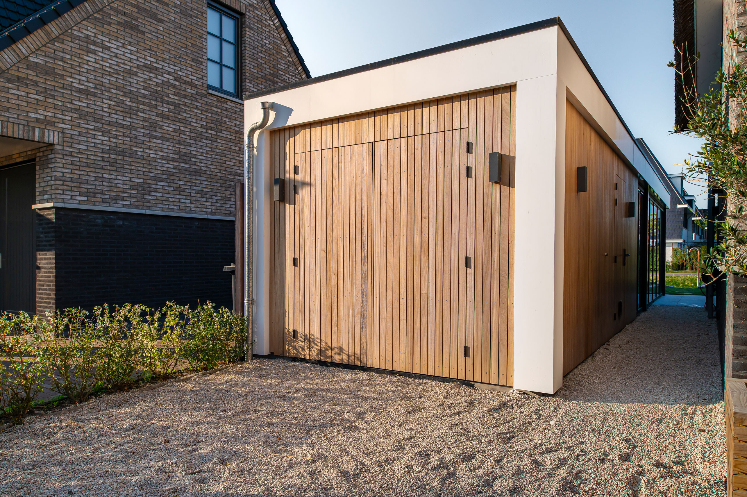 Een berging voelt anders wanneer hij geen apart volume vormt. De deur loopt mee in het lijnenspel van de gevel. De houtstructuur blijft doorlopen en de kleur verandert gelijkmatig mee met het licht. Een berging die zo is weggewerkt verdwijnt niet maar dringt zich ook niet op. Hij is aanwezig zonder het zichtvlak te breken.
