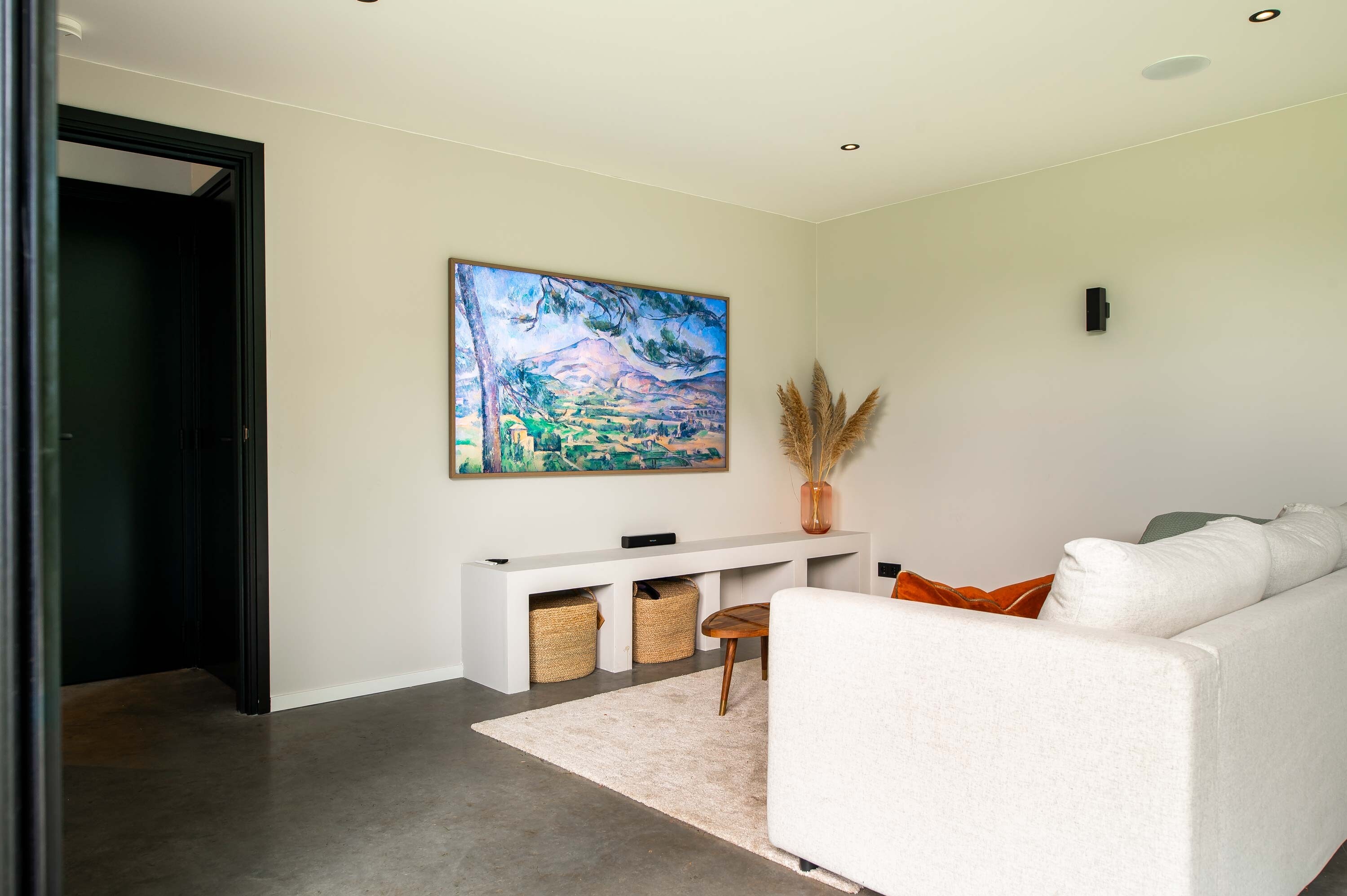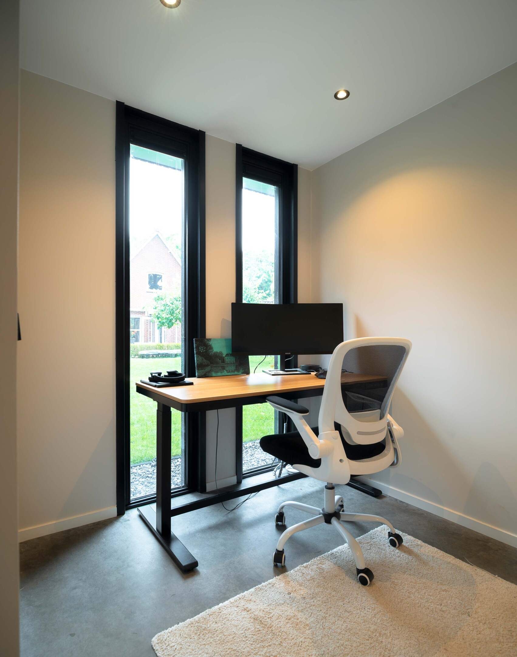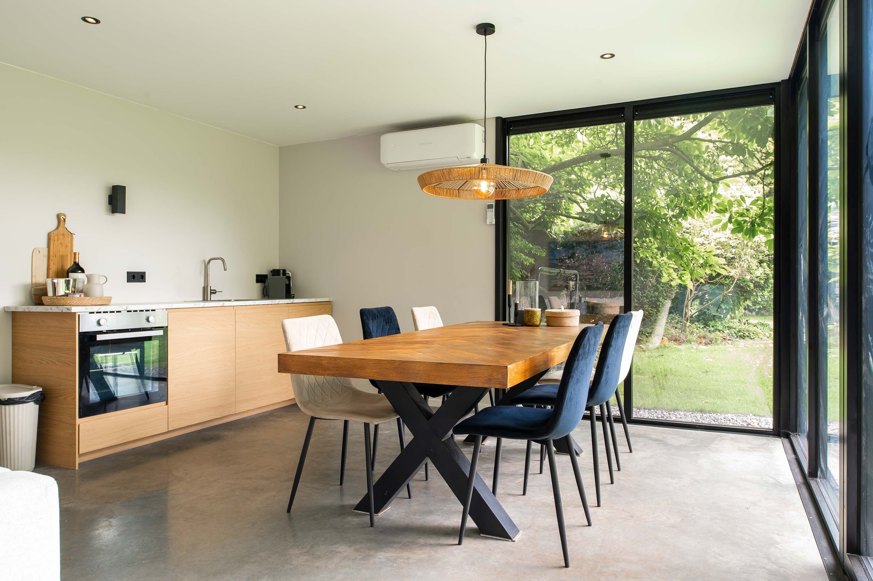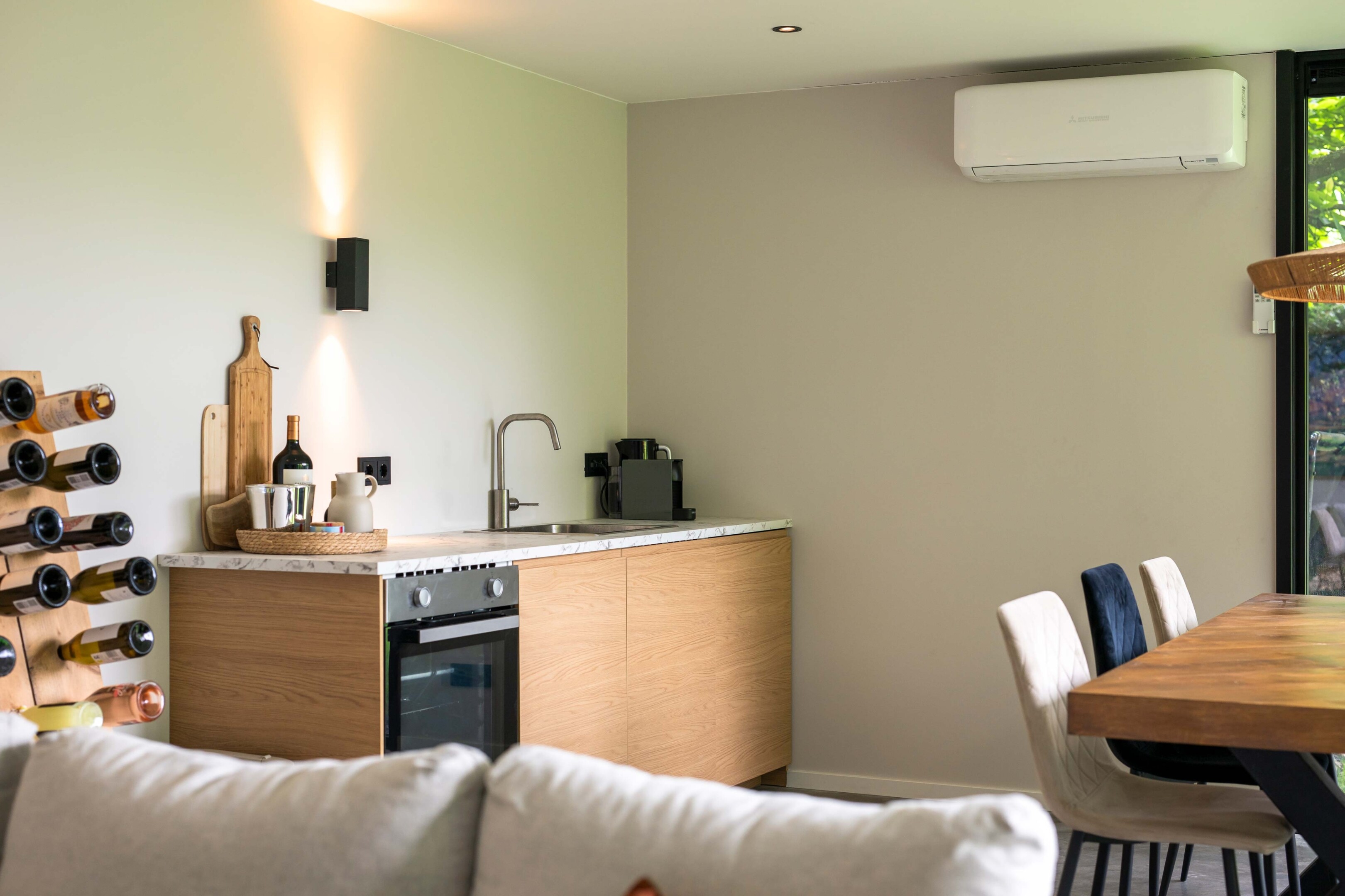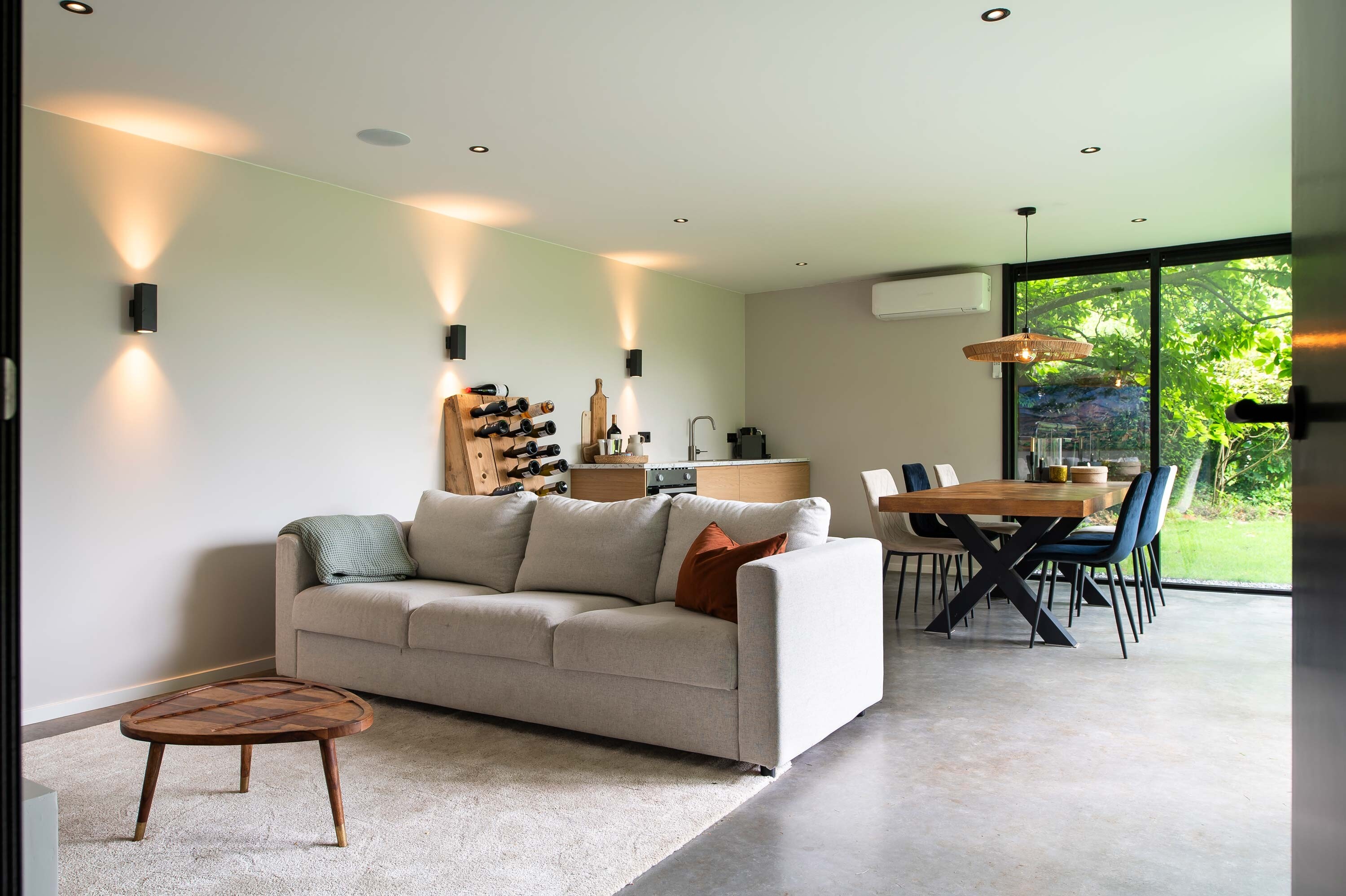 Het bouwwerk is uitgevoerd met aluminium kozijnen, gestucte wanden en plafond, en een sfeervolle betonnen vloer. Voorzieningen zoals een Sonos-geluidsinstallatie, airco met thermostaat en de voorbereiding van een doucheruimte maken de ruimte toekomstbestendig. Ook de volledige aansluiting op de hoofdwoning – inclusief aanpassing van de meterkast – is meegenomen. De onderhoudsvrije gevelafwerking aan de erfgrens garandeert bovendien dat er de komende 25 jaar geen omkijken is naar onderhoud.