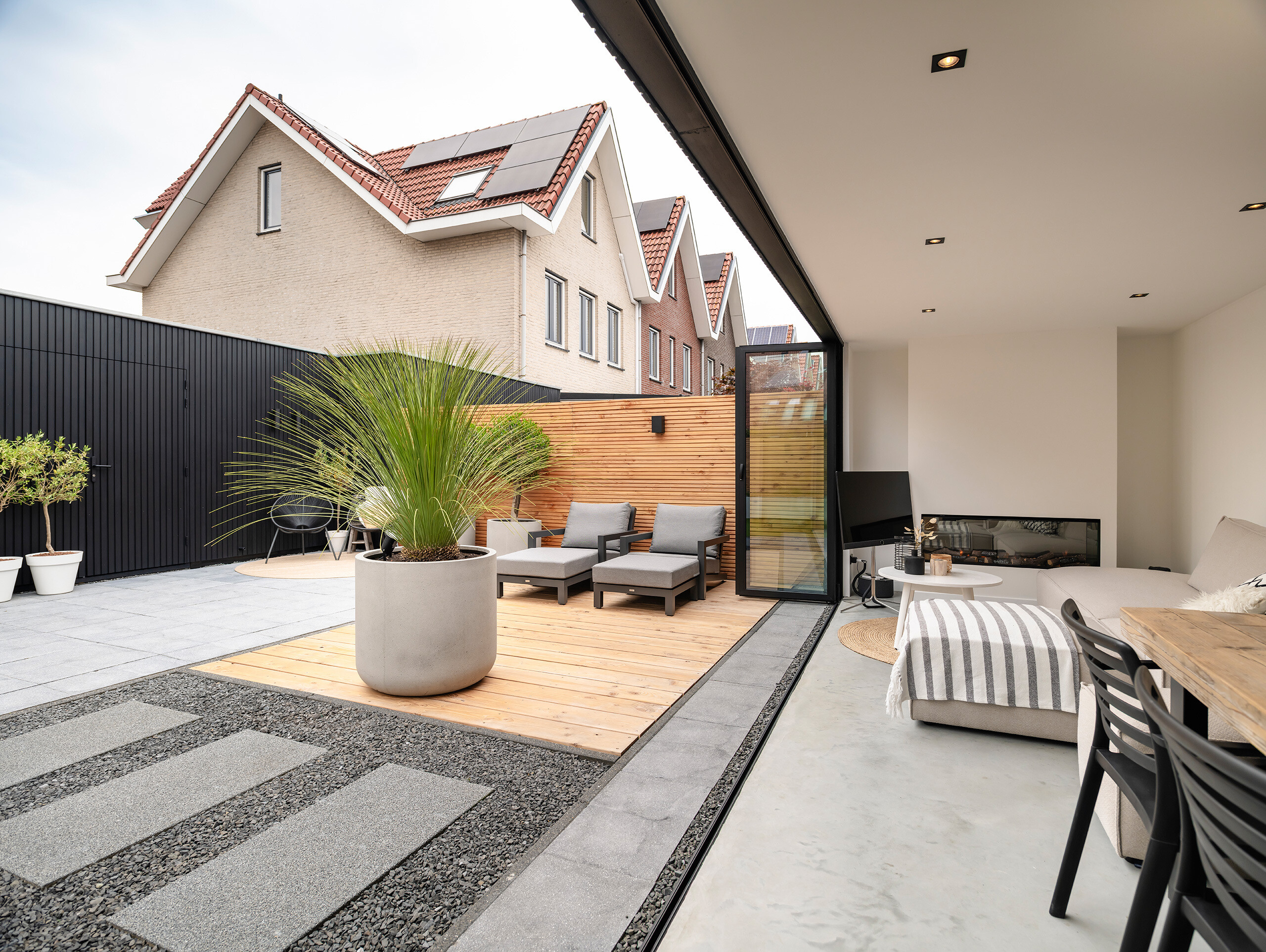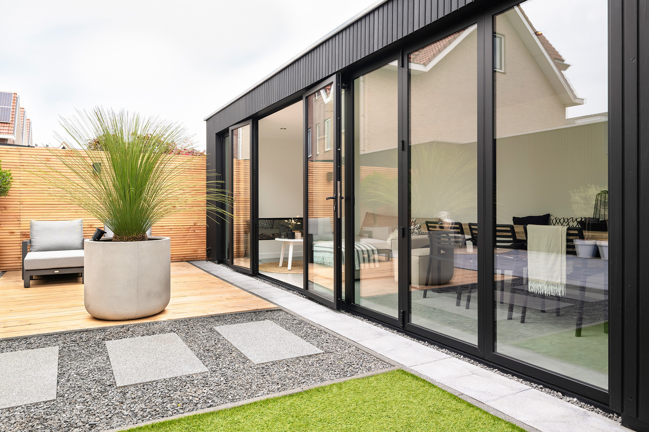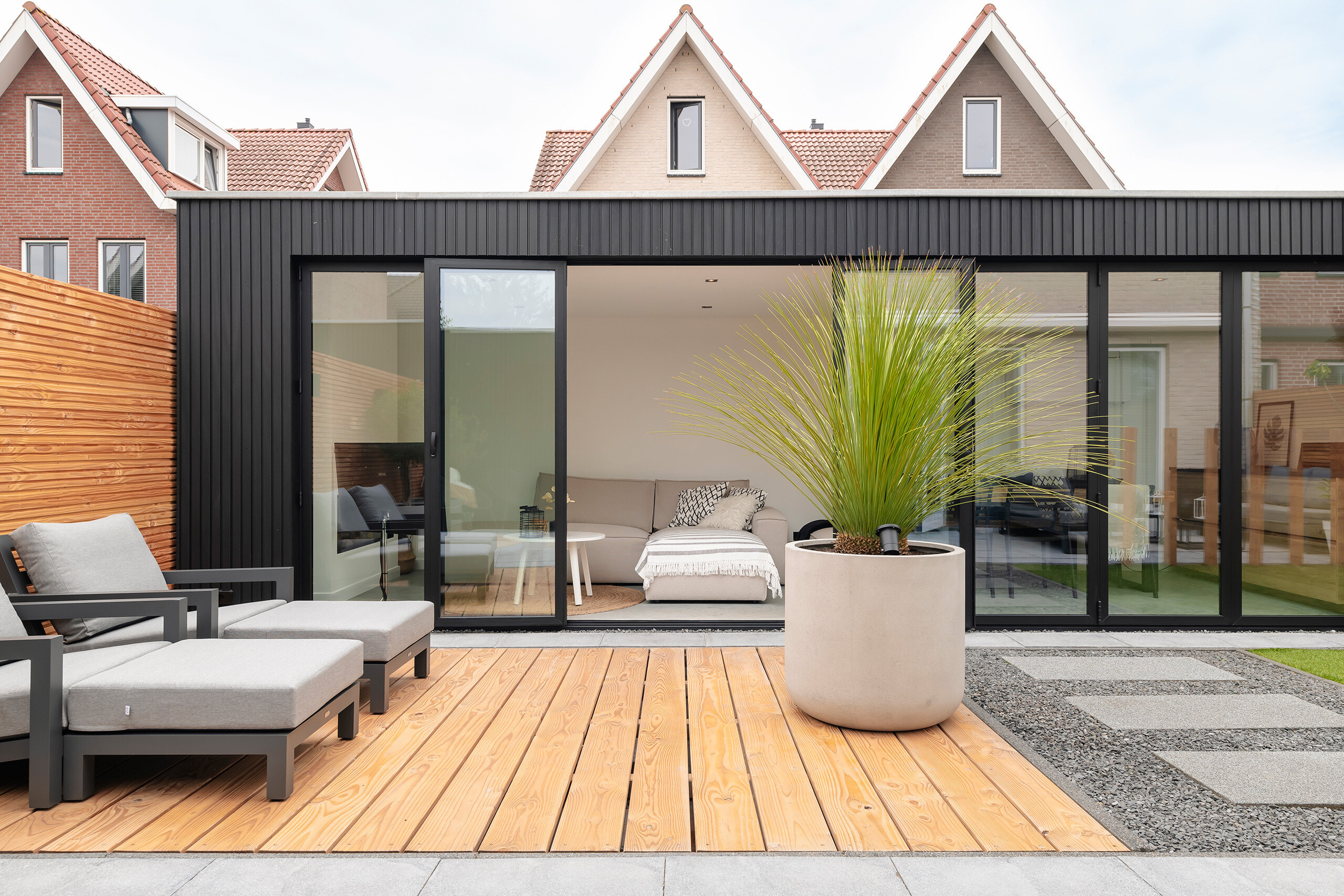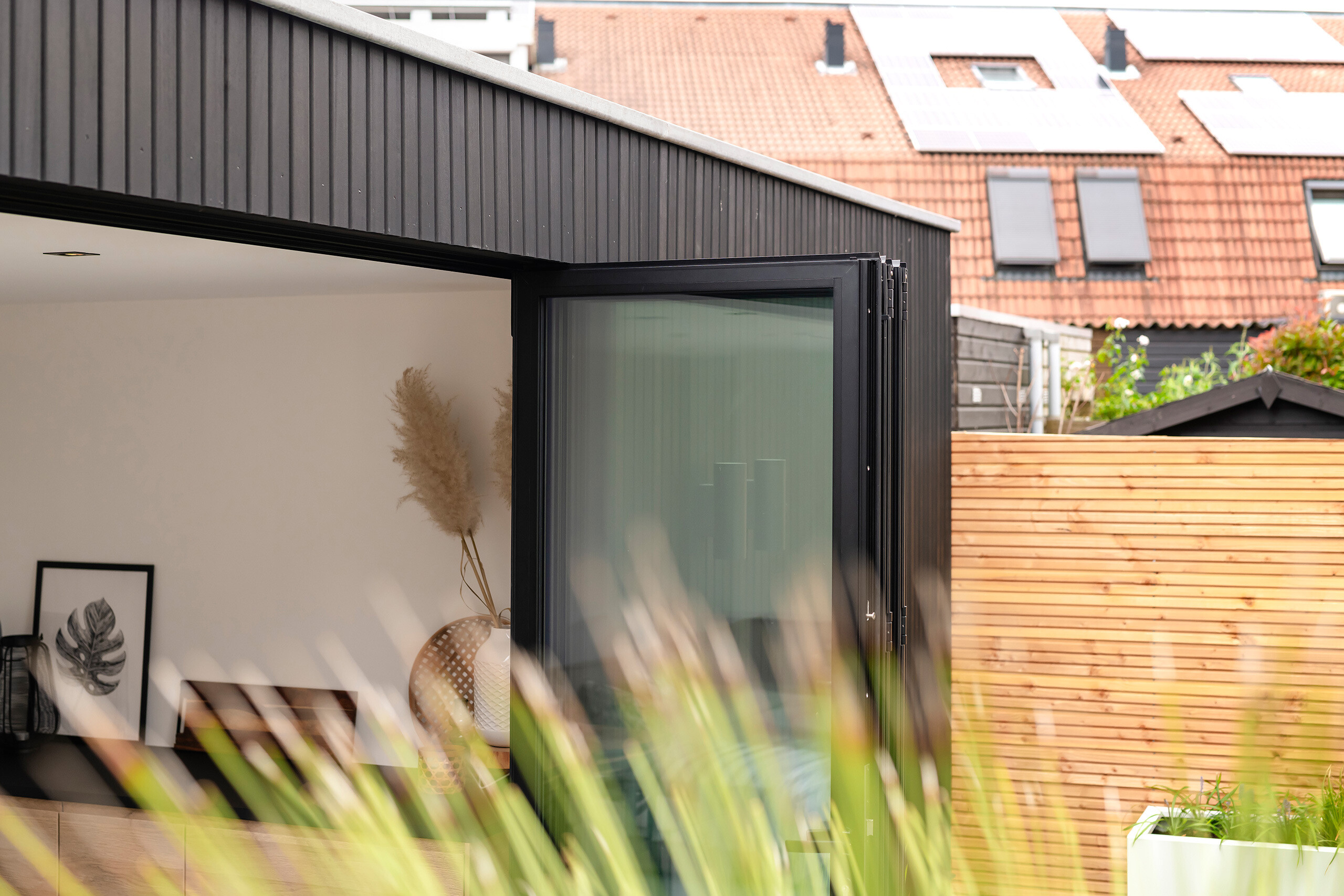 Inmiddels staat er een prachtige tuinkamer in de tuin. "We zitten er bijna elke dag, zelfs in de winter. Onze kinderen zijn al wat ouder, zij zitten hier ook heel graag met vrienden. Thuiswerken kan er ook heerlijk. De tuinkamer is heel ruim en je kan 'm helemaal afsluiten of juist volledig openzetten. Door de positionering hebben we heel veel daglicht in de tuinkamer en in ons huis. De tuinkamer heeft ervoor gezorgd dat onze tuin in het geheel echt een eenheid is geworden."