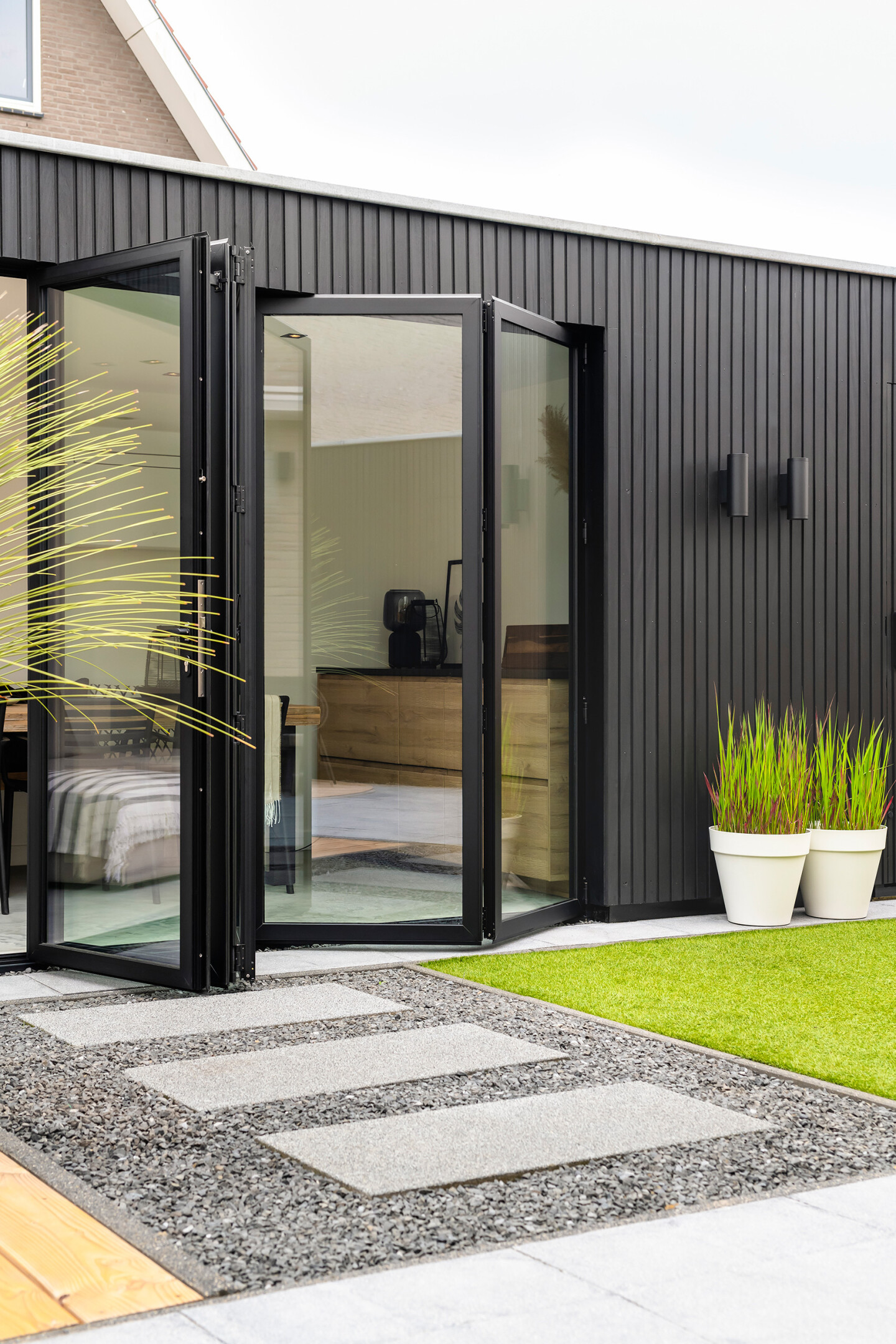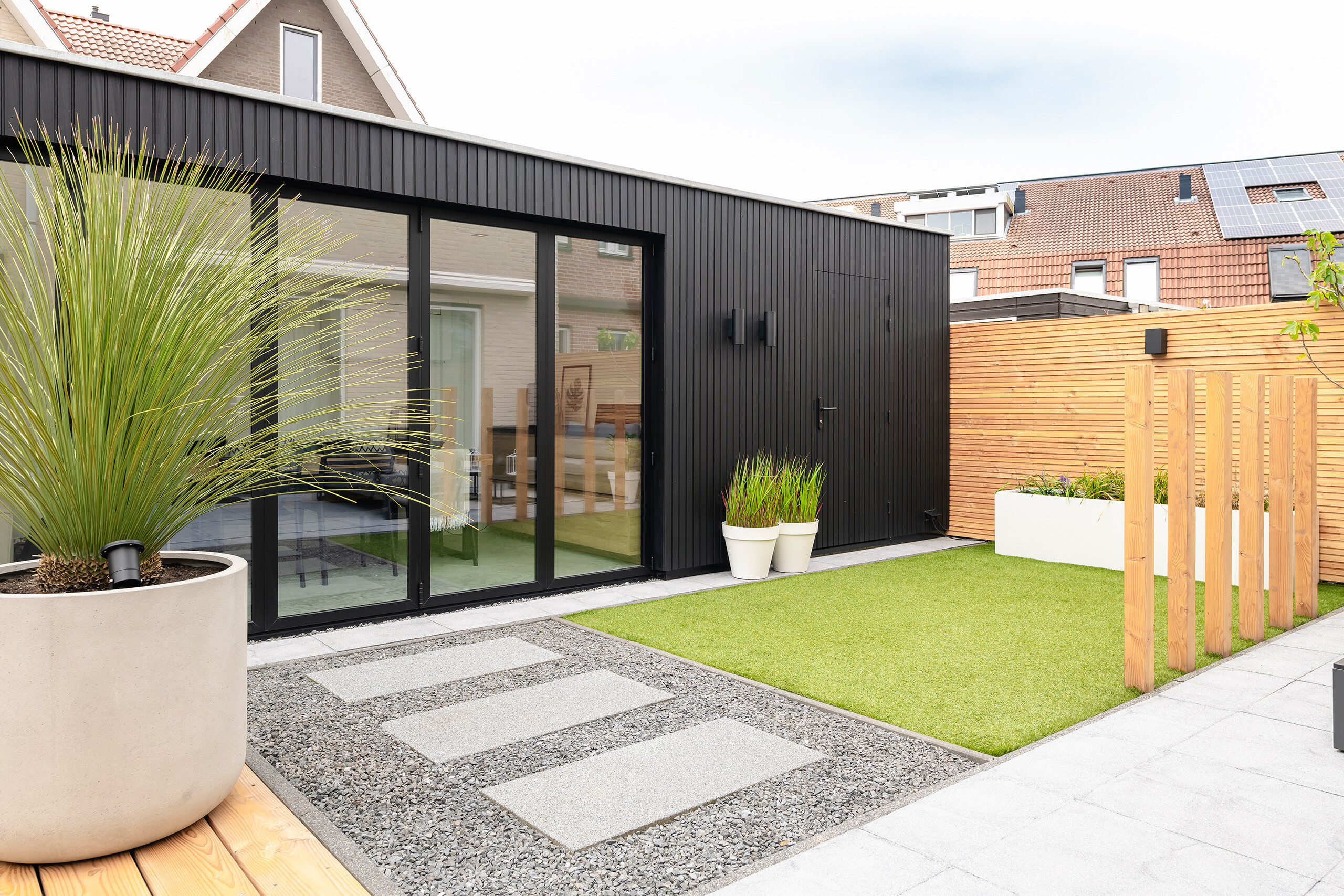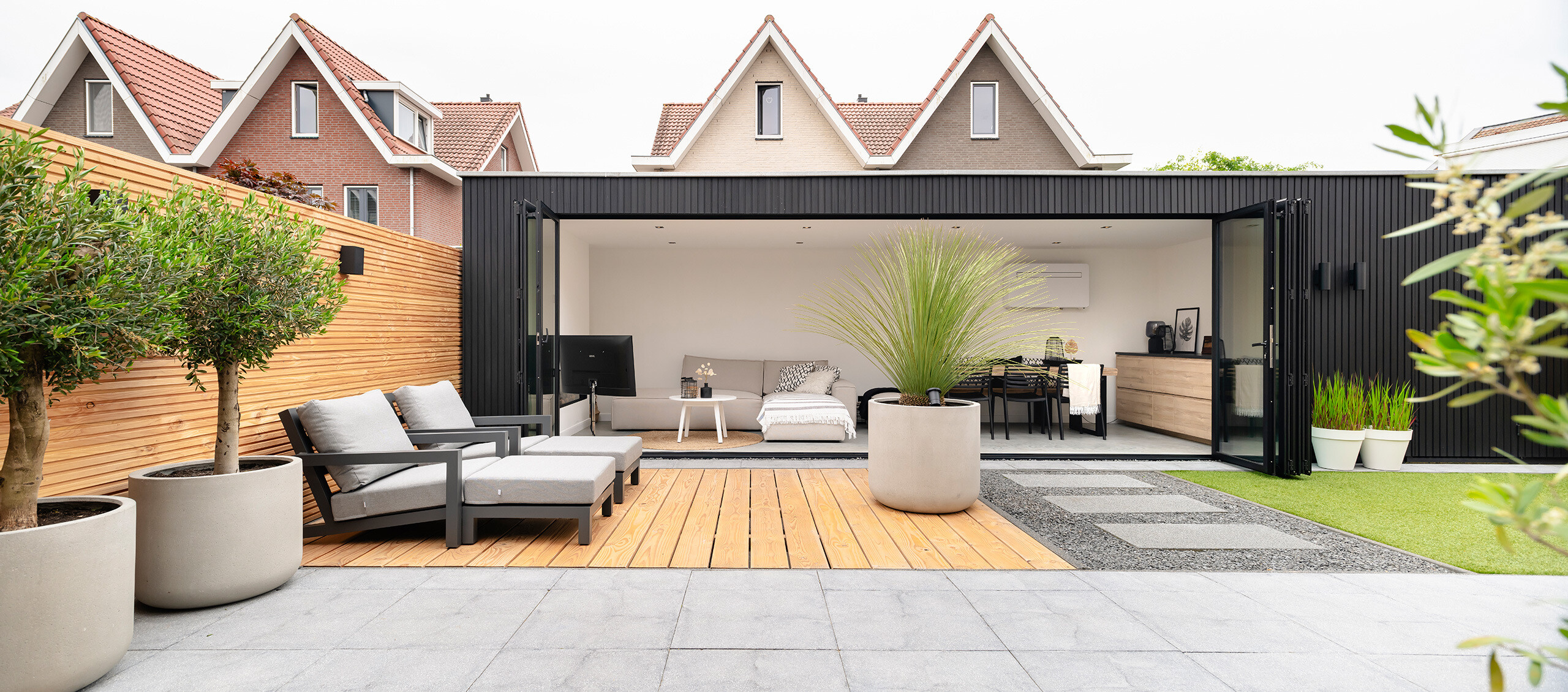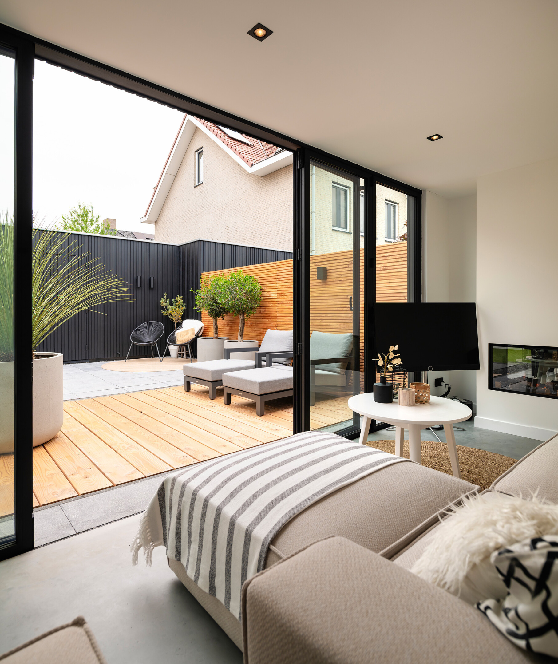 Inmiddels staat er een prachtige tuinkamer in de tuin. "We zitten er bijna elke dag, zelfs in de winter. Onze kinderen zijn al wat ouder, zij zitten hier ook heel graag met vrienden. Thuiswerken kan er ook heerlijk. De tuinkamer is heel ruim en je kan 'm helemaal afsluiten of juist volledig openzetten. Door de positionering hebben we heel veel daglicht in de tuinkamer en in ons huis. De tuinkamer heeft ervoor gezorgd dat onze tuin in het geheel echt een eenheid is geworden."