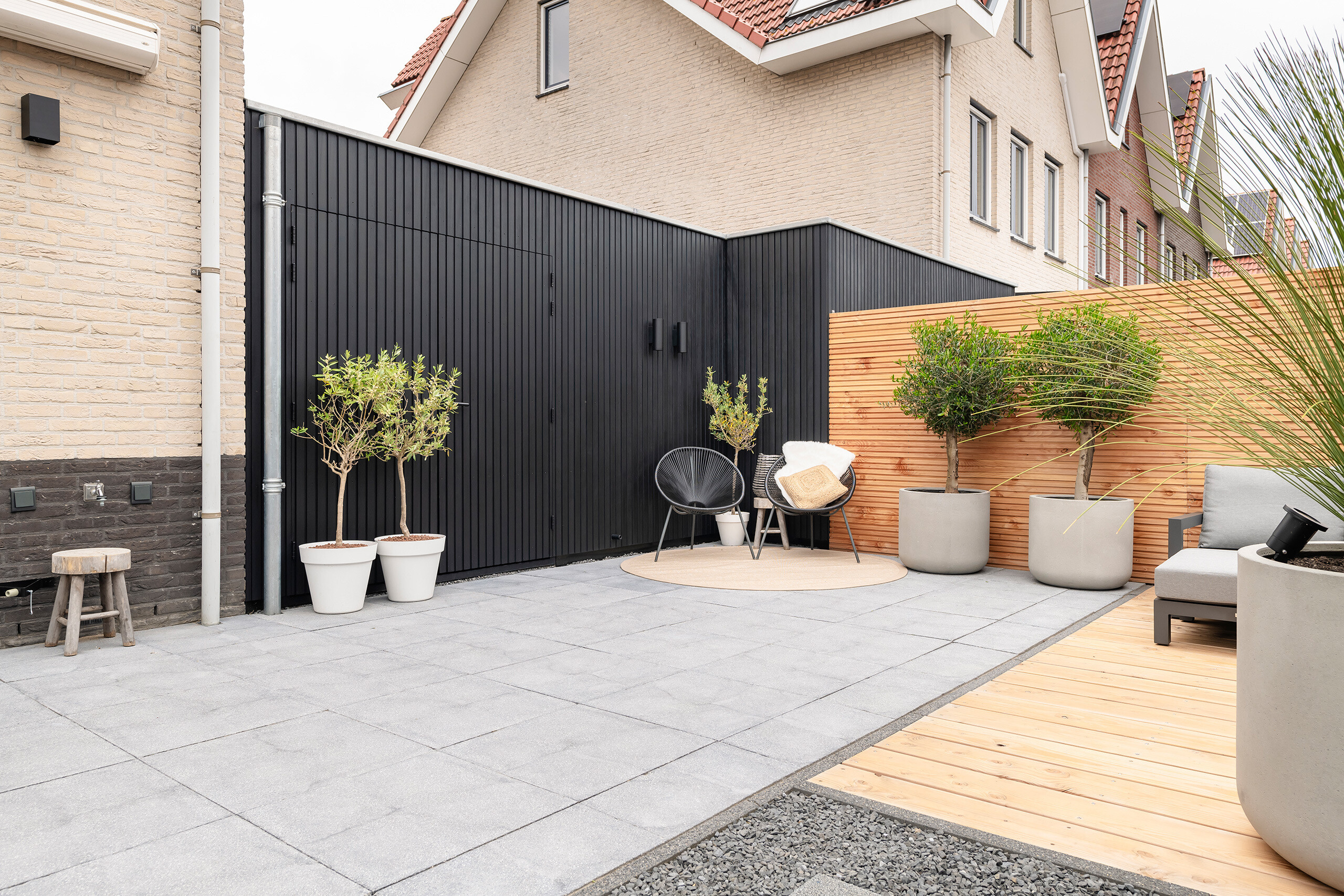 In 2009 had deze klant zelf al een overkapping met een tuinschuurtje gebouwd. "Die hebben we helemaal zelf gebouwd, voor die tijd best vooruitstrevend. Vorig jaar stonden we voor een keuze. Er kwam een stukje grond beschikbaar, we konden daar nieuw bouwen. Uiteindelijk hebben we de knoop doorgehakt en besloten om toch hier te blijven wonen. Onze kinderen hebben het hier heel fijn. We hebben toen besloten om de tuin flink aan te pakken en een heel gave tuinkamer te realiseren met inpandige berging."