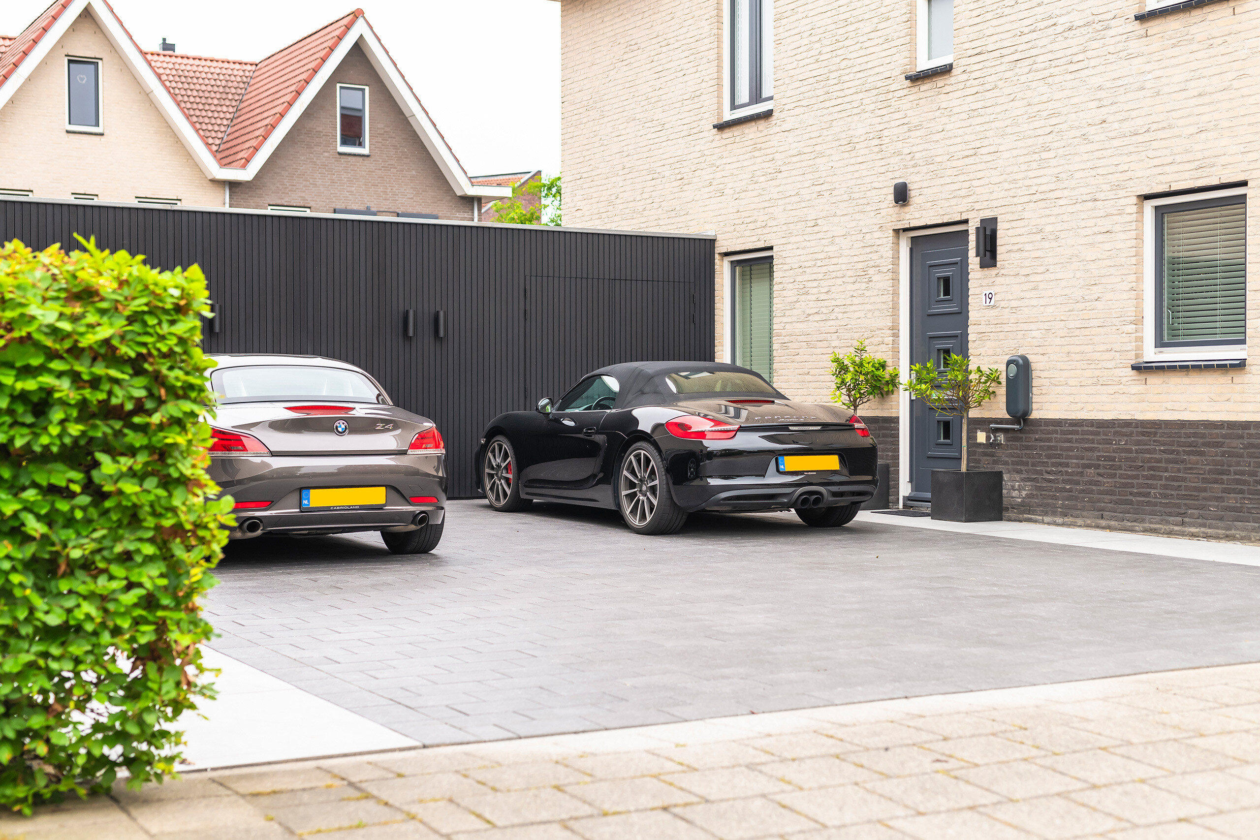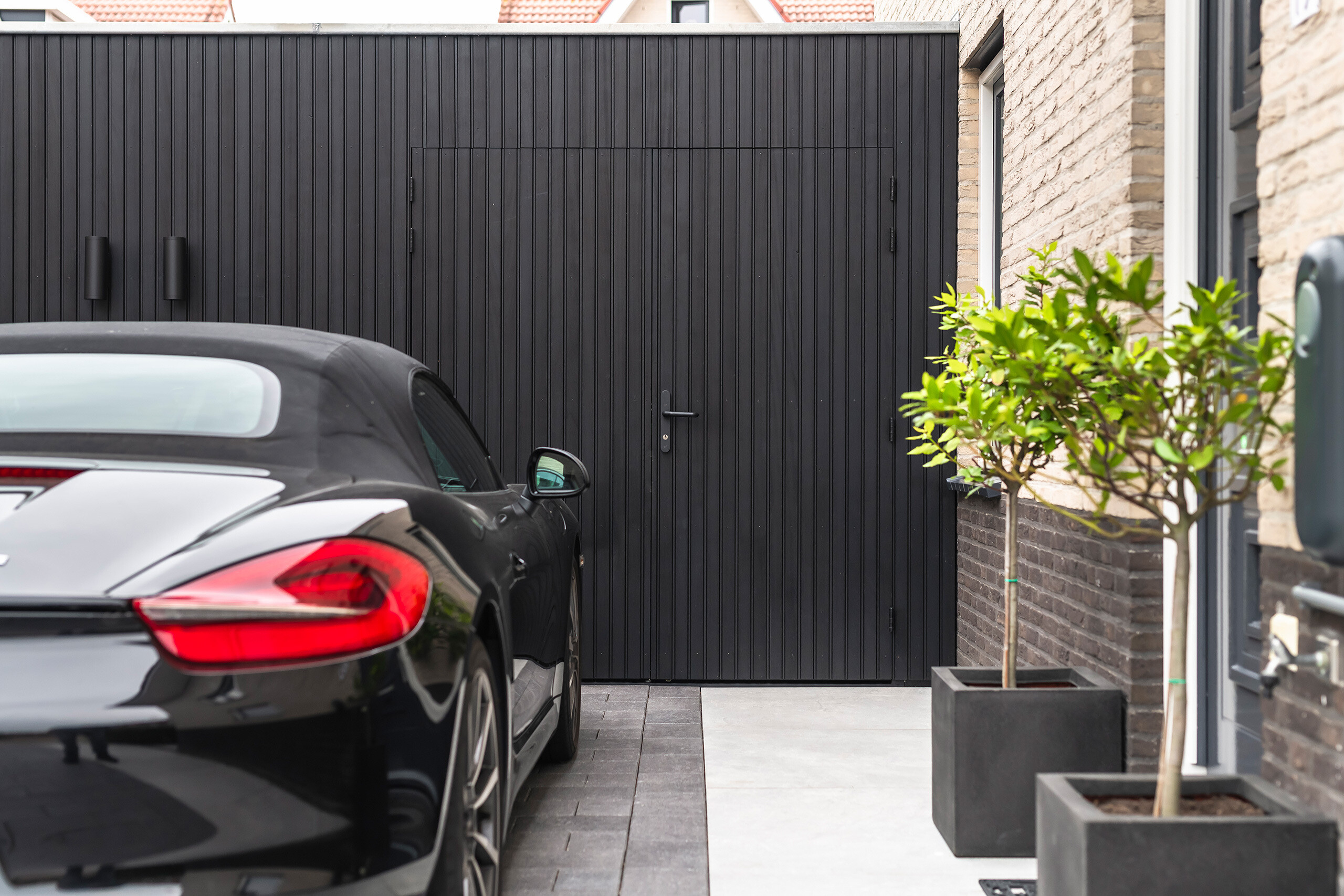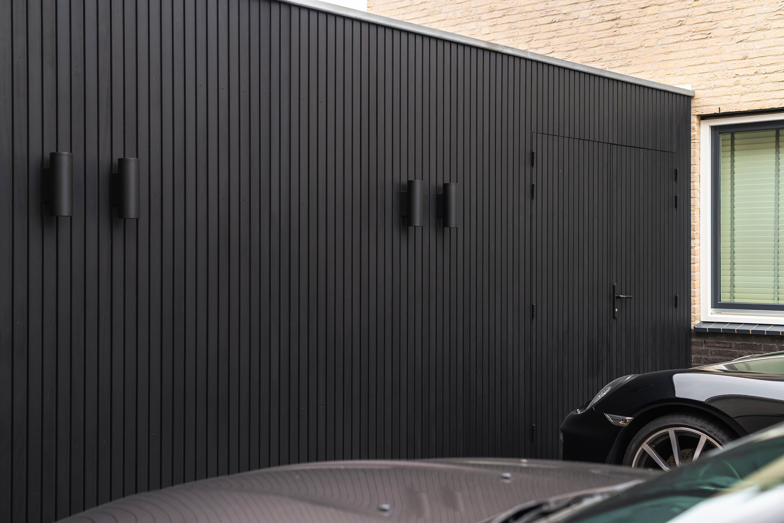 Samen met de buren heeft deze klant een hele strakke schuur/berging gerealiseerd tussen de twee huizen. "Dat geeft een hele mooie uitstraling, zo strak zie je het niet vaak."