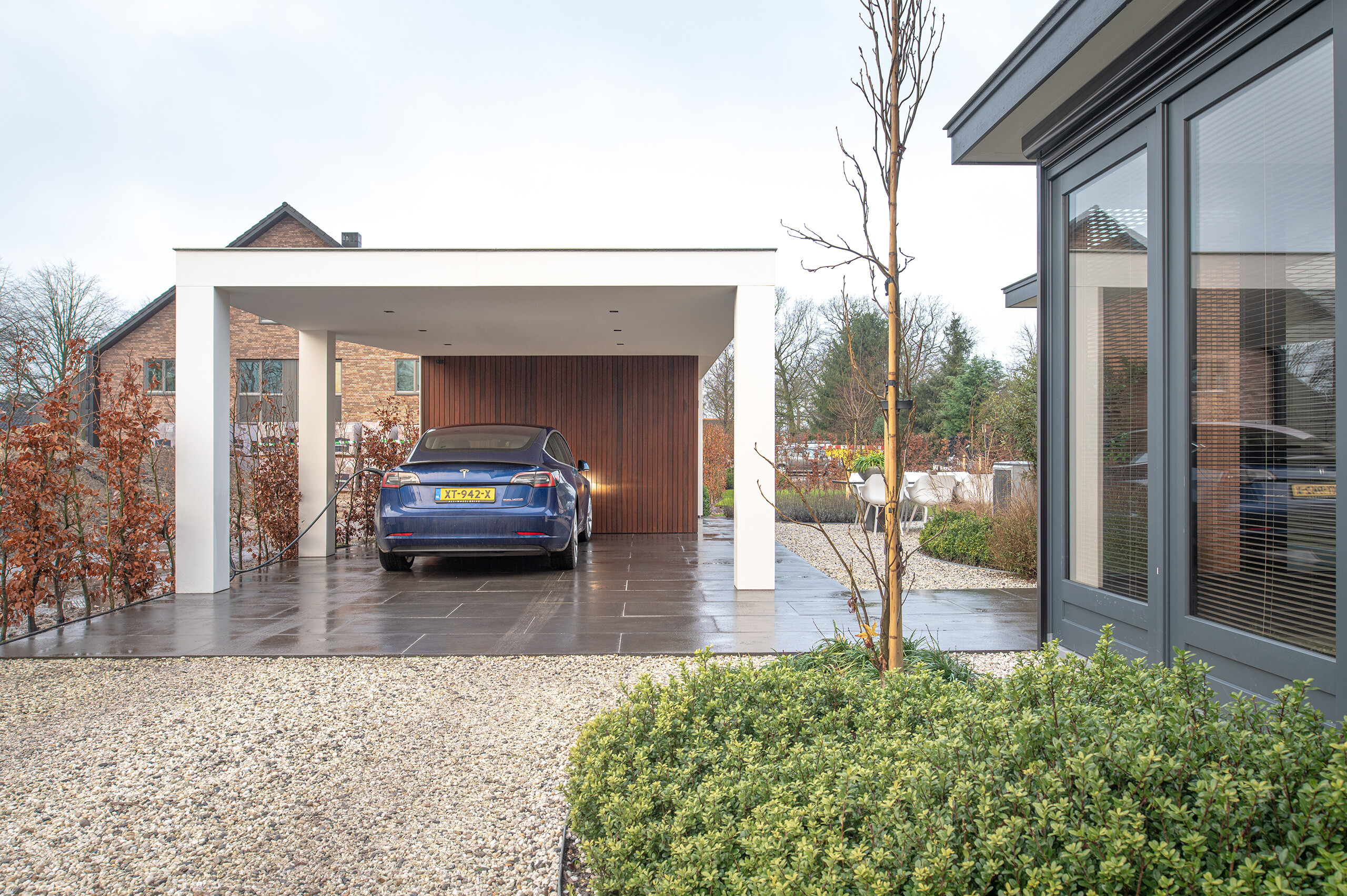 Naast bescherming voor je auto biedt de carport ook een handige berging, perfect voor het opbergen van tuingereedschap, fietsen of andere benodigdheden. De slimme integratie van een laadmogelijkheid voor een Tesla Model 3 aan de linkerzijde maakt dit ontwerp niet alleen modern, maar ook toekomstgericht. De laadpaal is subtiel weggewerkt, zodat de carport zijn strakke en opgeruimde uitstraling behoudt.