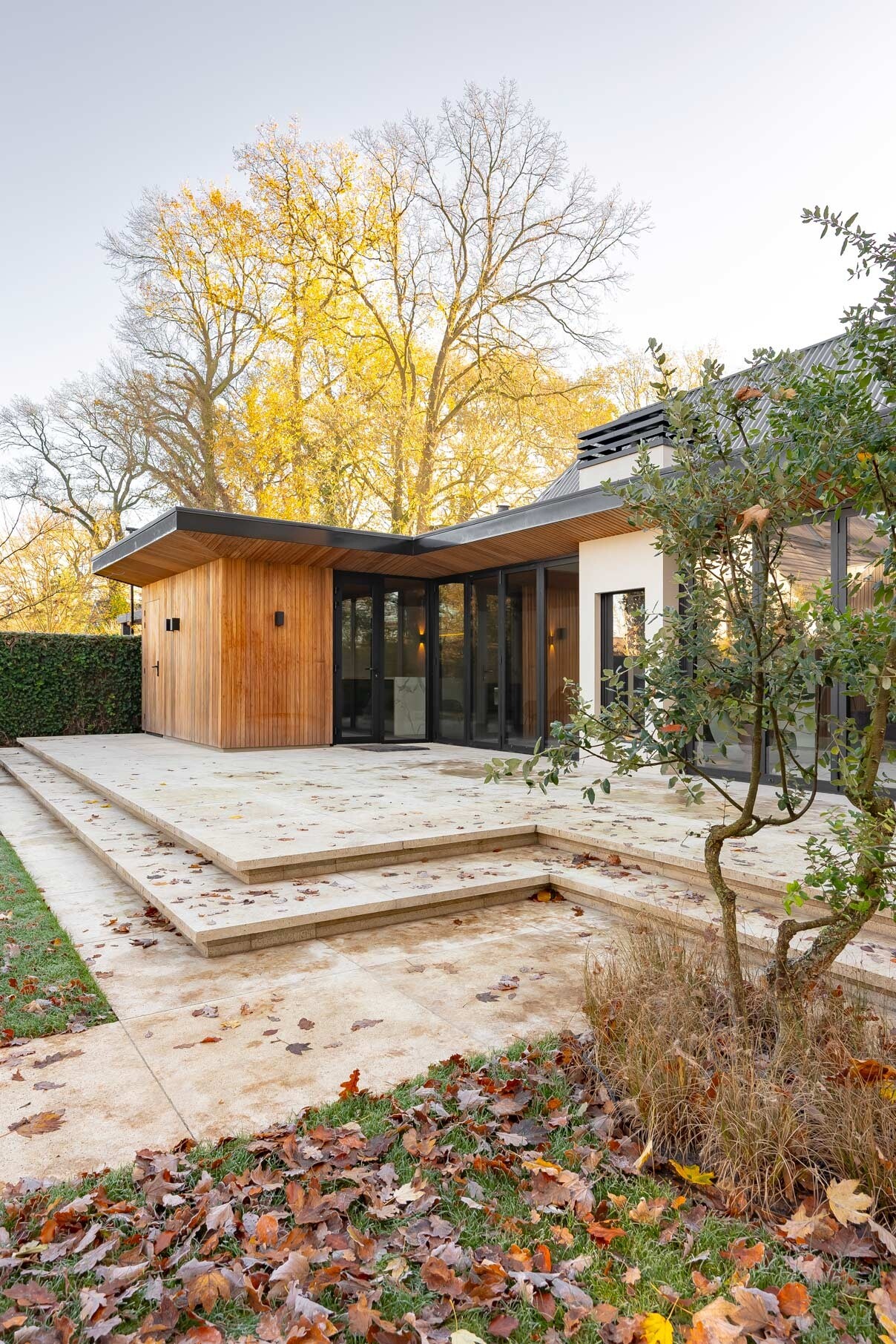 In Nunspeet realiseerden we dit exclusieve buitenverblijf dat allure ademt. Ontworpen in een stijlvolle 'Hotel Chic' sfeer, biedt dit paviljoen het ultieme comfort van een luxe suite, maar dan midden in de tuin. Door de positionering op een verhoogd plateau ontstaan prachtige zichtlijnen over het perceel.
