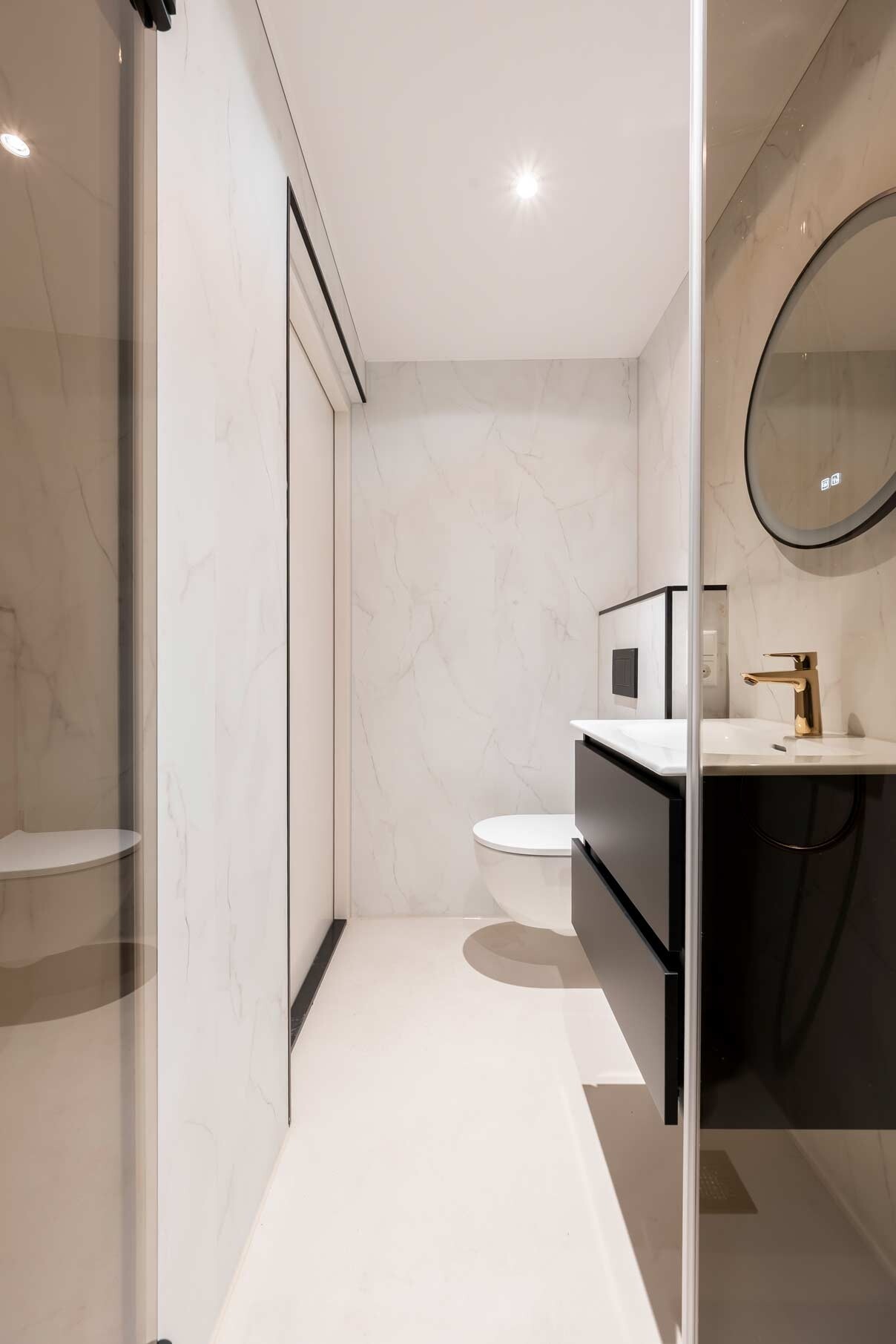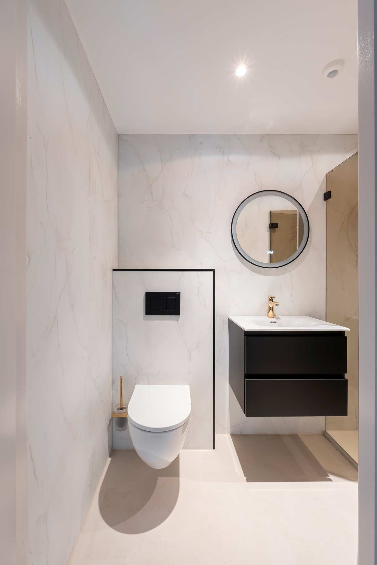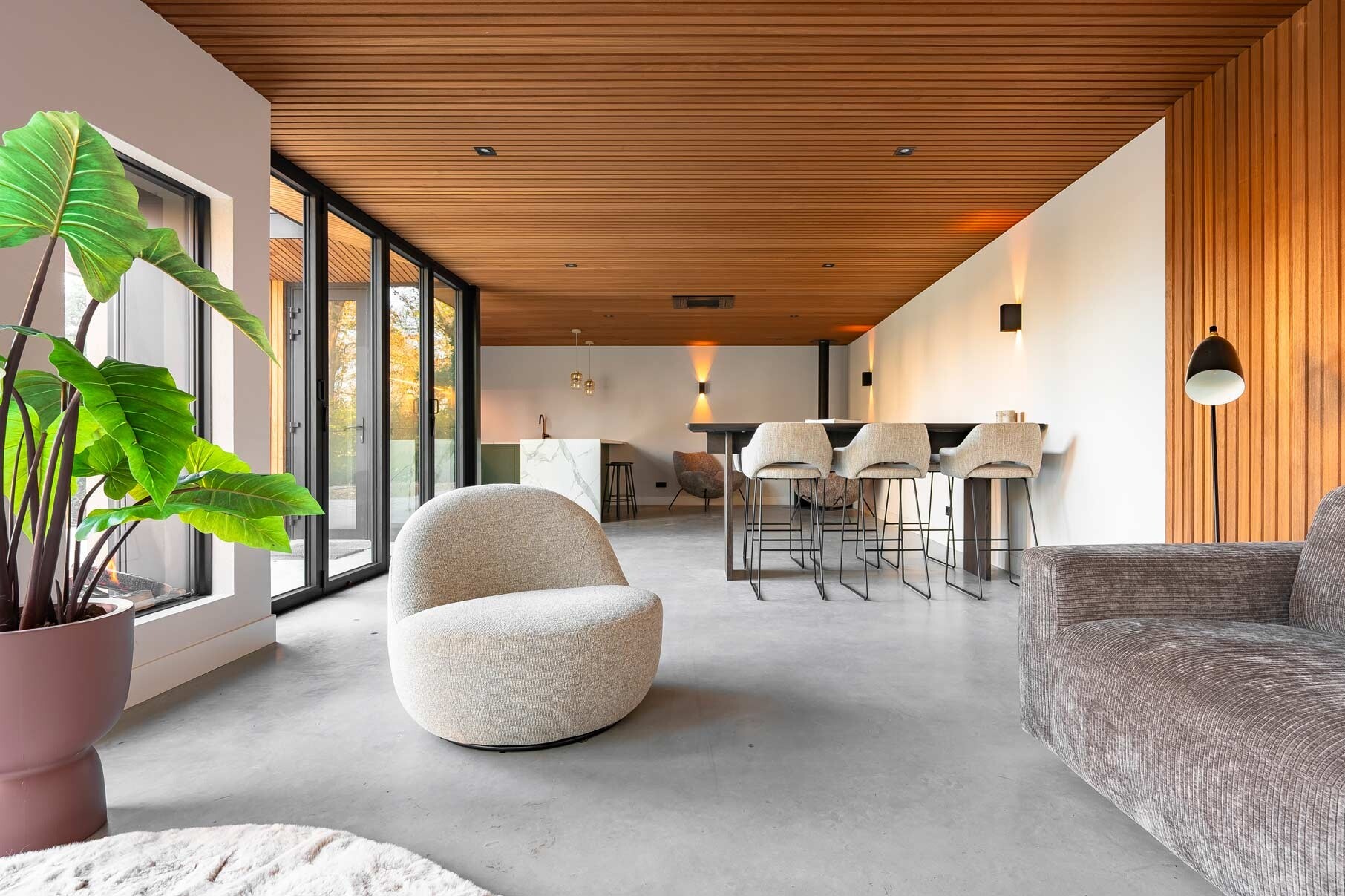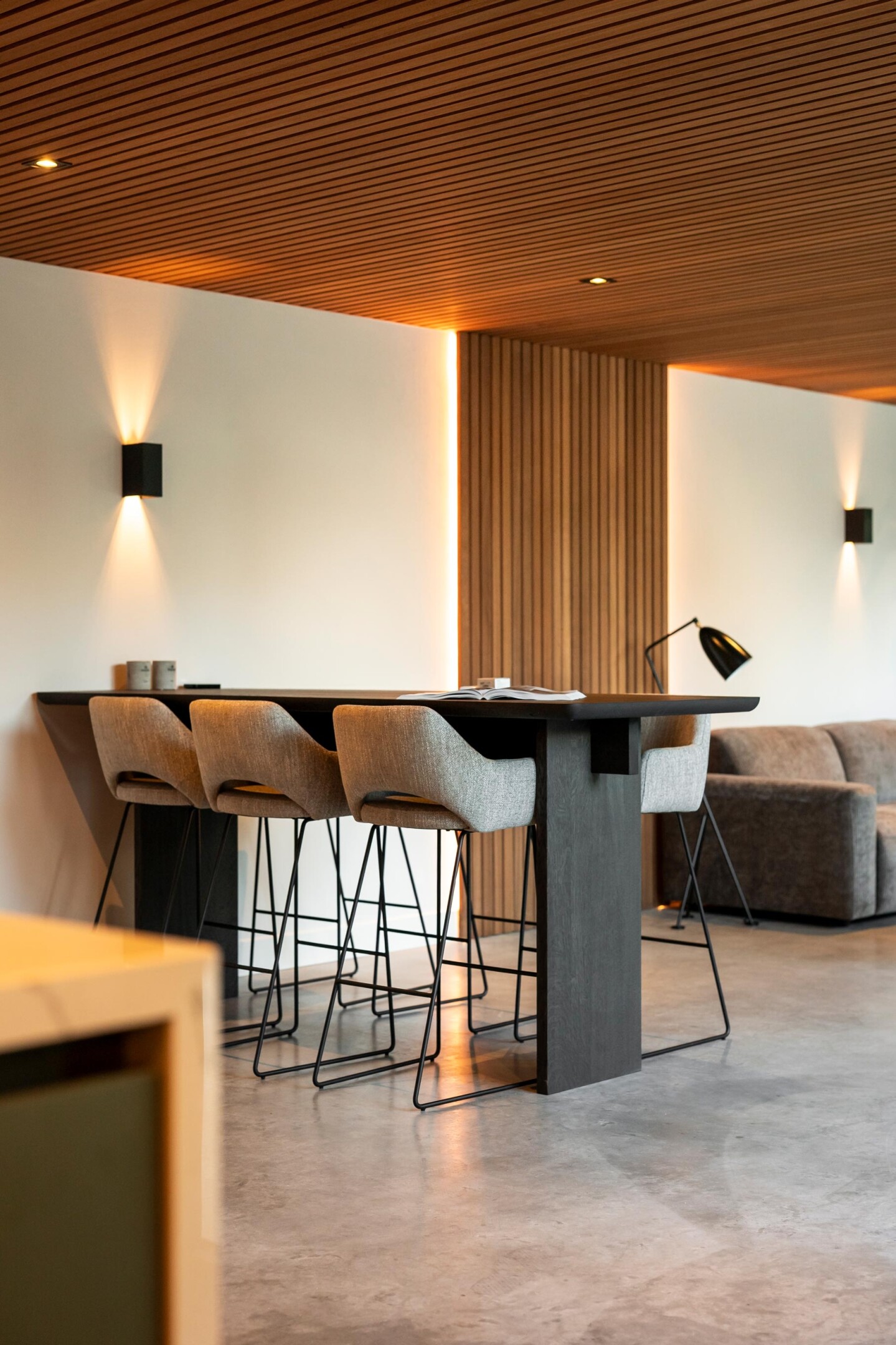 Het interieur is ontworpen voor ultiem genot en gastvrijheid. De luxe hoekkeuken met bar nodigt uit tot gezelligheid en is van alle gemakken voorzien, waaronder een vaatwasser, kookplaat en wijnkoeler. Ook op sanitair gebied is niet bespaard: een stijlvol afgewerkte badkamer met inloopdouche, toilet en badmeubel maakt het mogelijk om hier volledig te ontspannen. Alle facilitaire techniek, zoals de warmwaterboiler en meterkast, is discreet weggewerkt in een aparte technische ruimte, zodat de focus in de leefruimte volledig op het design blijft liggen.