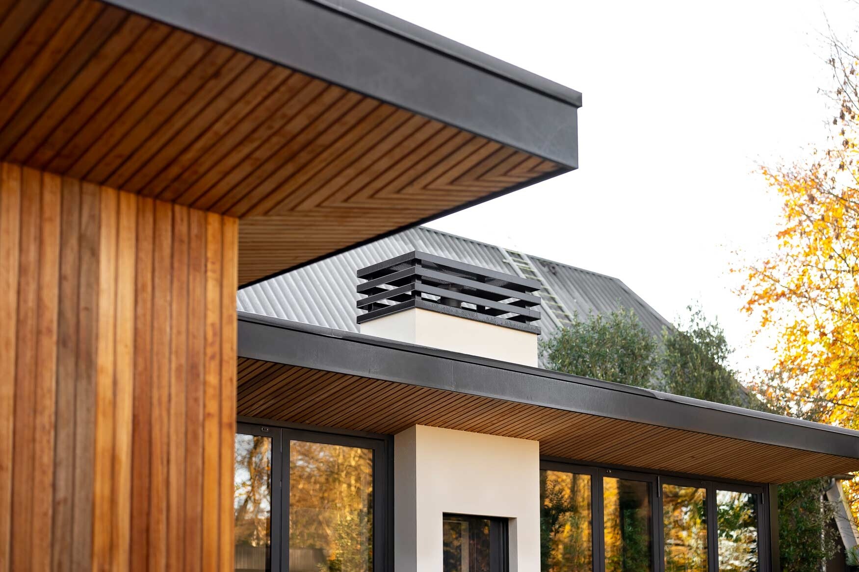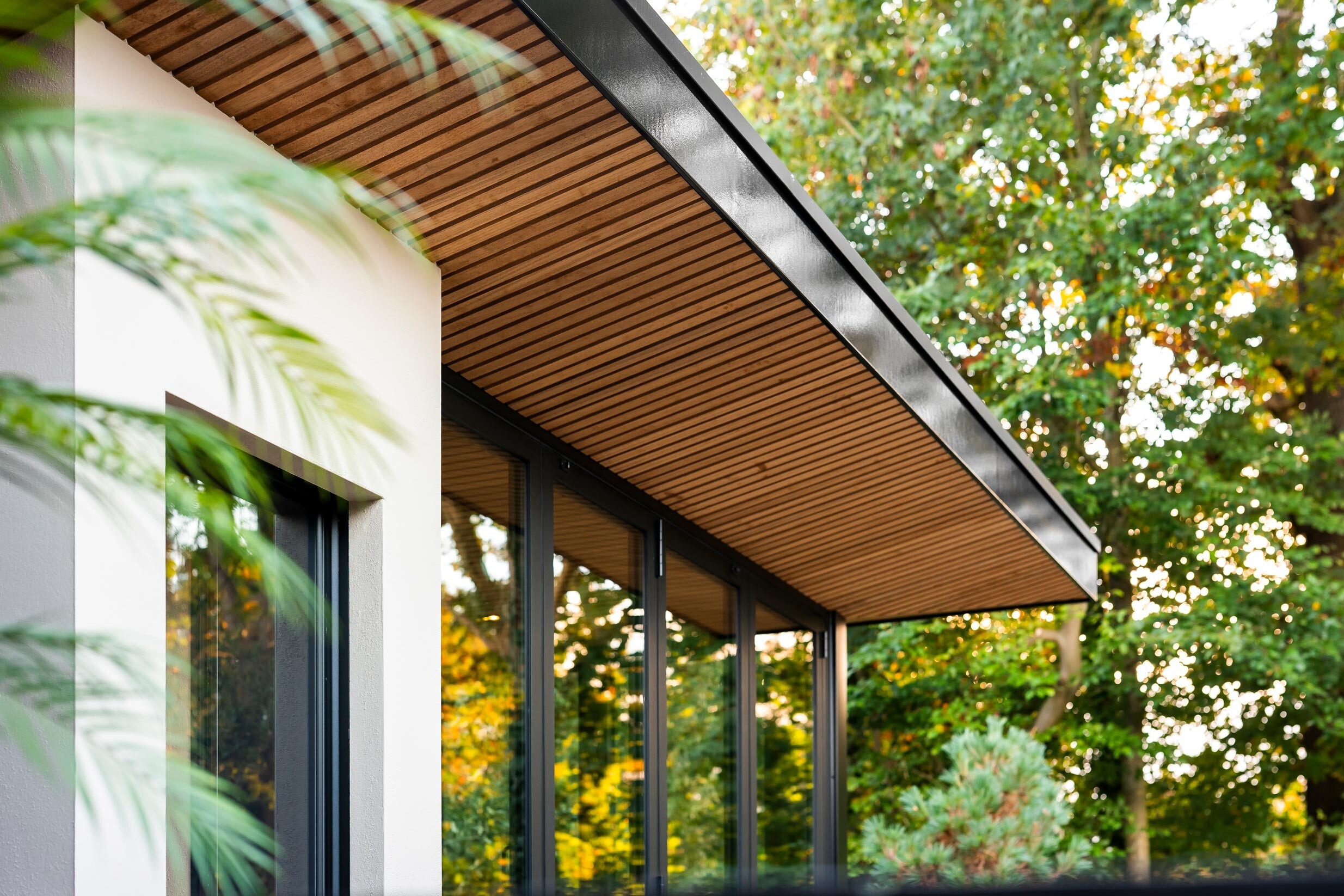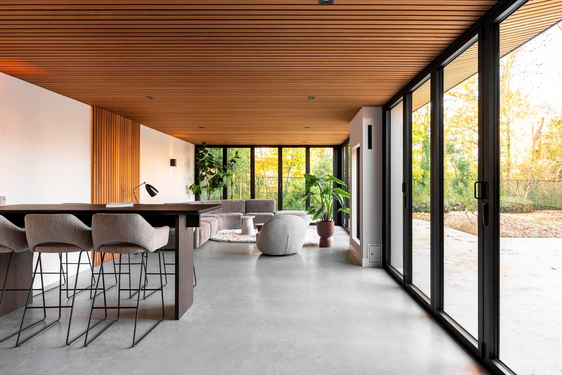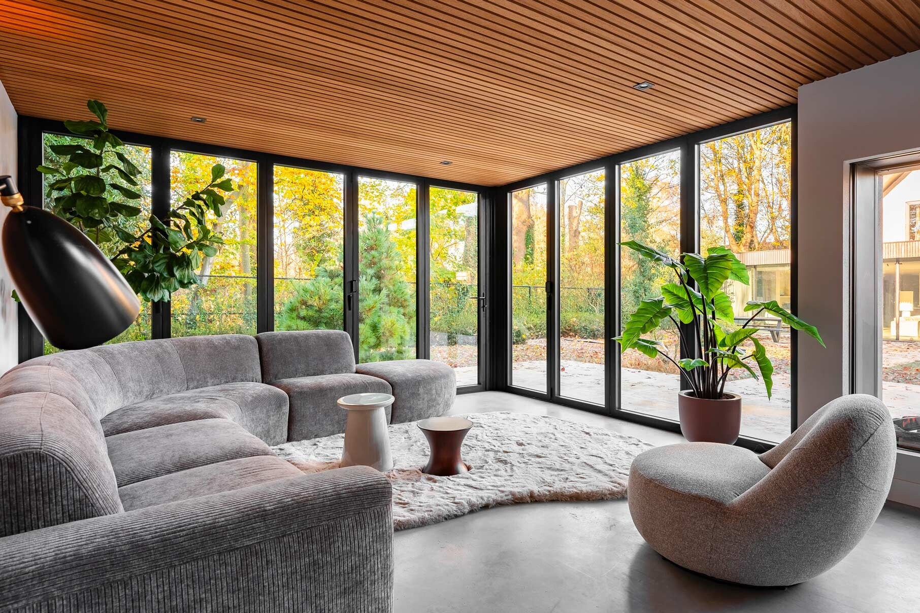 De basis van dit project is een staaltje bouwkundig vakmanschap. Het paviljoen is gebouwd op een verhoogde, geïsoleerde betonfundering. Deze bewuste keuze creëert niet alleen een speels niveauverschil in de tuin, maar zorgt ook voor een statige uitstraling. De thermische schil is van woonhuiskwaliteit: zowel de vaste wanden als de flexibele vouwwanden zijn hoogwaardig geïsoleerd. Het plafond van thermohout loopt naadloos door naar buiten in een minimalistisch, schuin weglopend overstek. Dit versterkt de verbinding tussen binnen en buiten en geeft het geheel een moderne, strakke belijning.