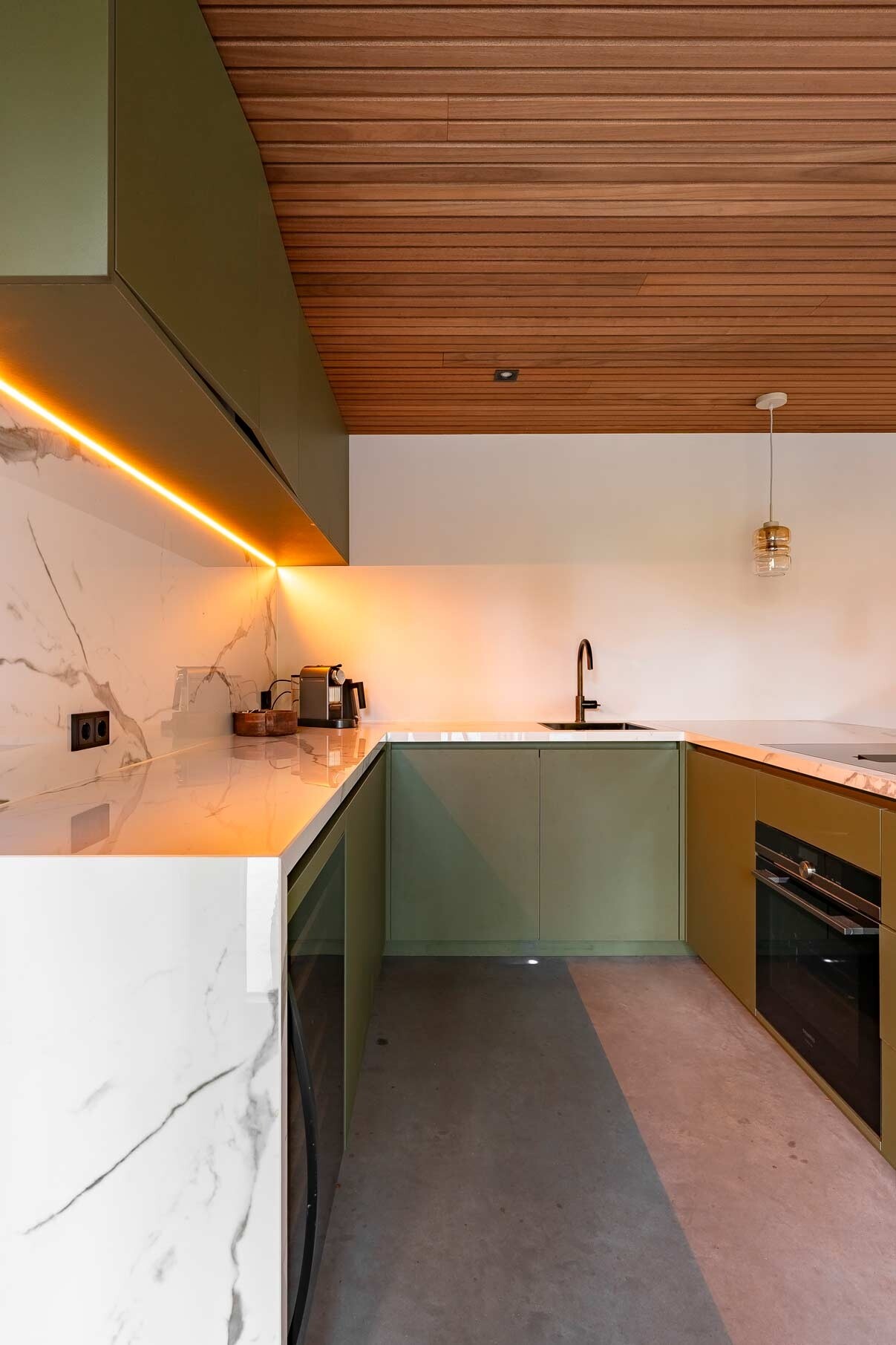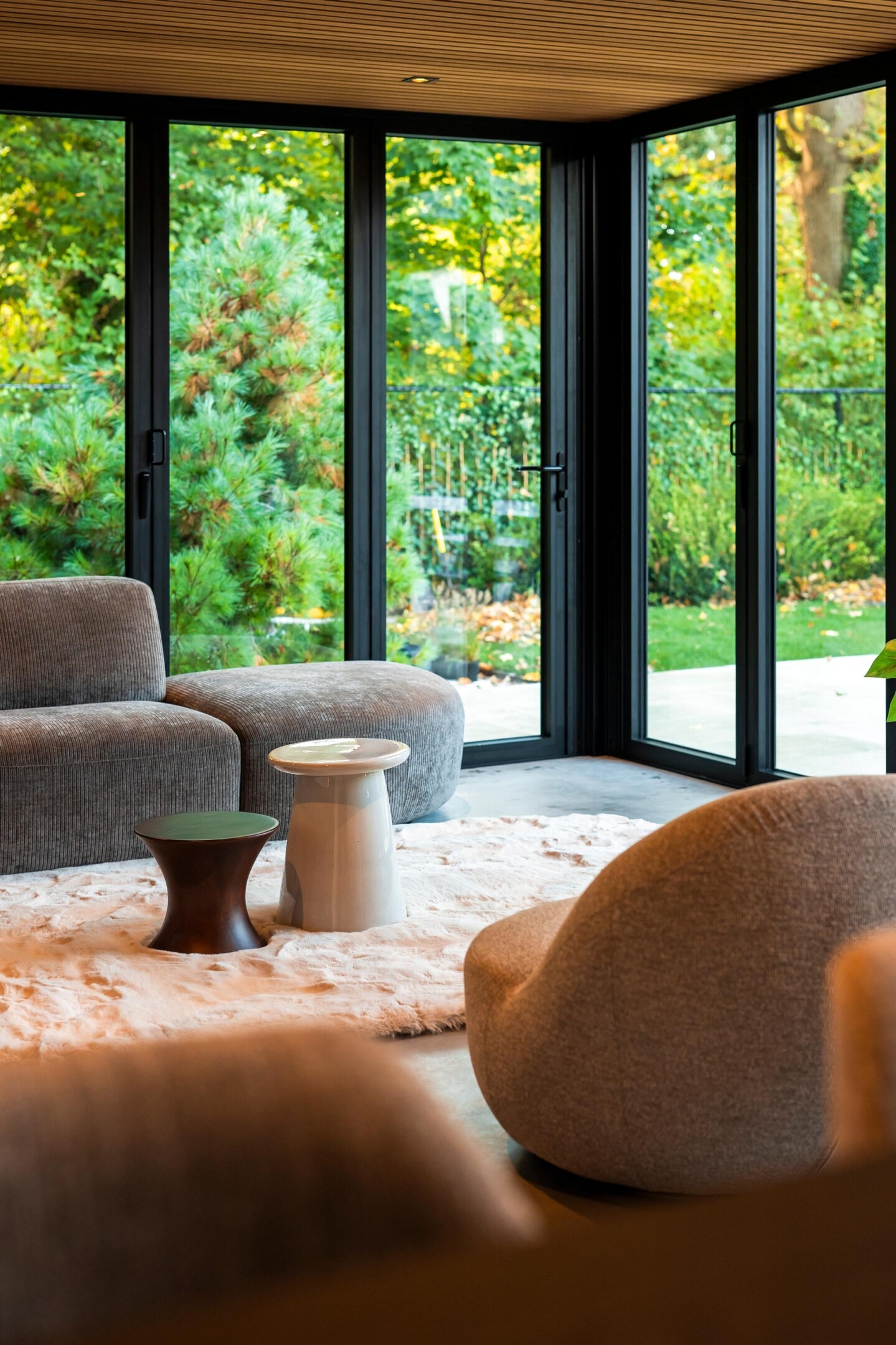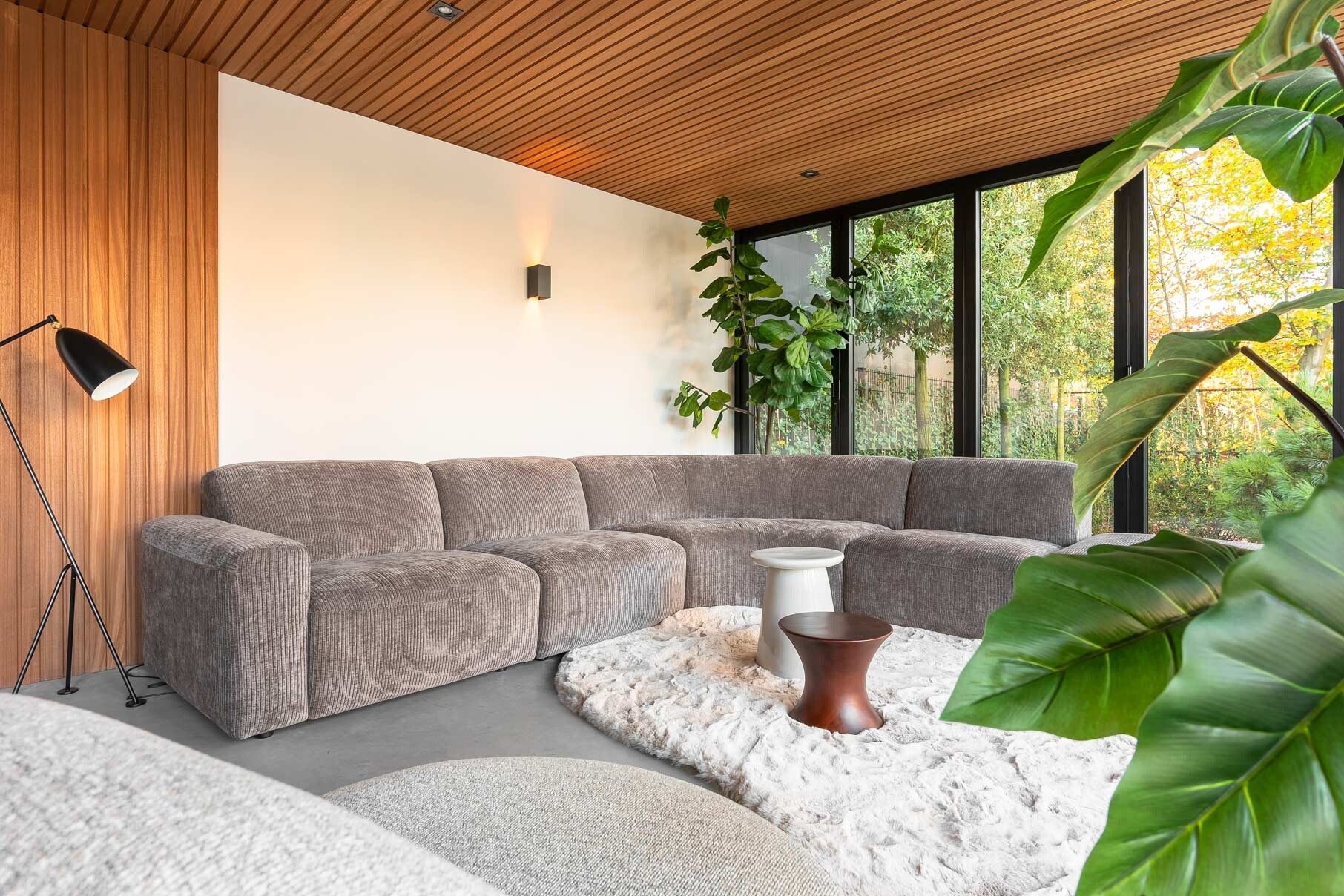 De afwerking maakt het plaatje compleet. De wanden zijn voorzien van strak stucwerk, wat zorgt voor een rustige en lichte basis. Centraal in de ruimte bevindt zich een decoratieve wand met geïntegreerde design ledverlichting, die direct de aandacht trekt en sfeer brengt. Het lichtplan is zorgvuldig uitgedacht met diverse wandspots die zowel binnen als buiten terugkomen. Zodra de avond valt, transformeert dit tuinpaviljoen in een sfeervol verlicht decor waar het leven 'buiten' net zo comfortabel is als binnen.