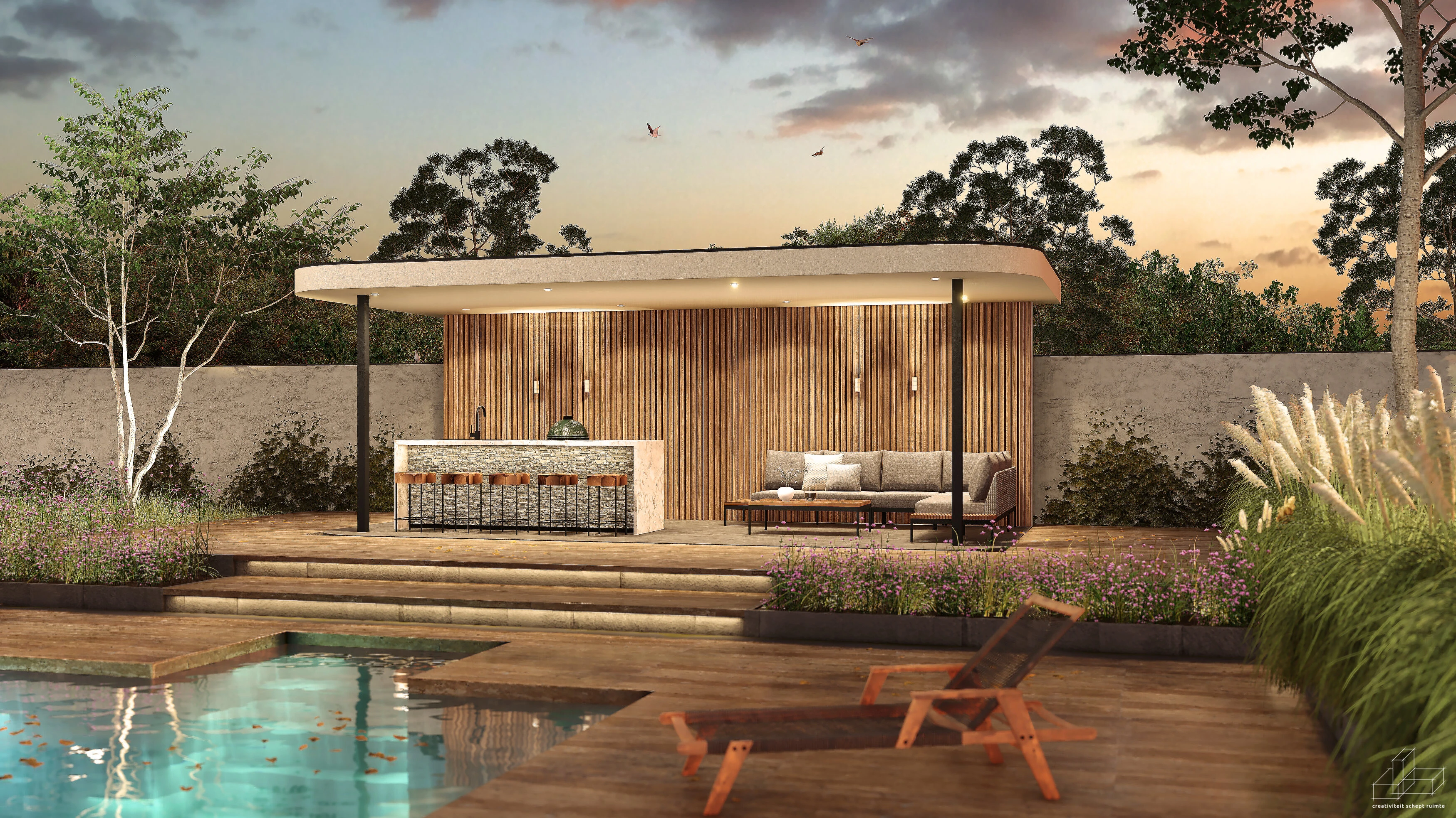 De l'Estate is een modern buitenverblijf dat direct opvalt door haar ronde hoeken en open uitstraling. Waar andere tuinkamers werken met rechte lijnen en standaardvormen, kiest dit ontwerp voor zachte hoeken en ruimtelijkheid. Het resultaat: een plek die uitnodigt om te blijven, met alle ruimte voor jouw eigen invulling.