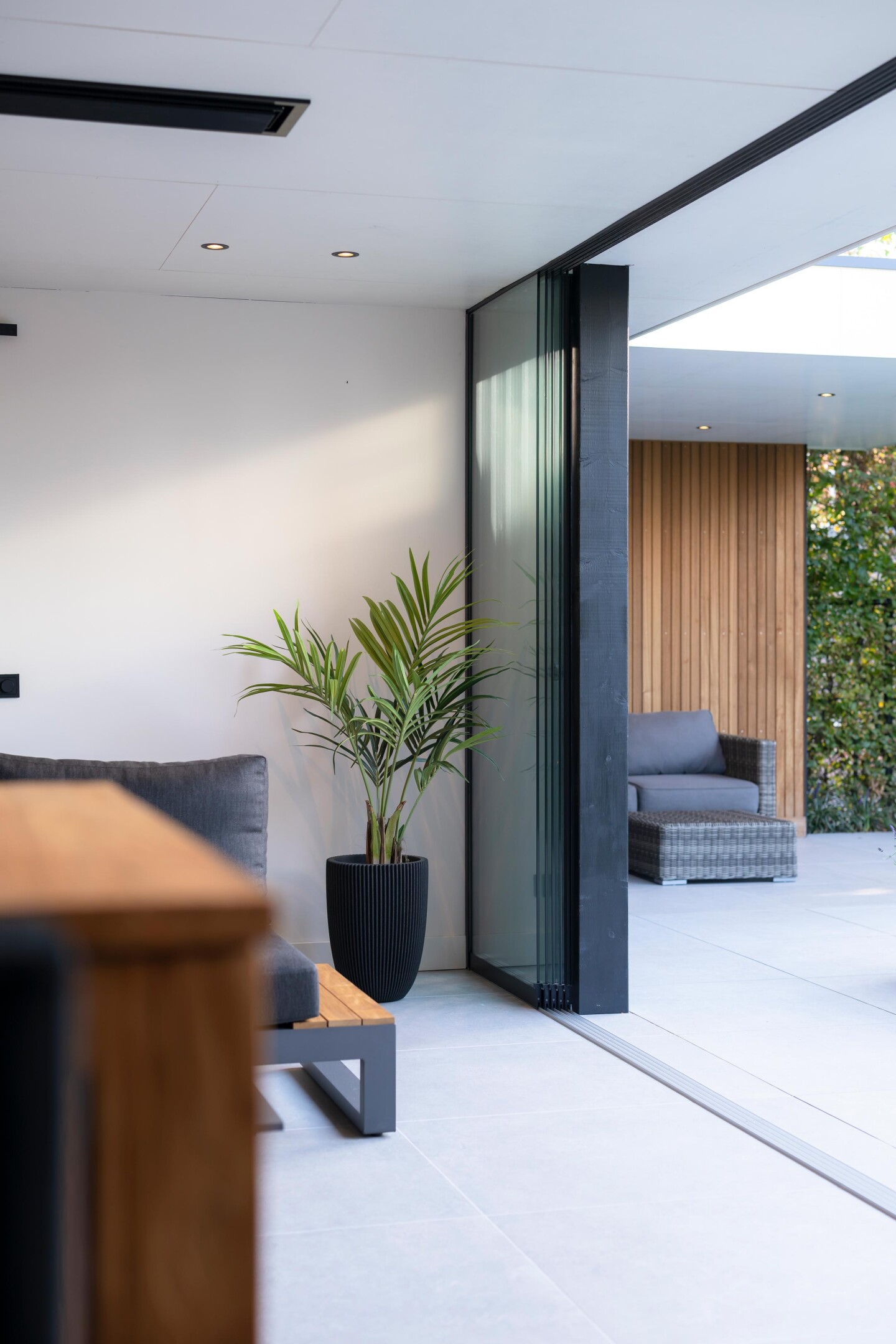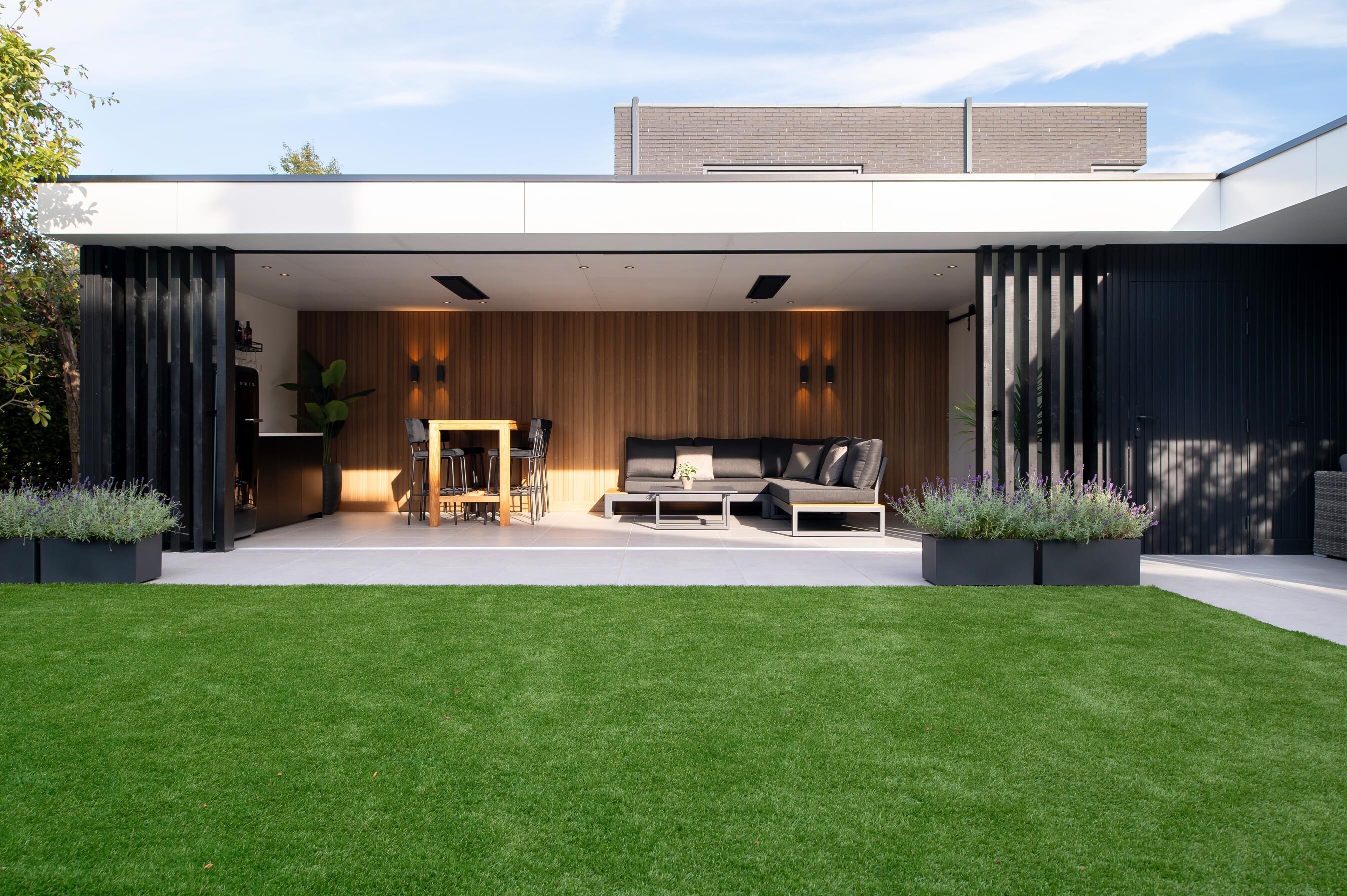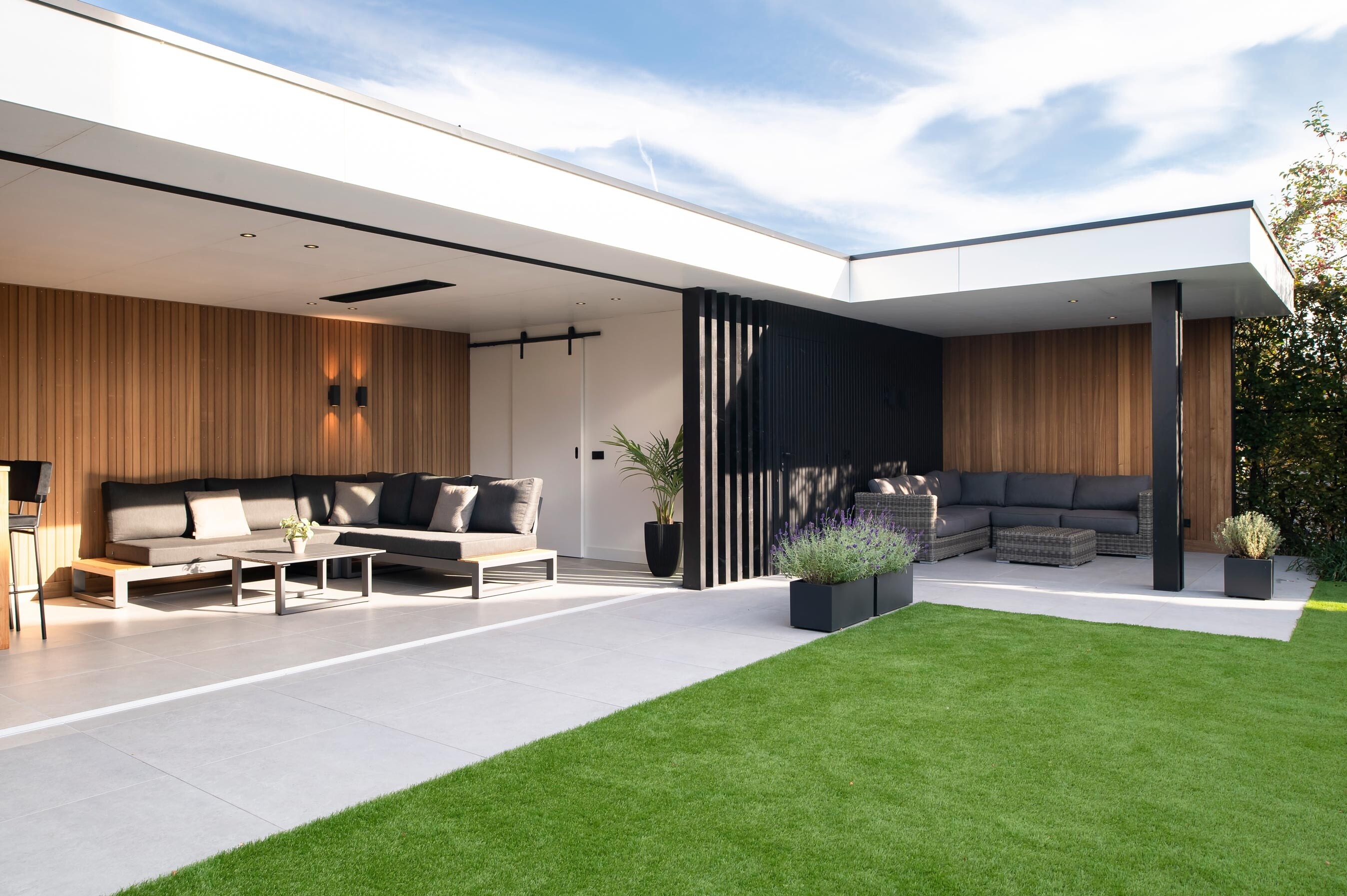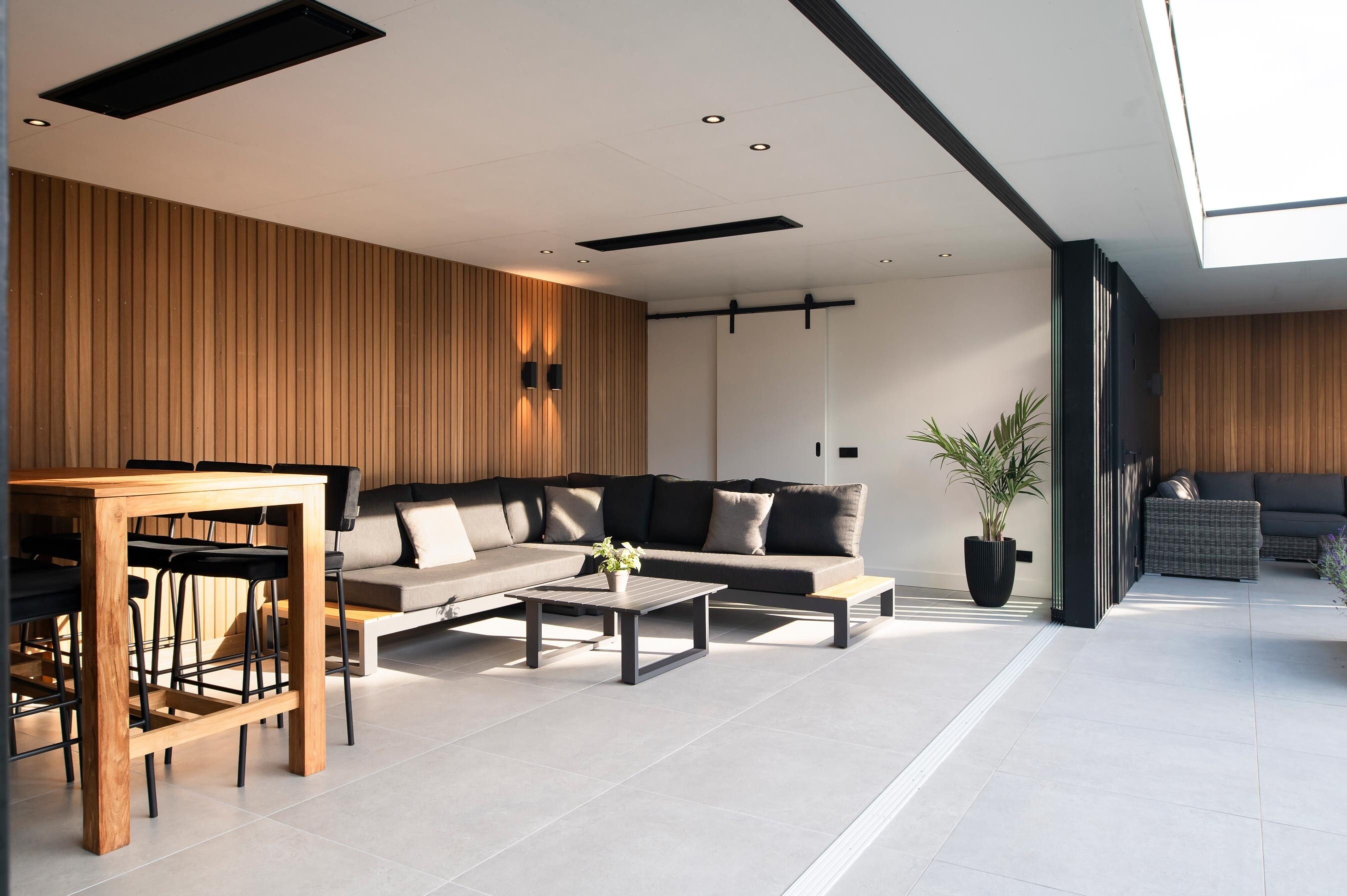 Deze buitenkamer brengt comfort, design en gebruiksgemak samen in één strak geheel. Door de L-vormige opzet ontstaat een beschutte hoek waar binnen en buiten naadloos in elkaar overlopen. Het terras loopt vanuit de leefruimte door naar buiten, waardoor het geheel één rustige lijn vormt richting de tuin.