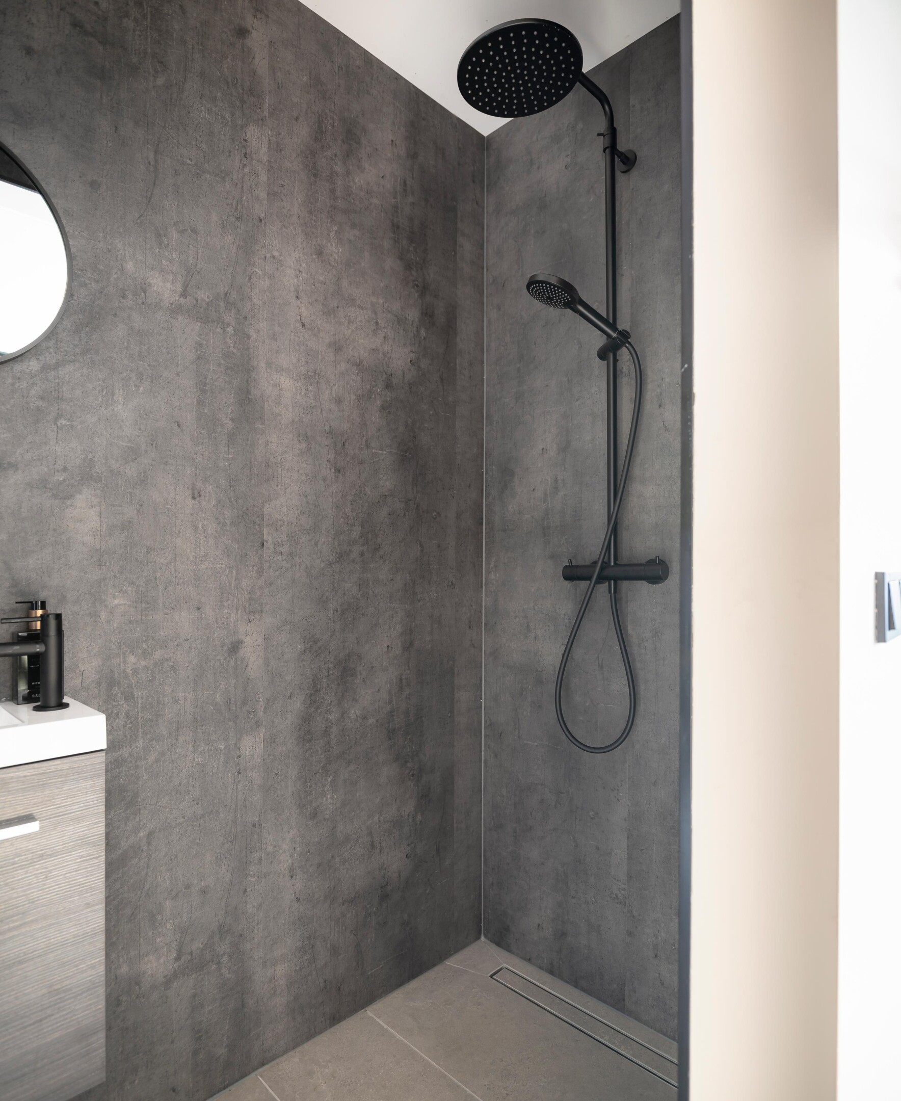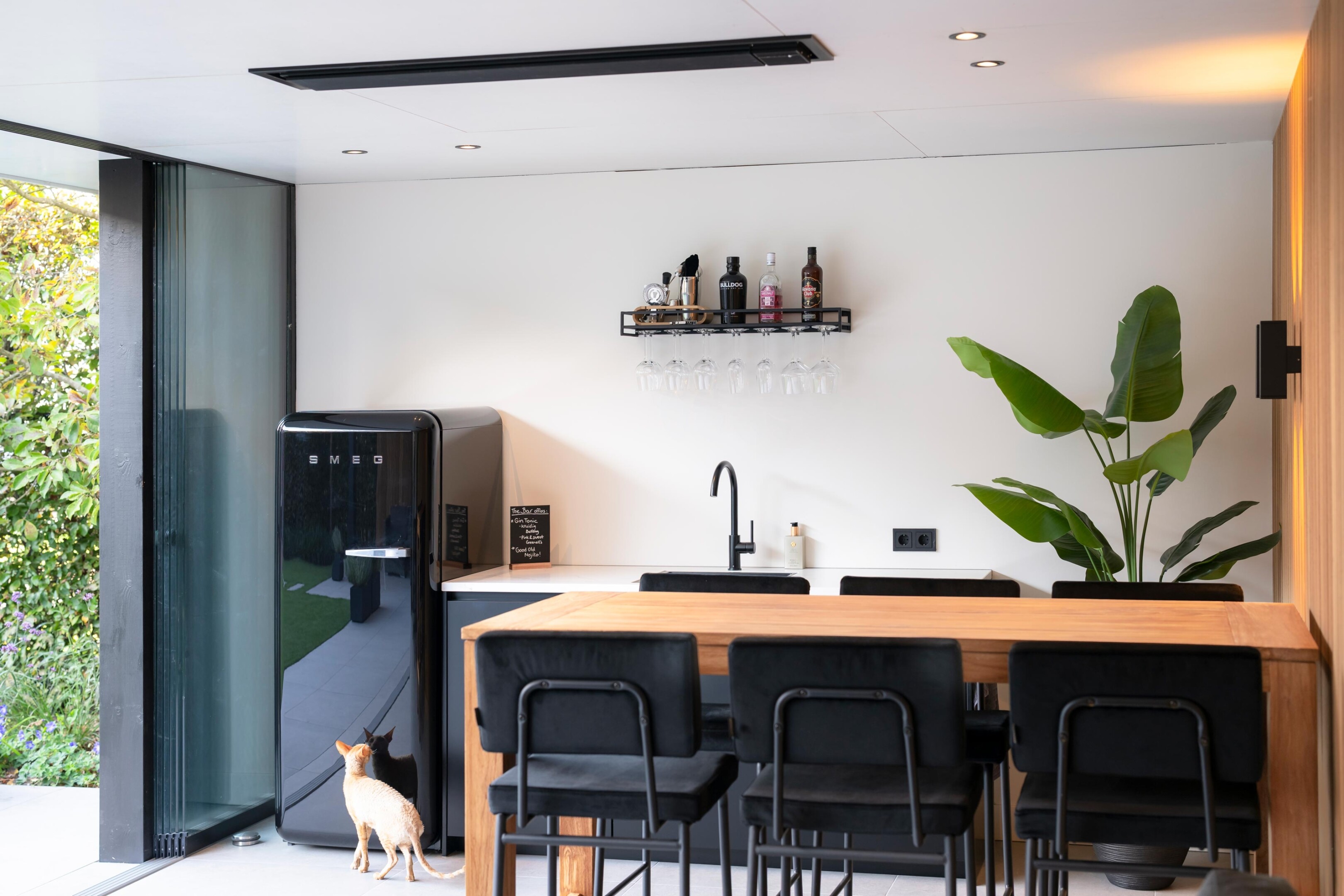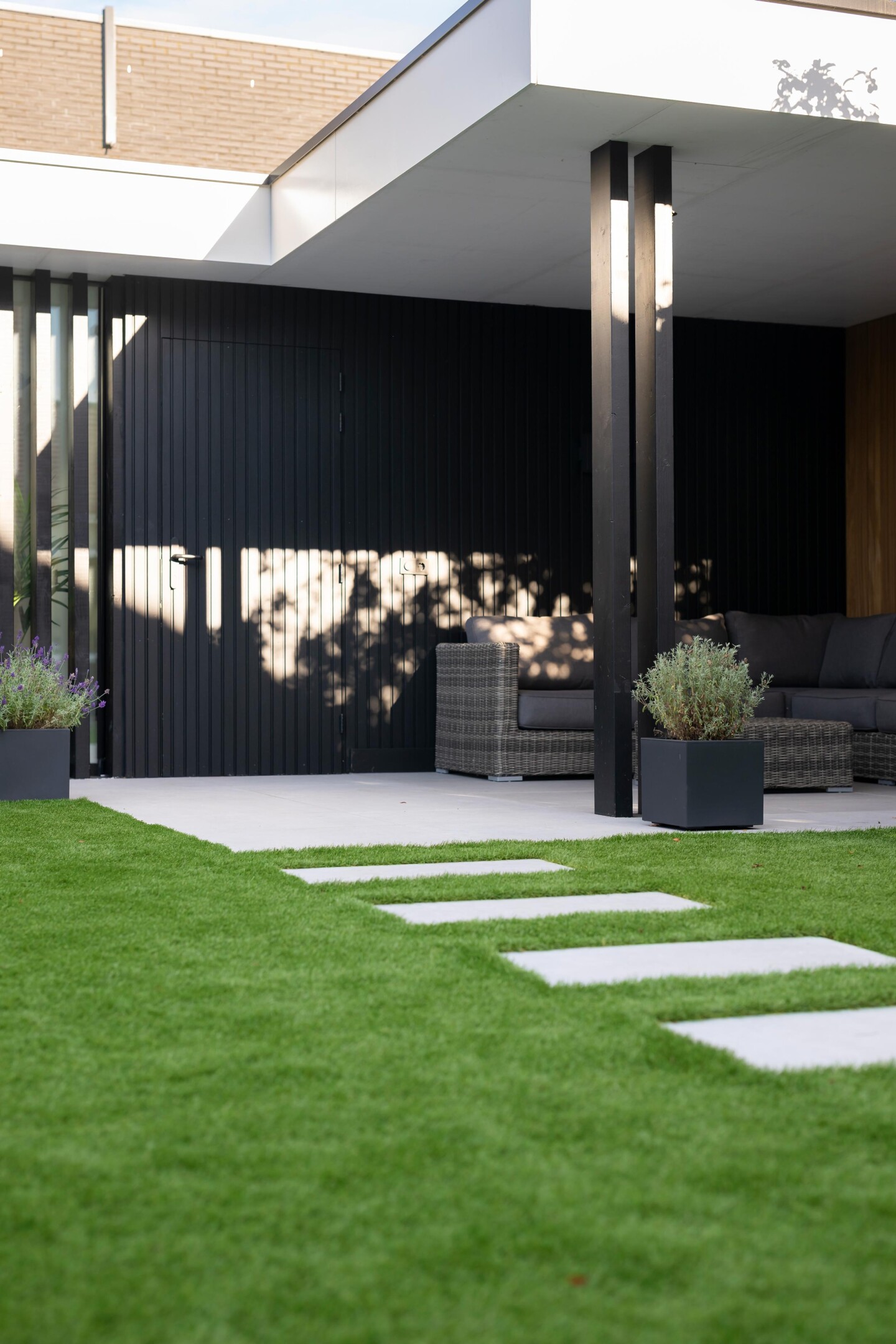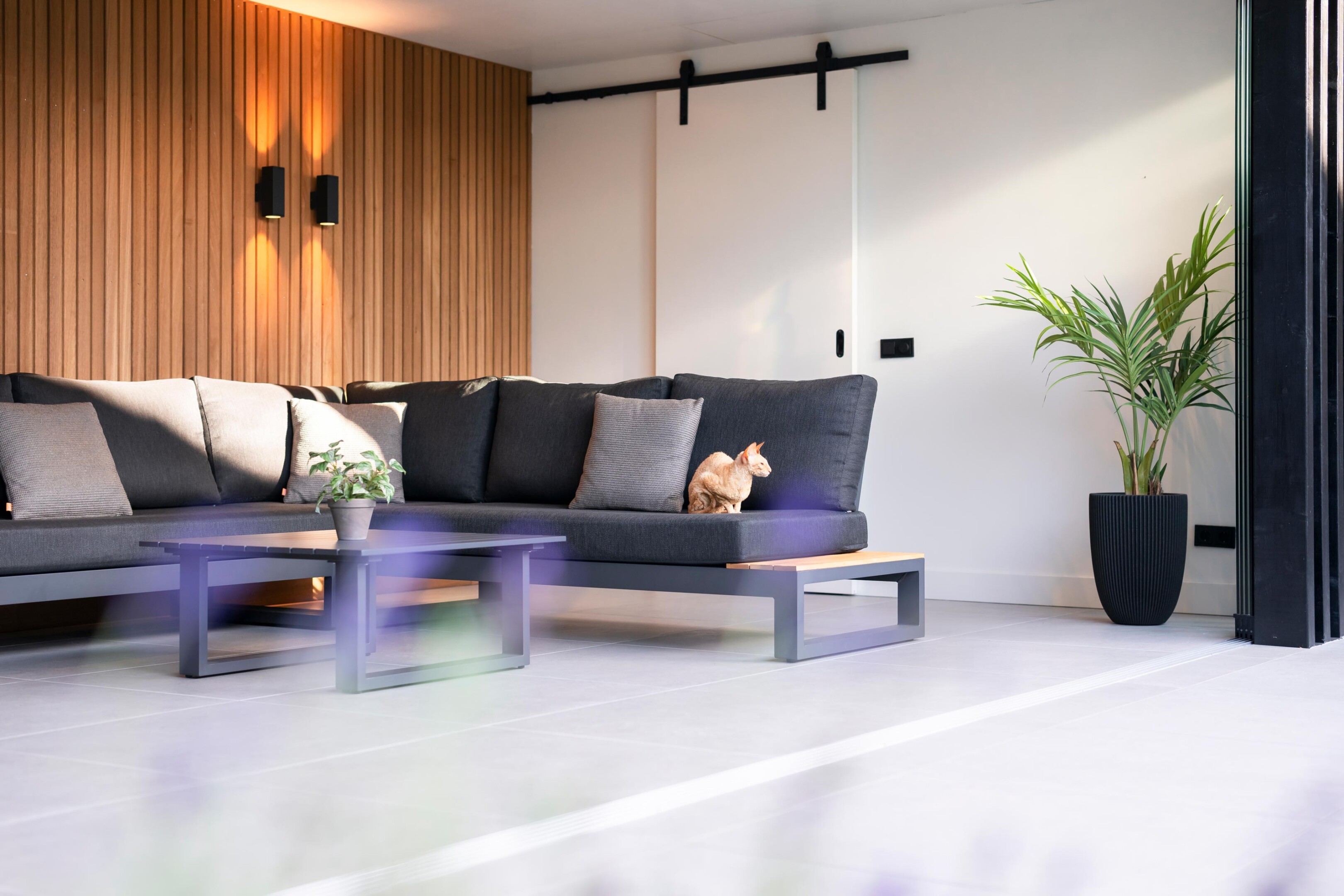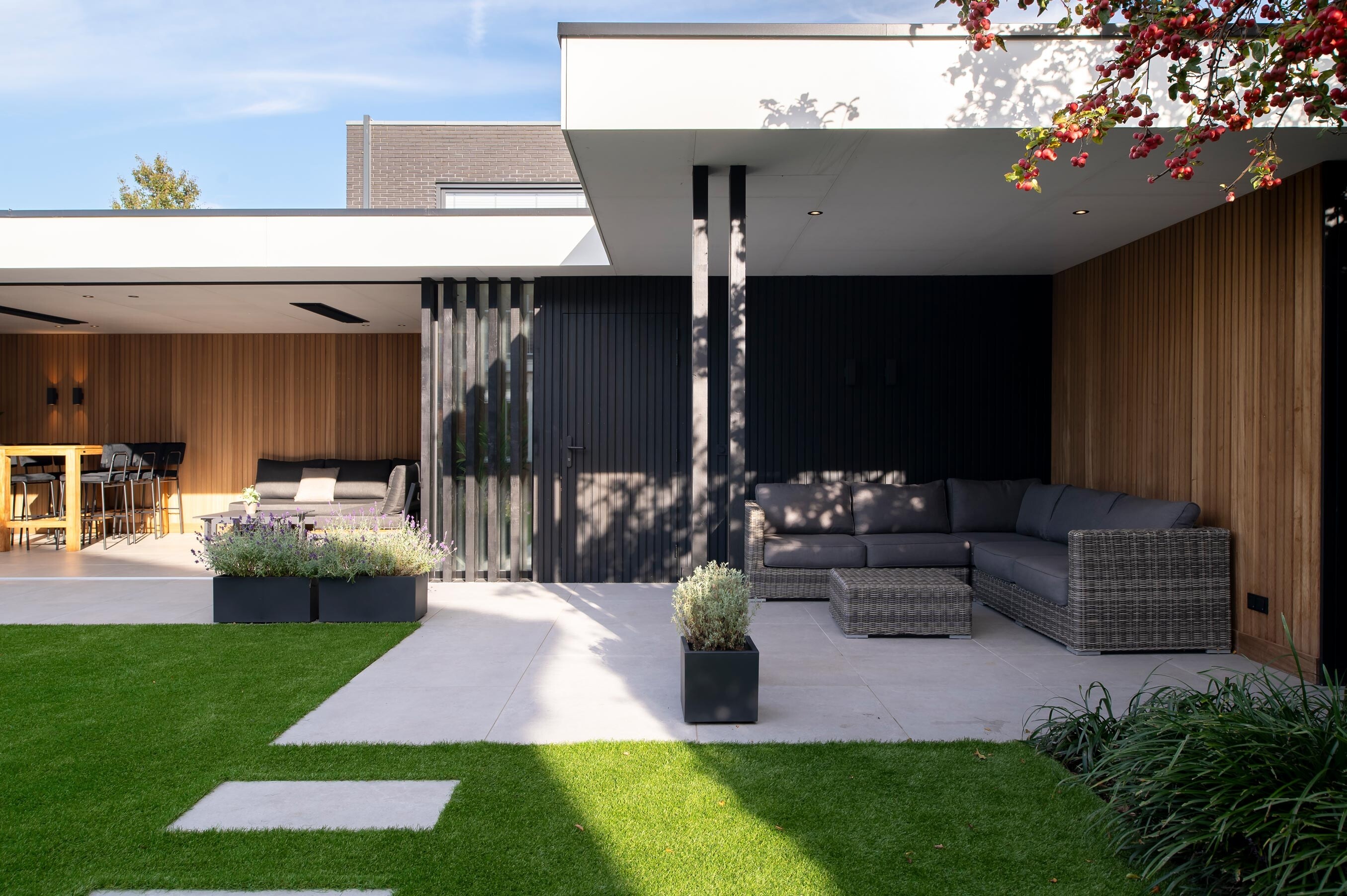 Deze buitenkamer brengt comfort, design en gebruiksgemak samen in één strak geheel. Door de L-vormige opzet ontstaat een beschutte hoek waar binnen en buiten naadloos in elkaar overlopen. Het terras loopt vanuit de leefruimte door naar buiten, waardoor het geheel één rustige lijn vormt richting de tuin.