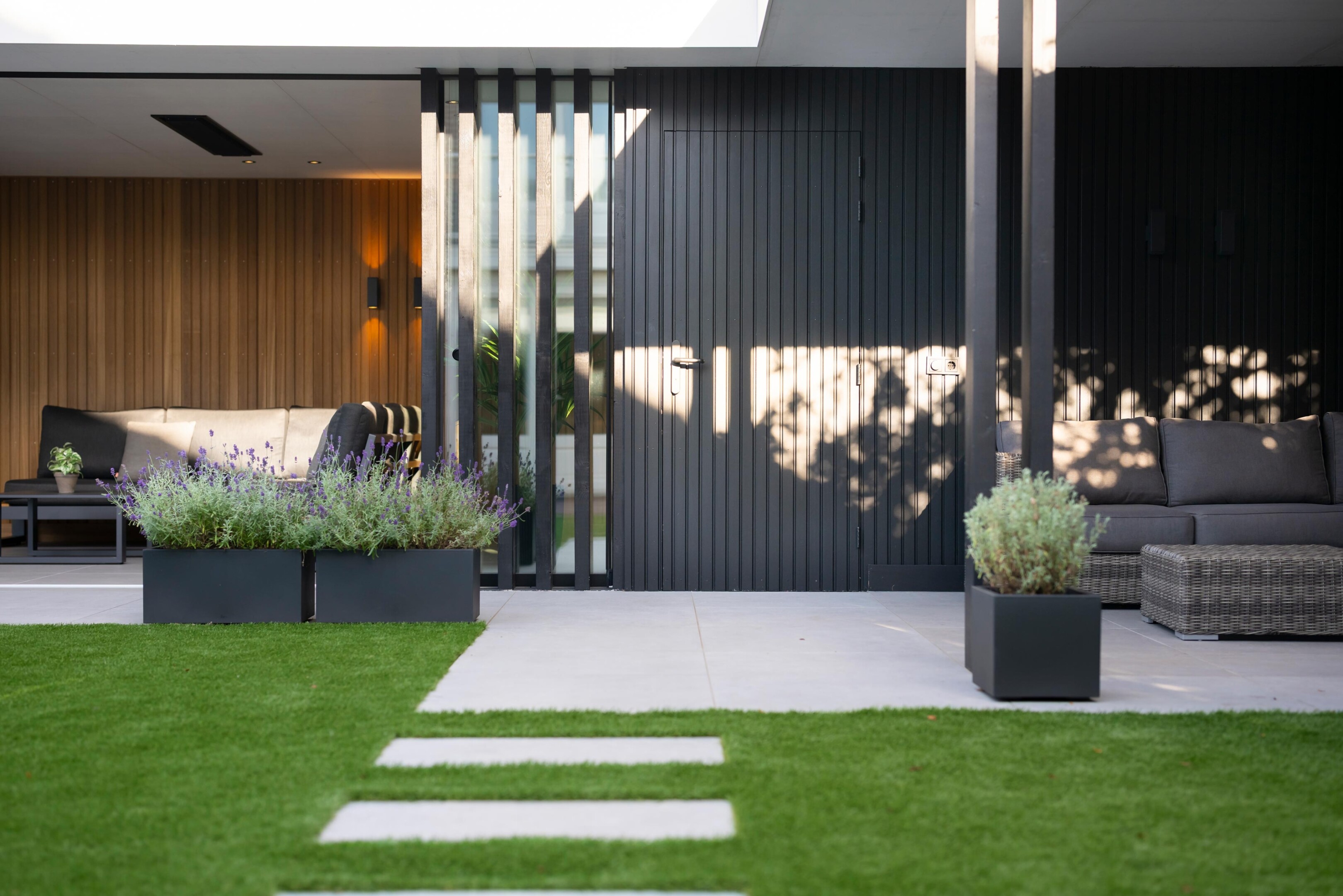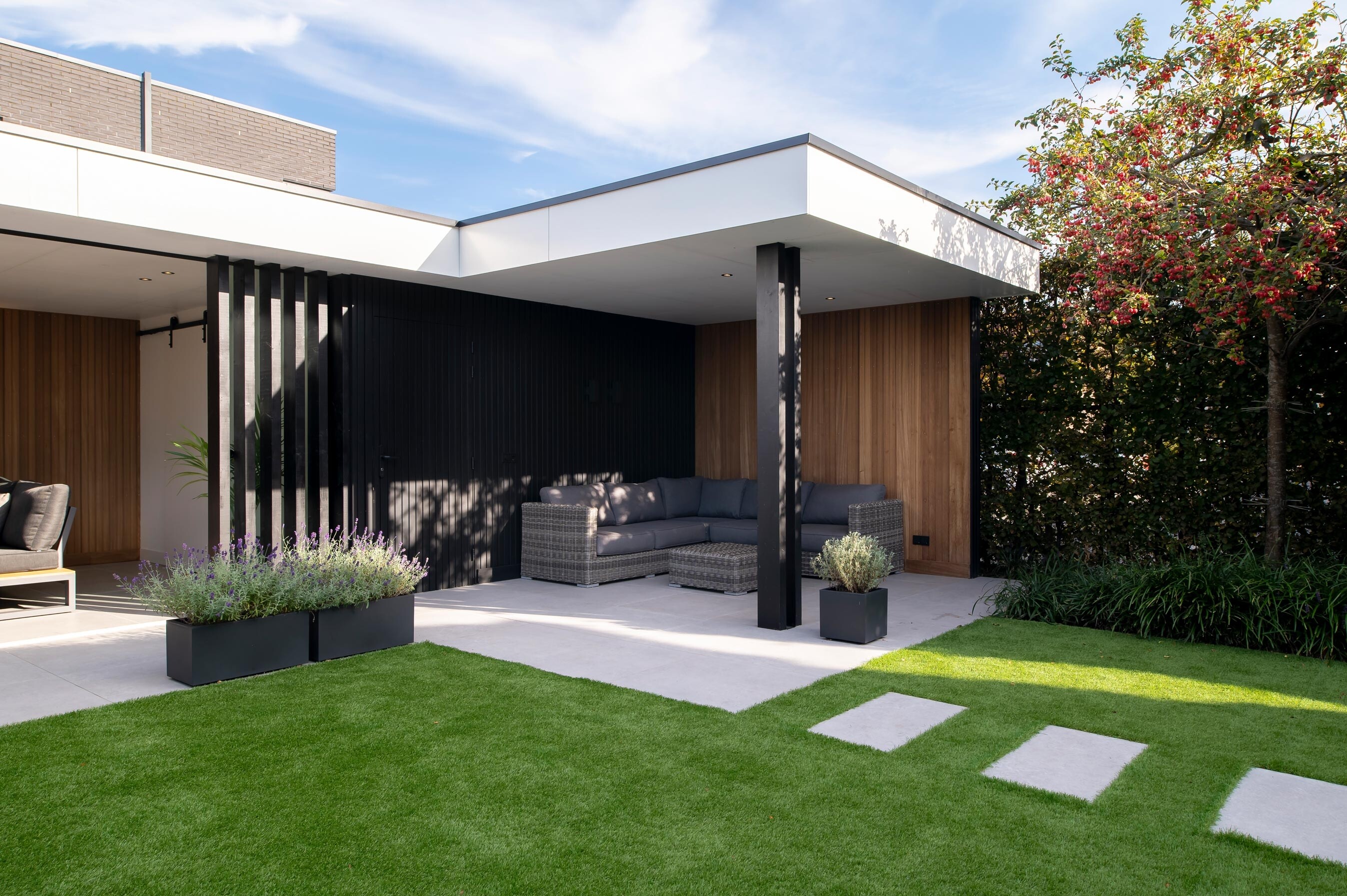 De lijnvoering is rustig en de verhoudingen kloppen, zodat het ontwerp perfect aansluit op de woning. De zwarte gevelaccenten geven diepte, terwijl het warme hout aan de binnenzijde voor balans zorgt. De verhouding tussen open en gesloten vlakken maakt dat het bouwwerk luchtig oogt, maar toch veel privacy biedt.