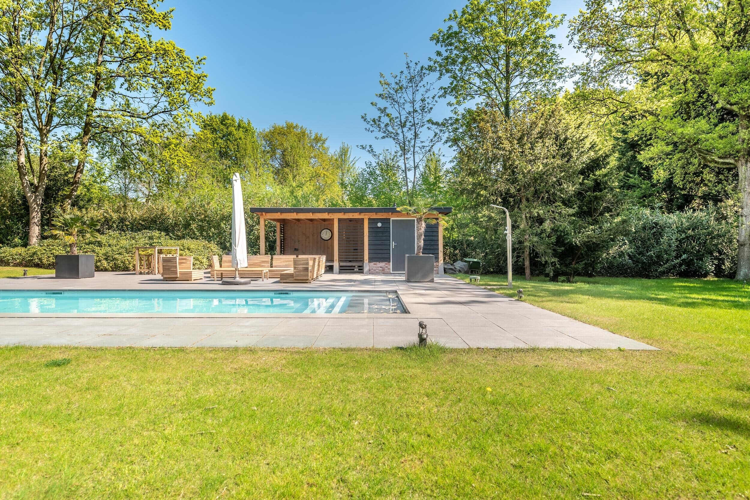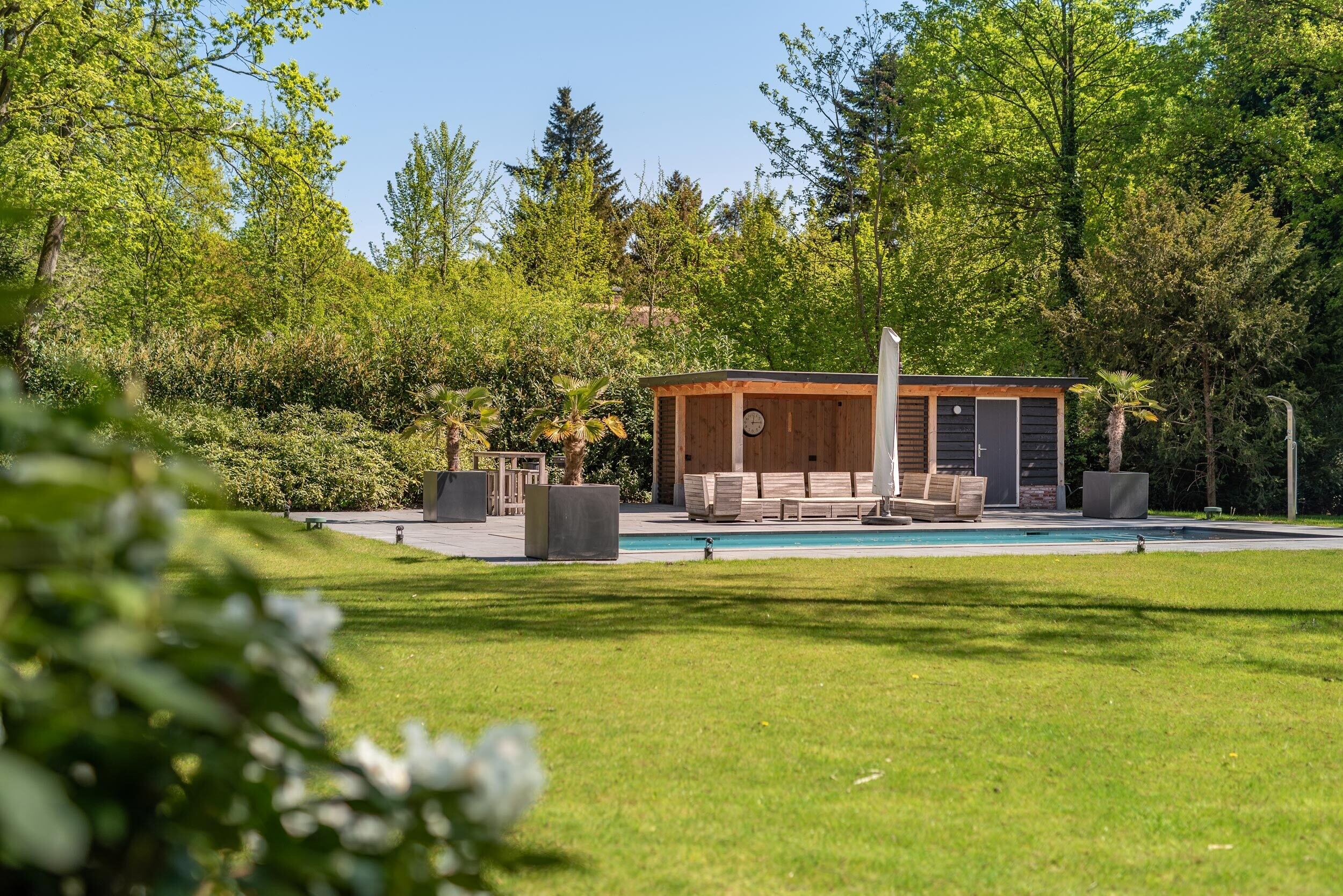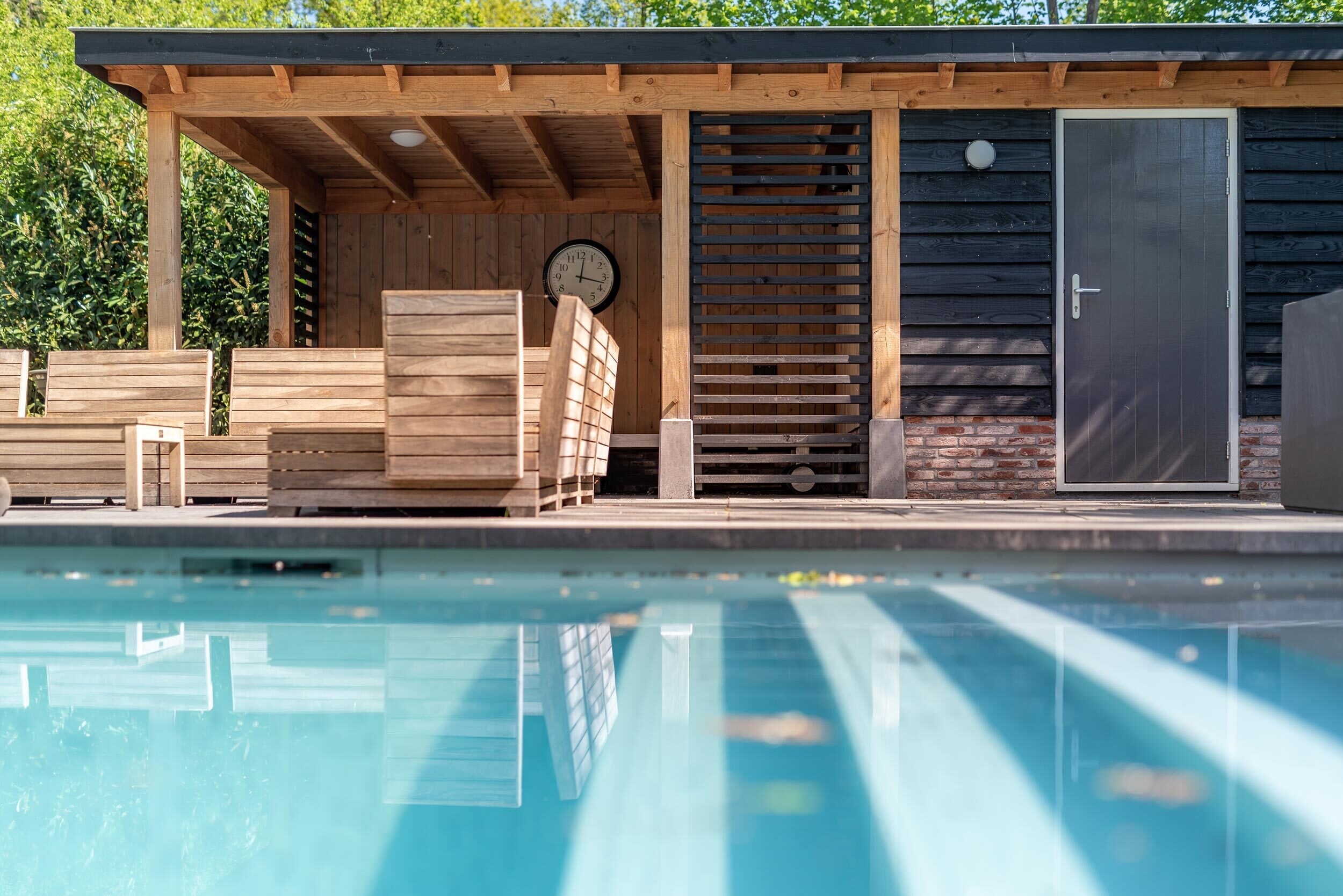 De berging biedt ruimte voor de volledige installatie van het naastgelegen zwembad en bevat een praktische toiletruimte. Op verzoek van de opdrachtgever hebben we gezorgd voor een landelijke uitstraling, met getoogde overstekklossen en gepotdekselde wanden.