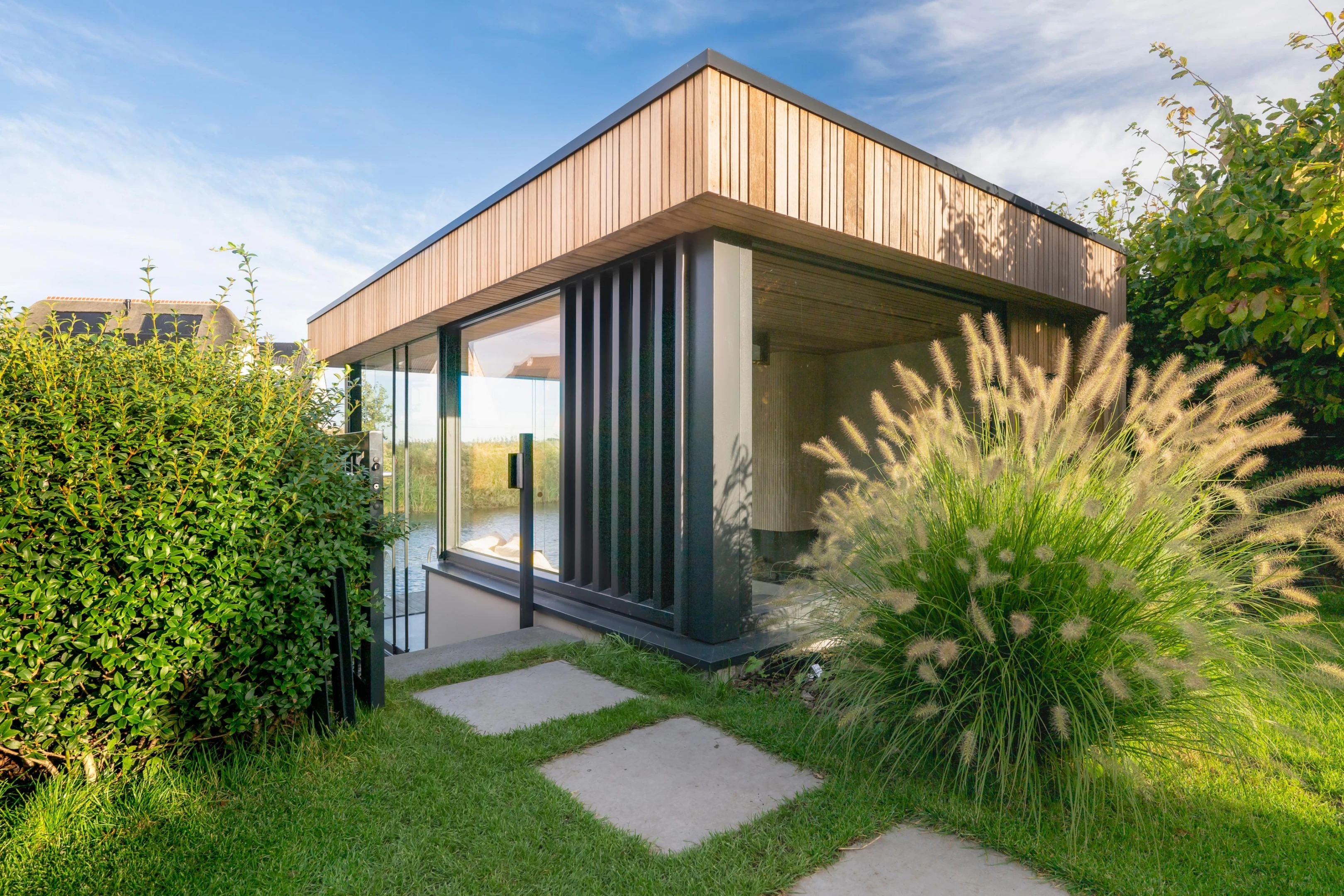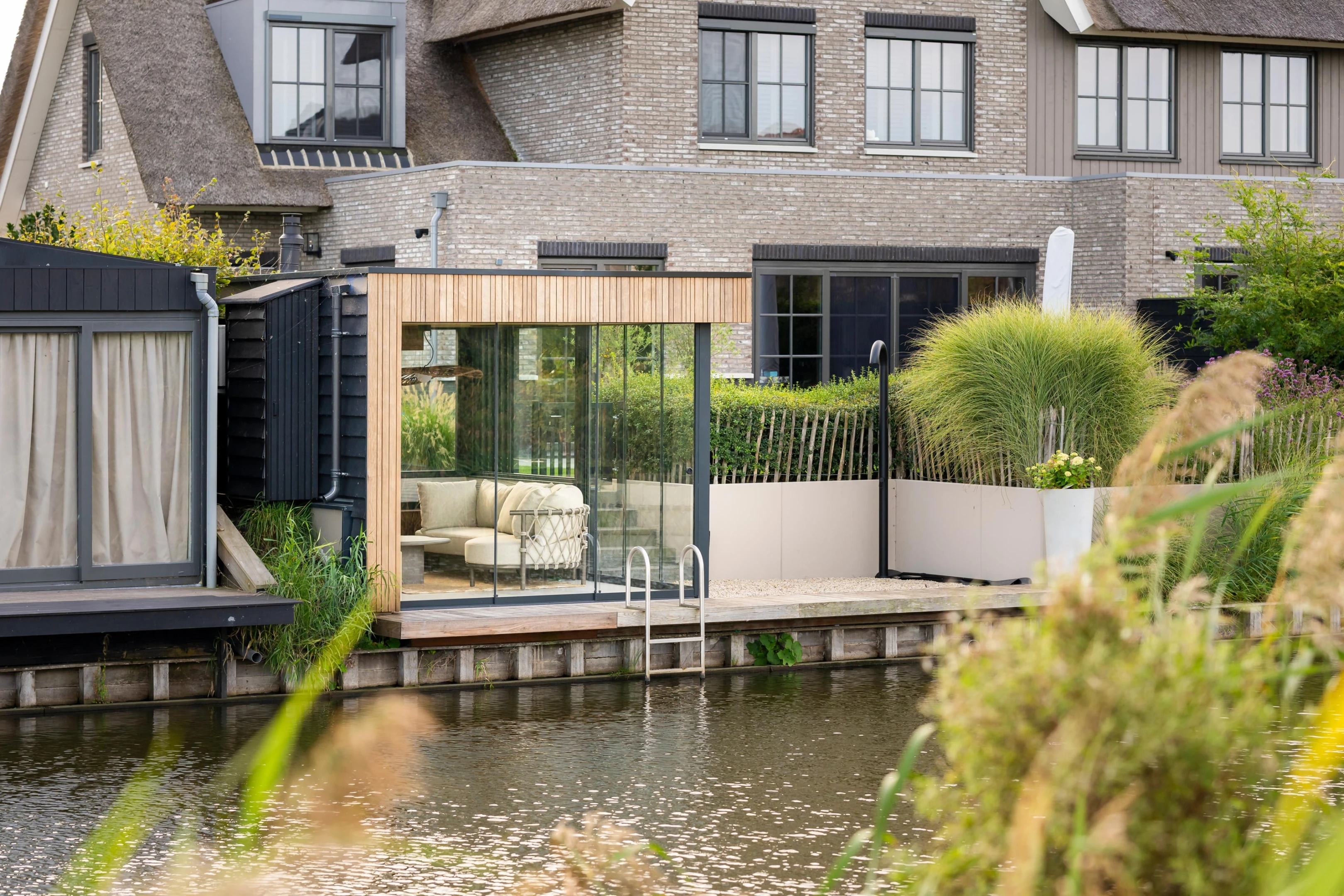 In de nieuwbouwwijk Weespersluis in Weesp bouwden we een buitenkamer die volledig past bij de plek. Het bouwwerk ligt iets verdiept ten opzichte van de woning en volgt de lijnen van de waterrijke omgeving. Daardoor ligt het beschut, met vrij uitzicht over het water en het licht dat ’s avonds mooi langs de vlonder strijkt. “We wilden de ligging aan het water echt laten spreken,” vertelt Frank. “Daarom hebben we de buitenkamer iets verdiept gebouwd en de lijnen rustig gehouden.”