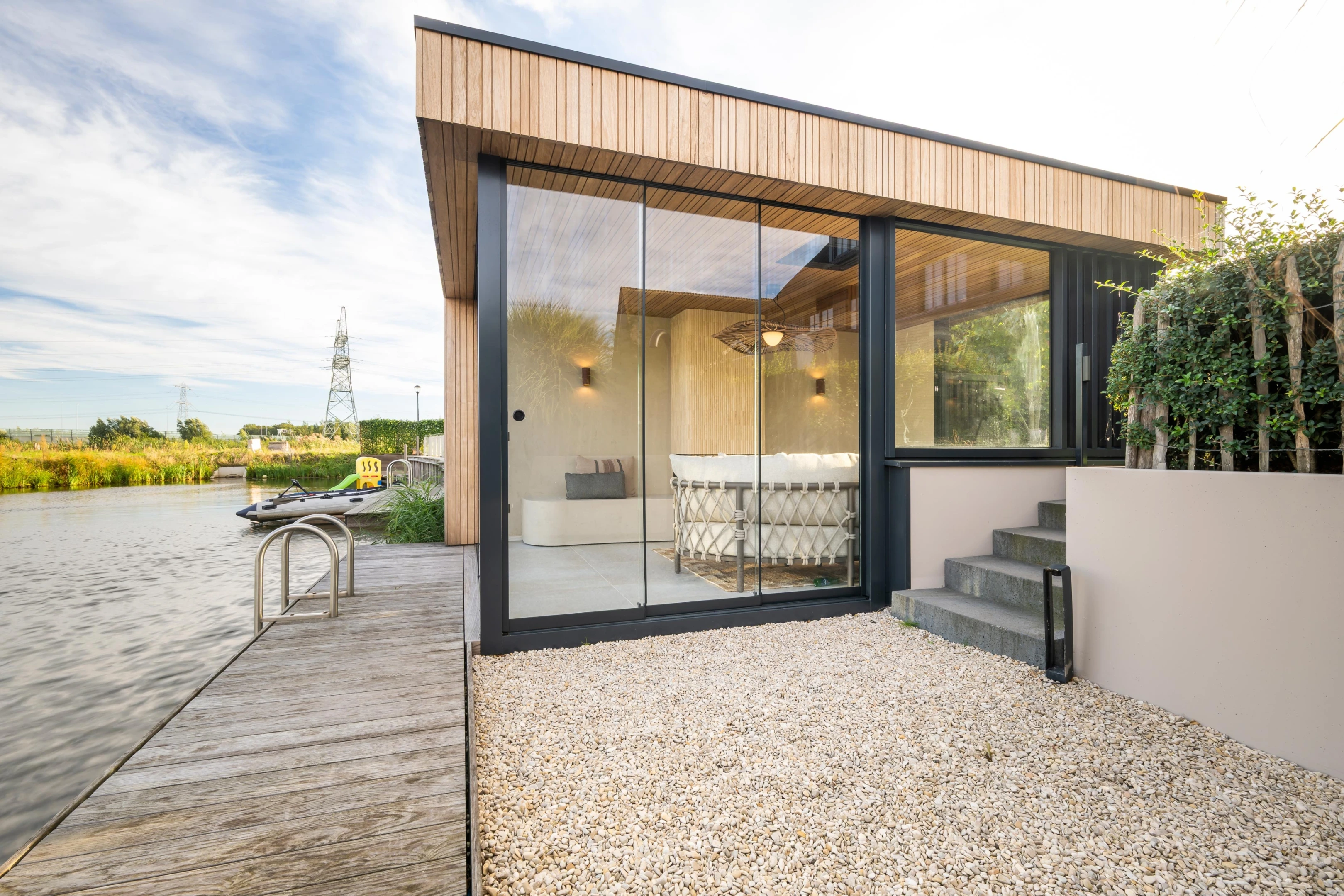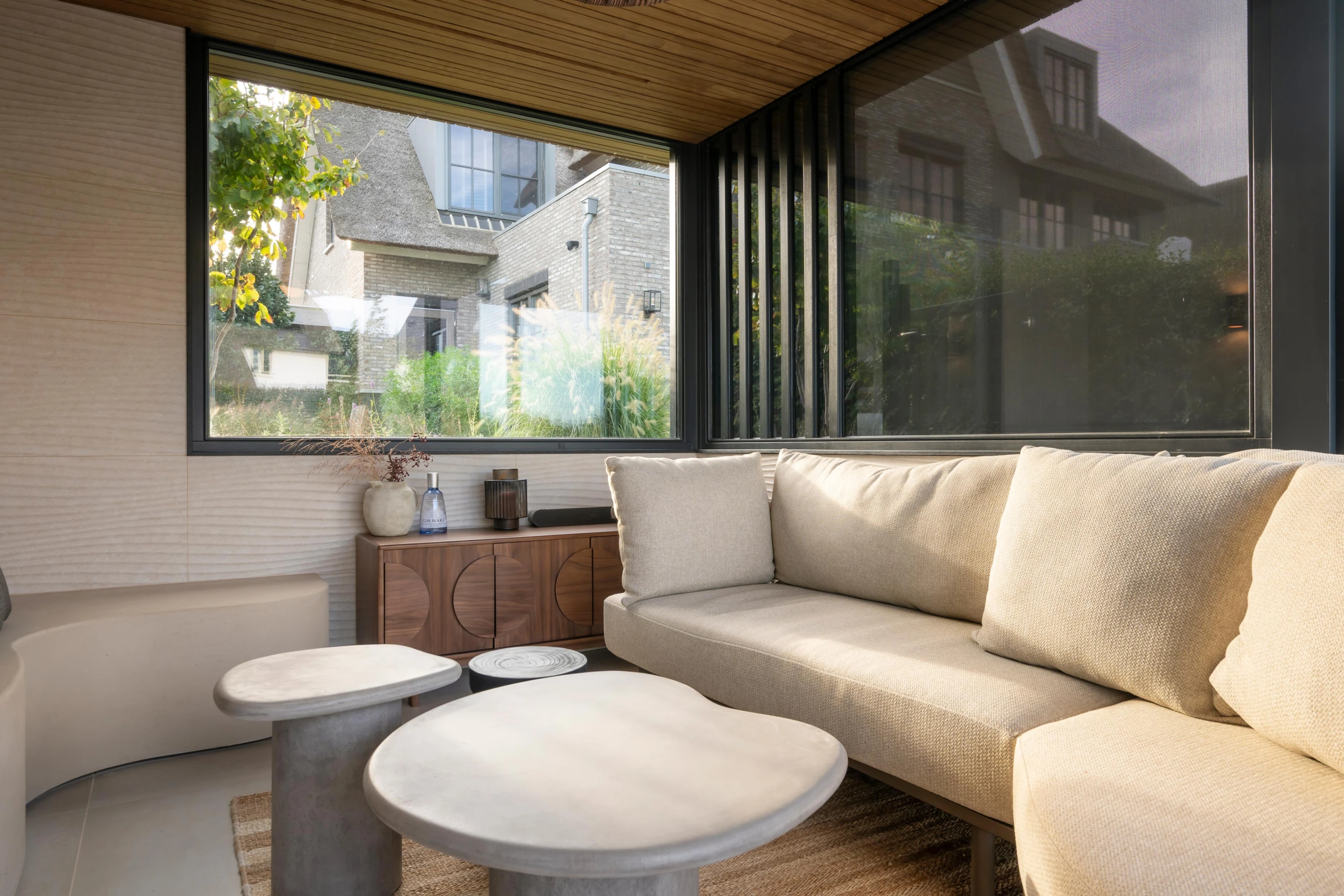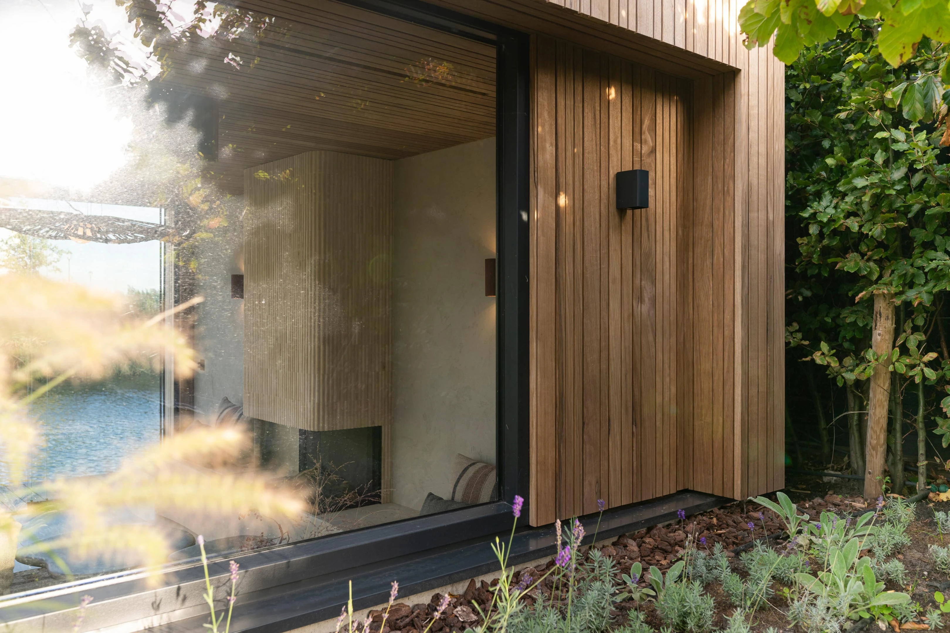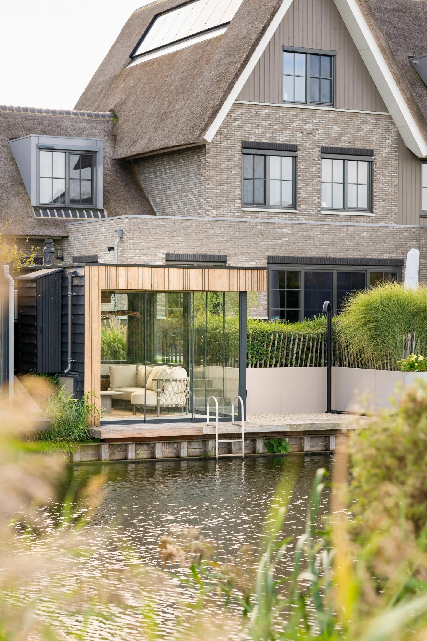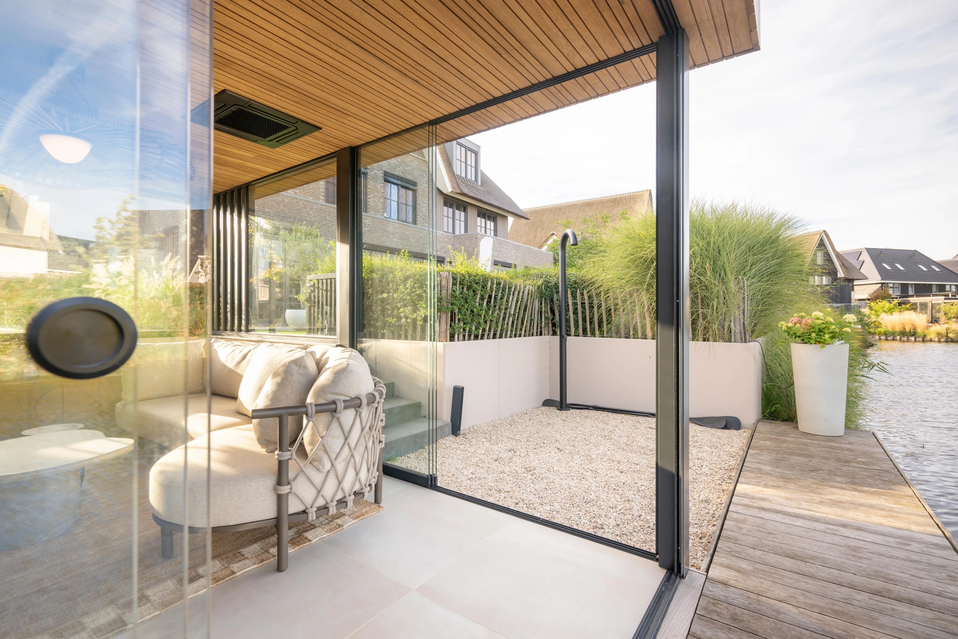 De buitenkamer sluit direct aan op een houten vlonder met zwemtrap. Ook buiten is alles tot in detail uitgewerkt: een buitendouche met een weggewerkte boiler in een geïsoleerde kast achter het bouwwerk, en een sedumdak dat zorgt voor isolatie en een groene uitstraling. Zo ontstaat een plek die rust uitstraalt en echt in elk seizoen comfortabel te gebruiken is.
