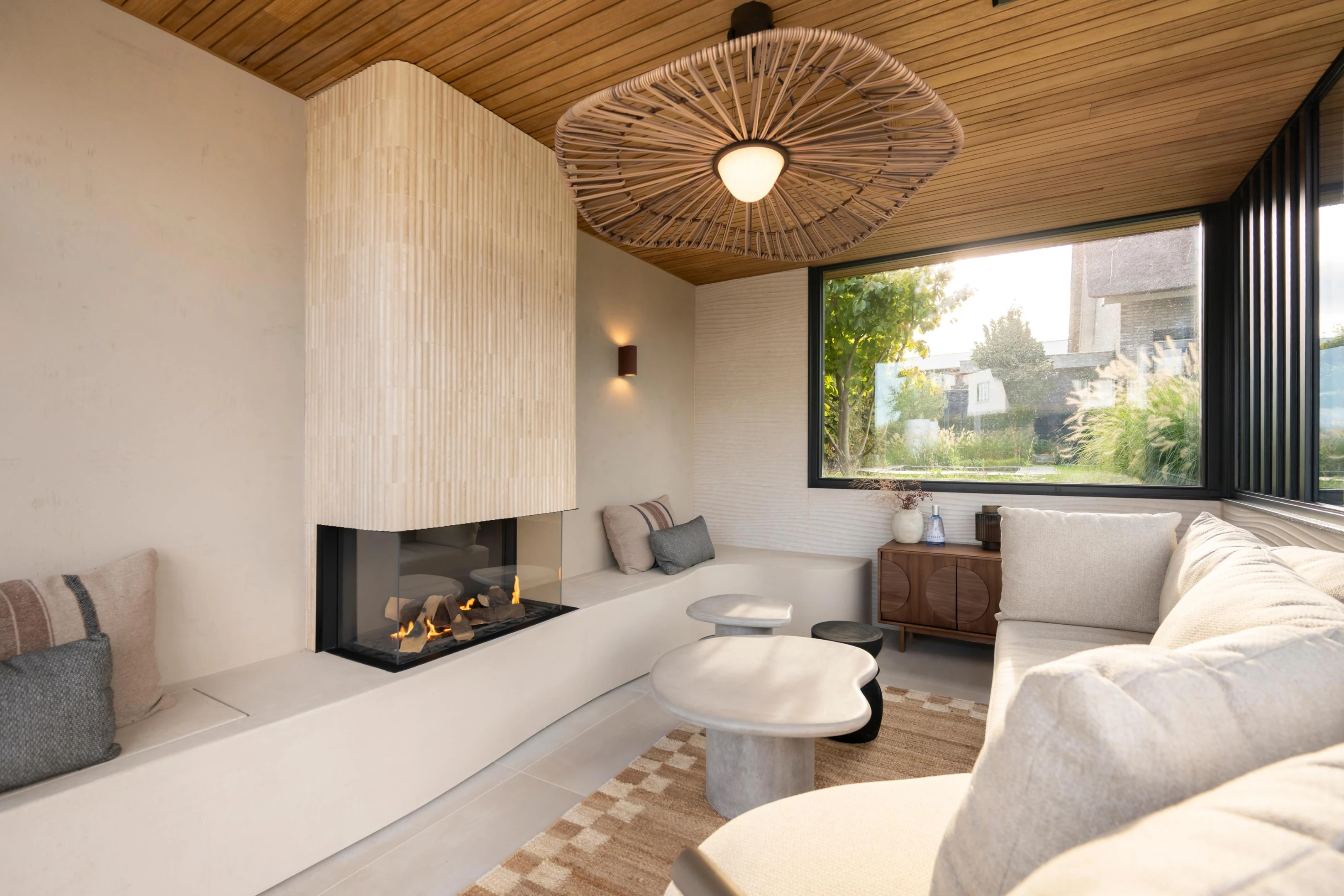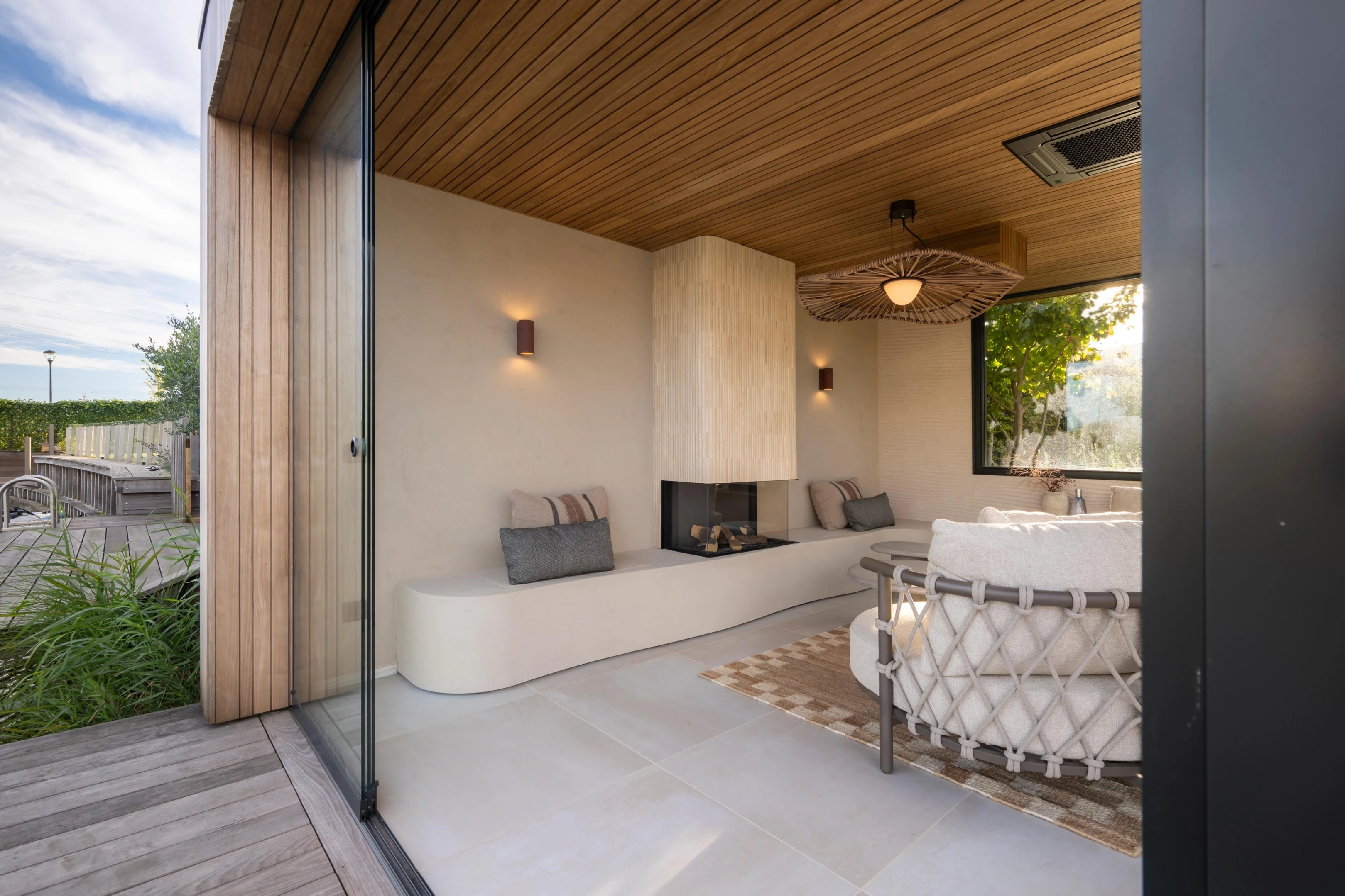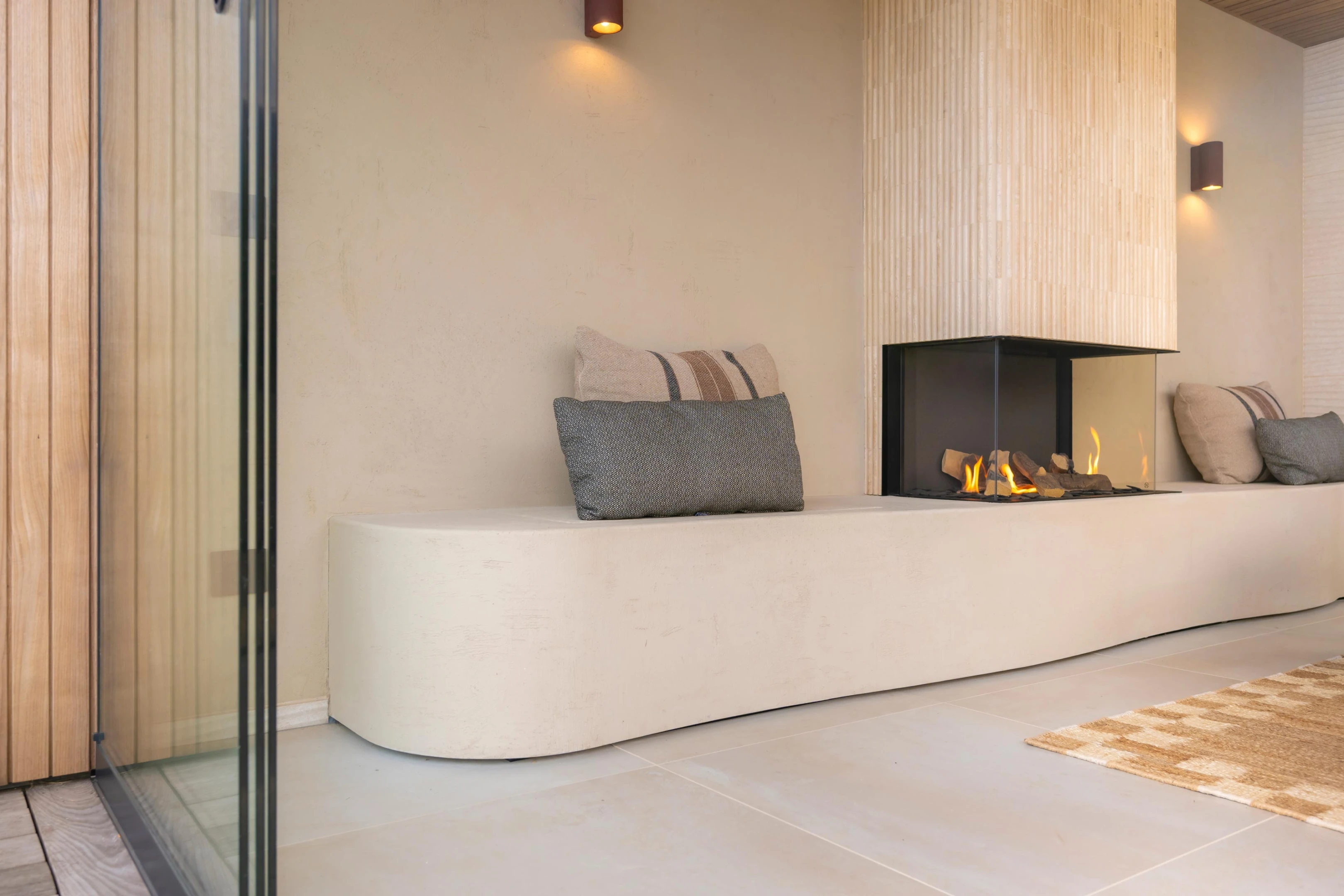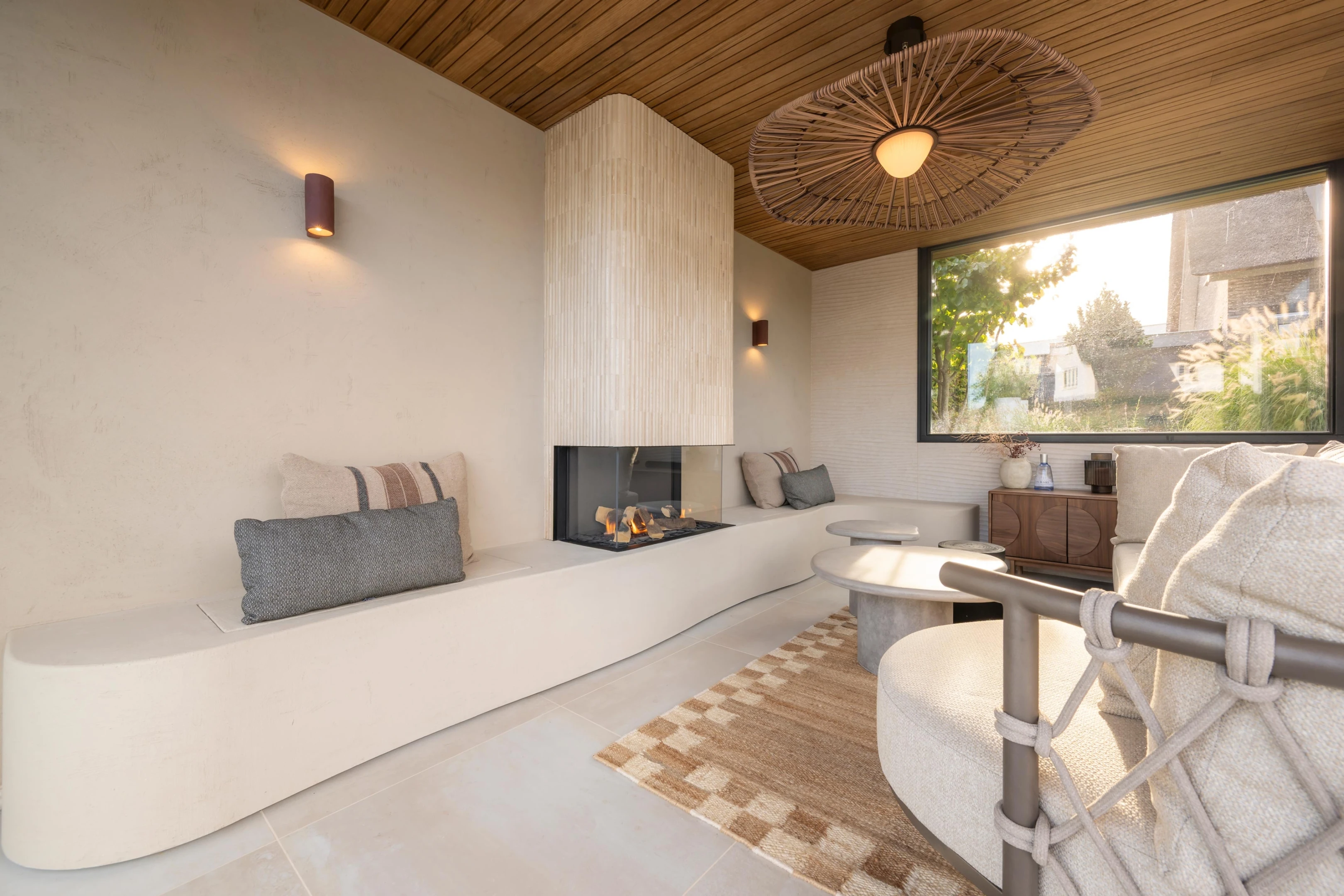 Binnen vormt de glooiende zitbank met haard het hart van de ruimte. De bank is uitgevoerd in designstuc met zachte, ronde lijnen die het interieur vormgeven. De driezijdige haard is niet alleen een sfeerpunt, het verwarmt de hele buitenkamer. De haardkolom is bekleed met verticale mozaïektegels die diepte geven aan het geheel. De overige wanden zijn voorzien van tegels, het plafond is van hout. Samen zorgen ze voor een warme, natuurlijke uitstraling die past bij de omgeving.