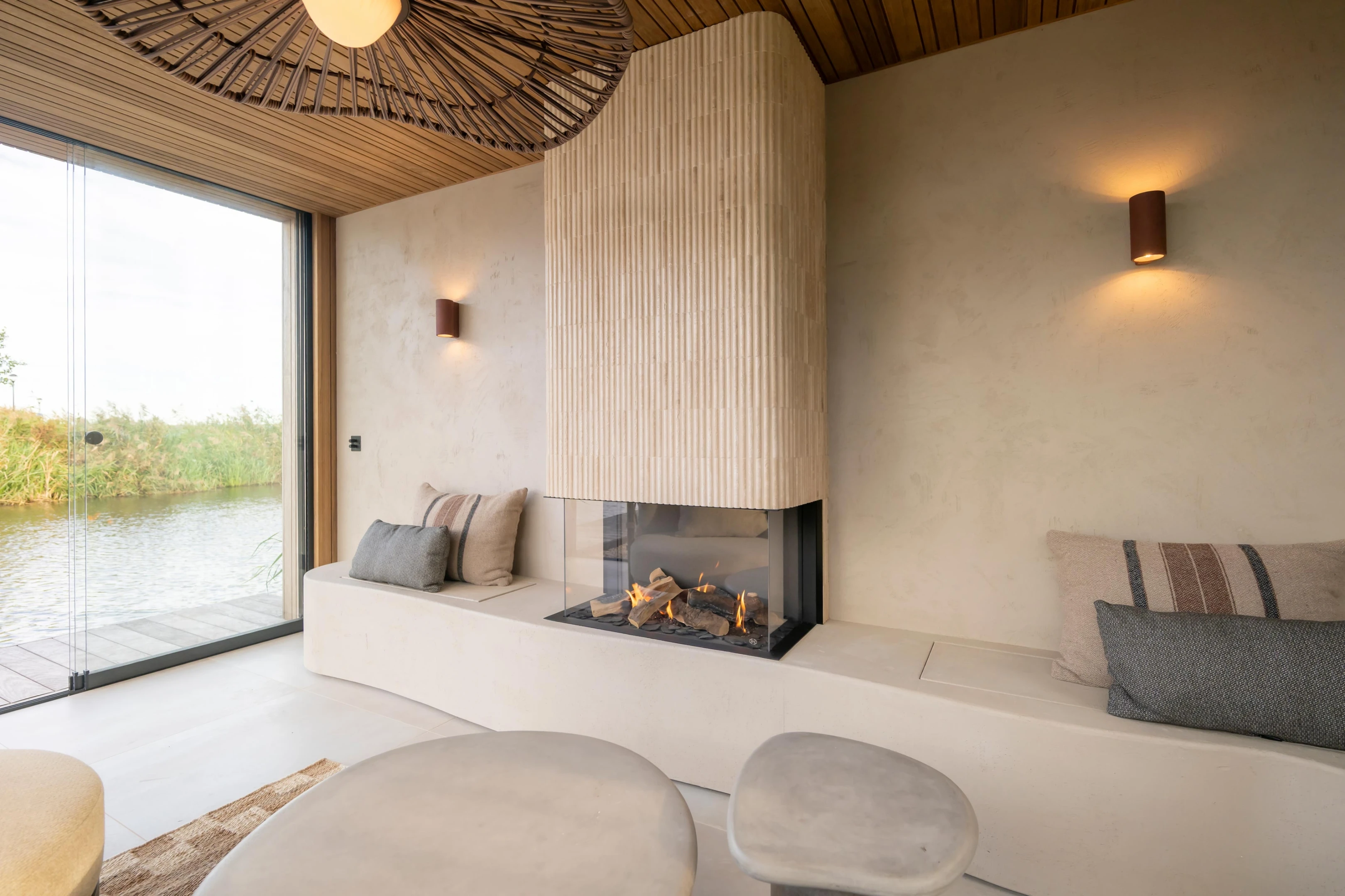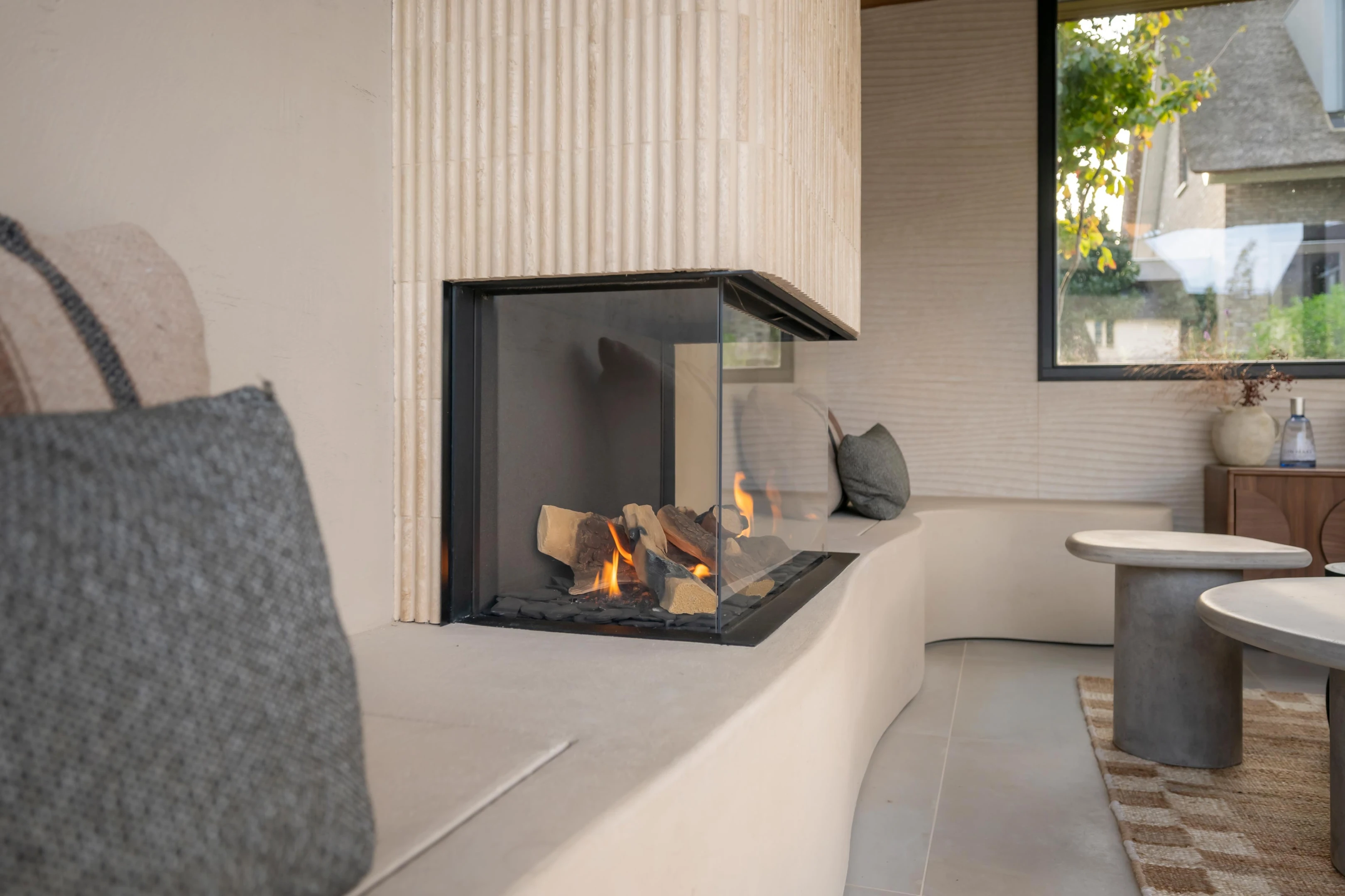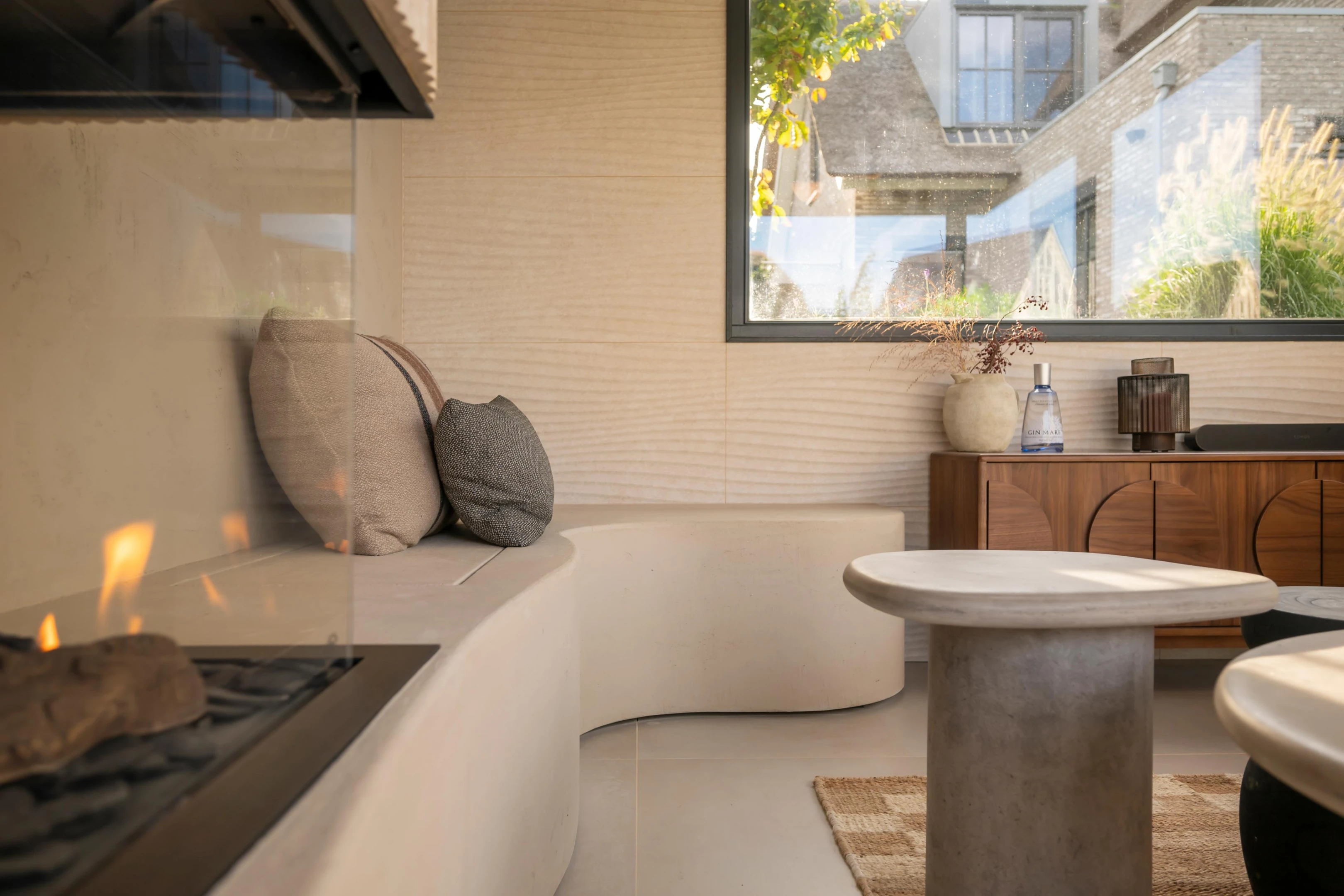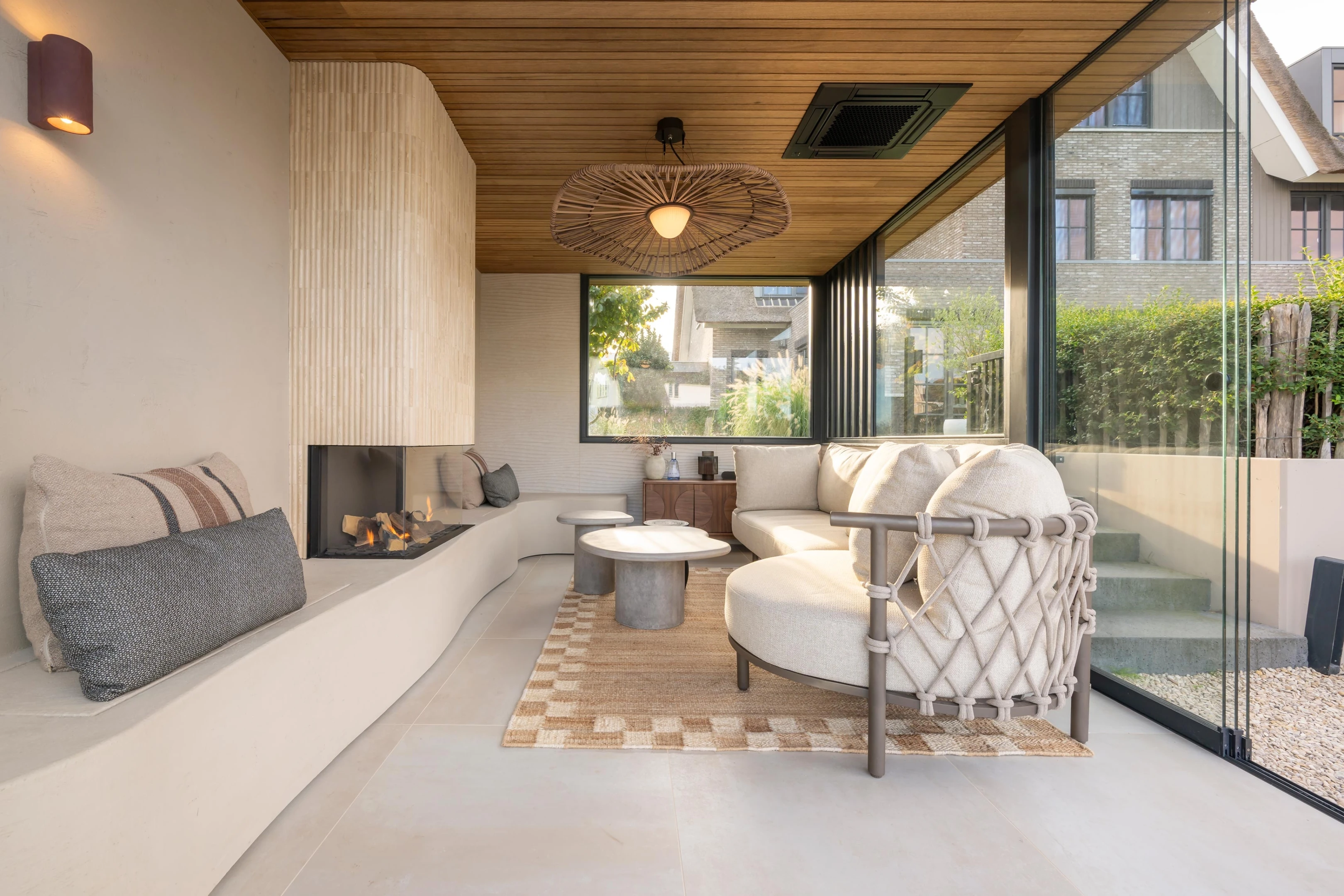 Binnen vormt de glooiende zitbank met haard het hart van de ruimte. De bank is uitgevoerd in designstuc met zachte, ronde lijnen die het interieur vormgeven. De driezijdige haard is niet alleen een sfeerpunt, het verwarmt de hele buitenkamer. De haardkolom is bekleed met verticale mozaïektegels die diepte geven aan het geheel. De overige wanden zijn voorzien van tegels, het plafond is van hout. Samen zorgen ze voor een warme, natuurlijke uitstraling die past bij de omgeving.