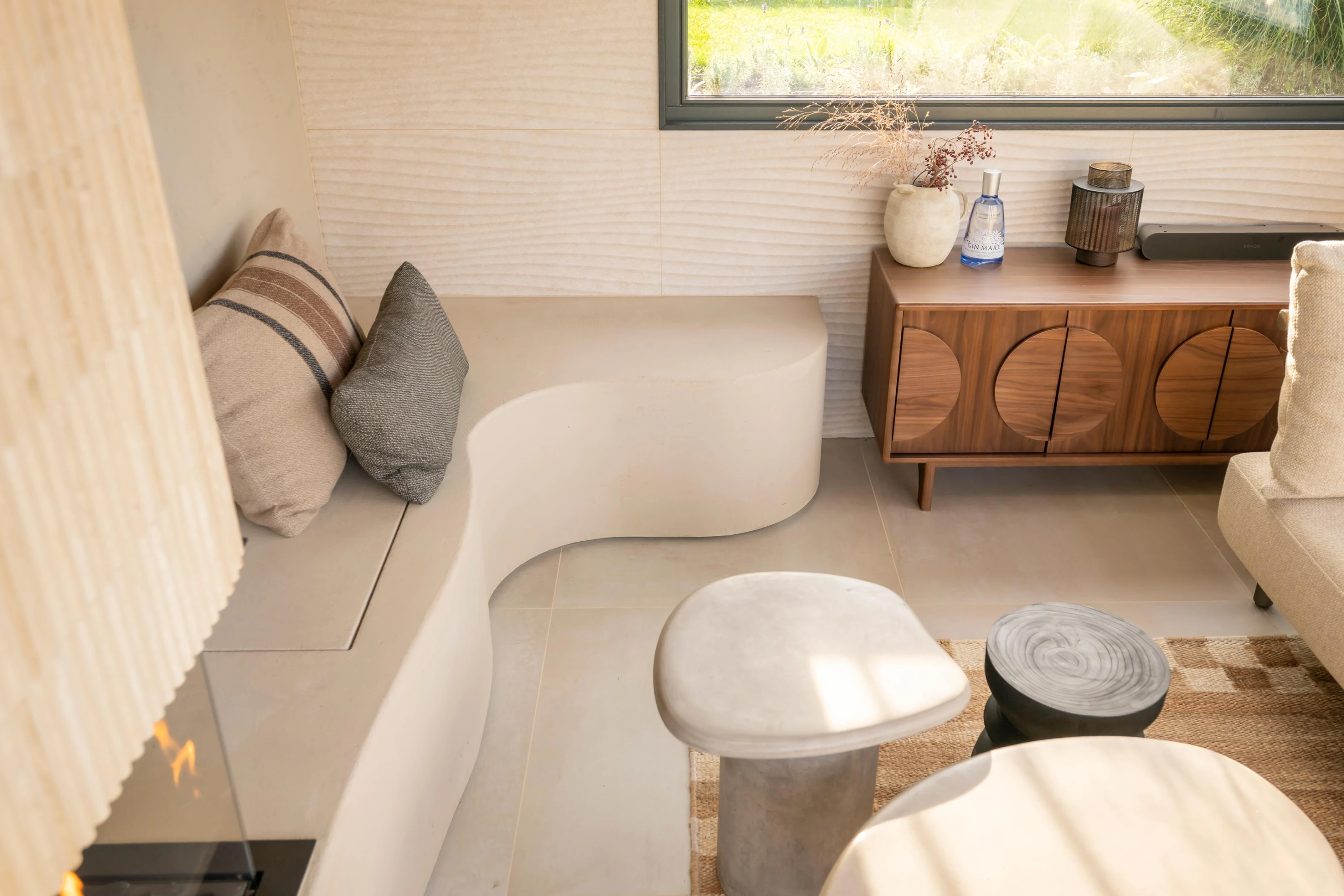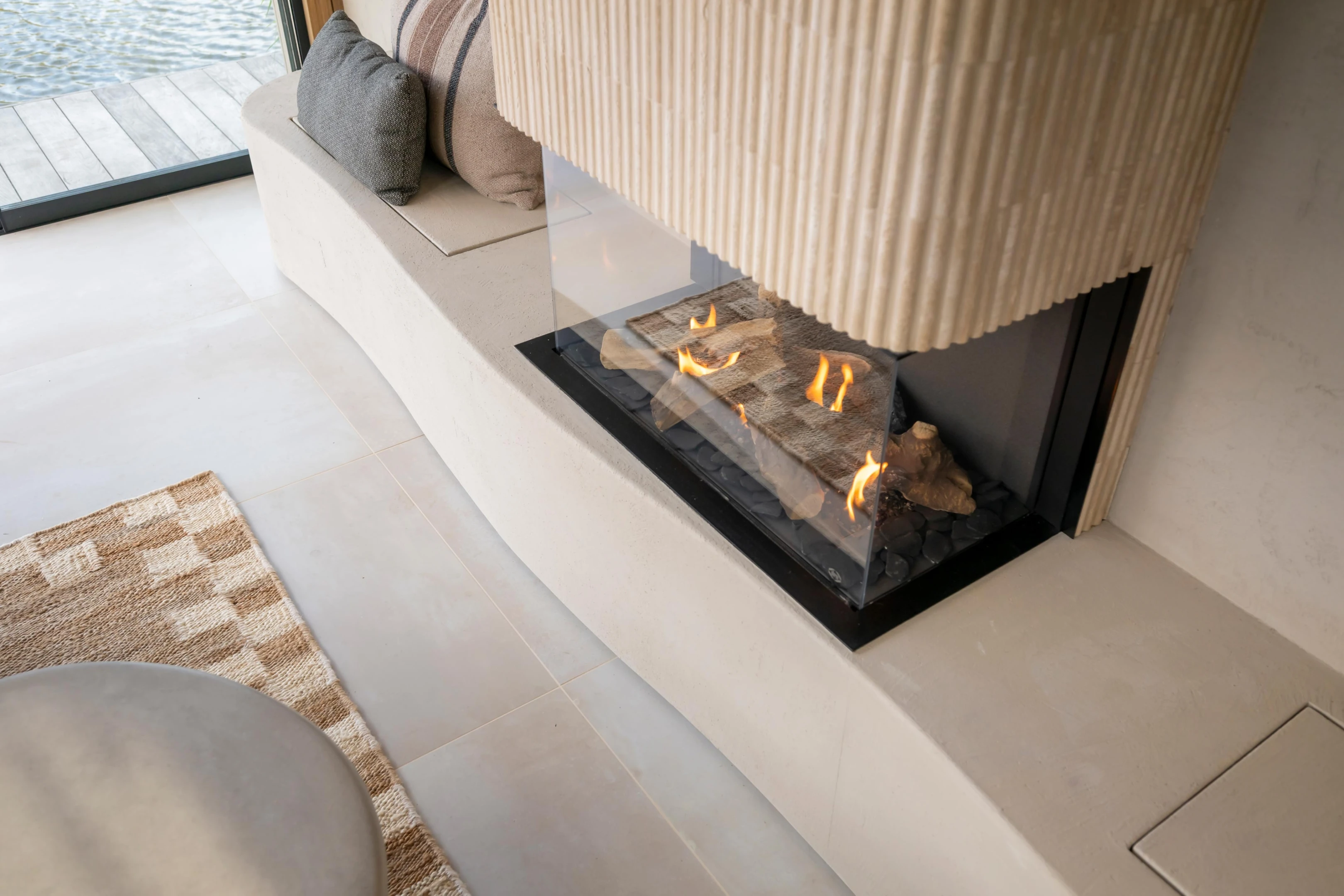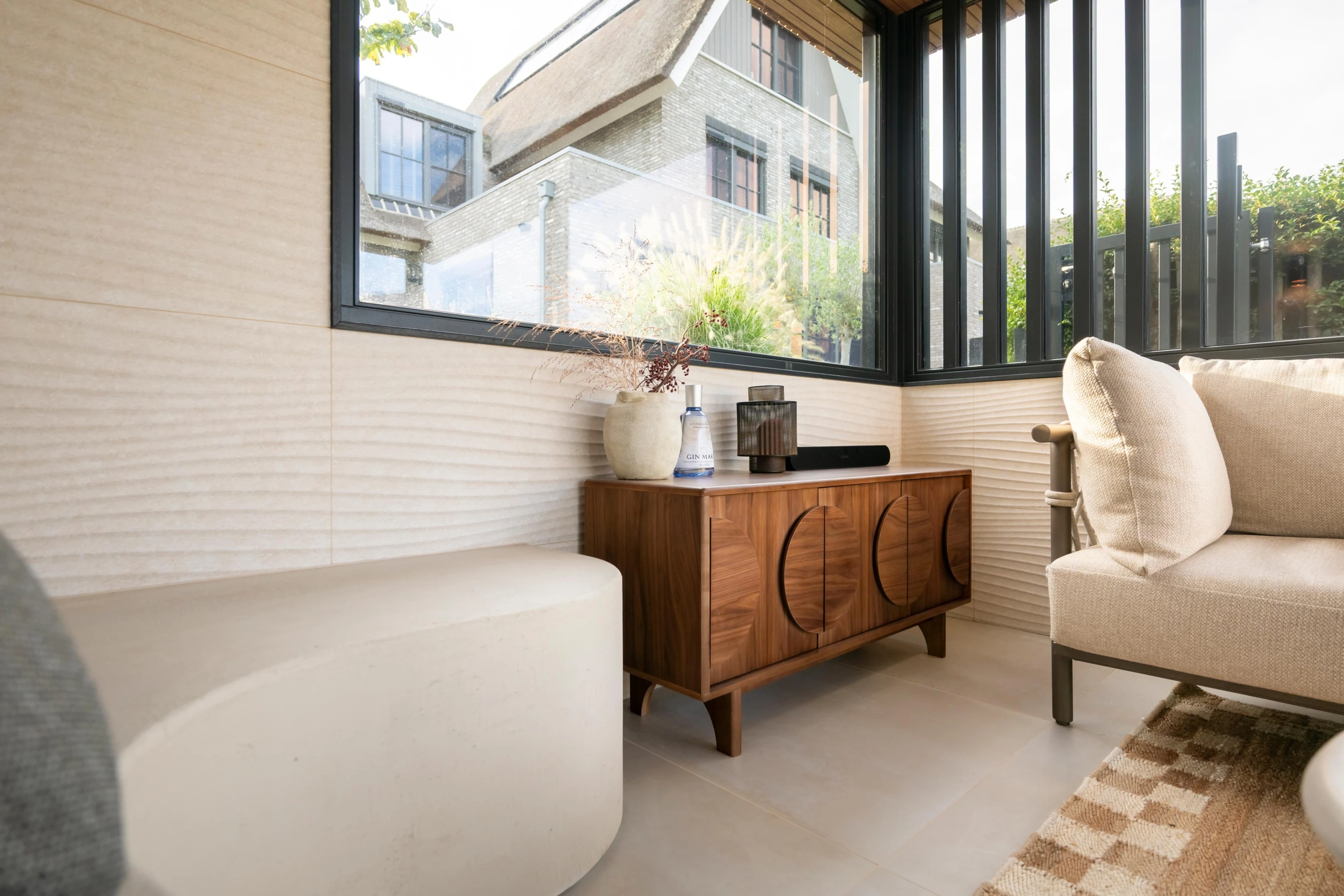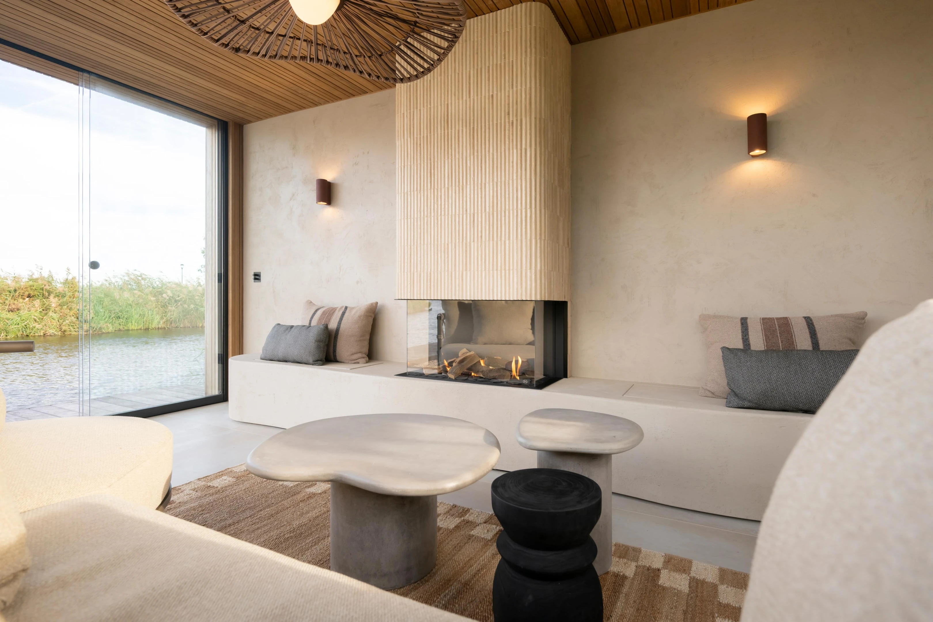 Binnen vormt de glooiende zitbank met haard het hart van de ruimte. De bank is uitgevoerd in designstuc met zachte, ronde lijnen die het interieur vormgeven. De driezijdige haard is niet alleen een sfeerpunt, het verwarmt de hele buitenkamer. De haardkolom is bekleed met verticale mozaïektegels die diepte geven aan het geheel. De overige wanden zijn voorzien van tegels, het plafond is van hout. Samen zorgen ze voor een warme, natuurlijke uitstraling die past bij de omgeving.
