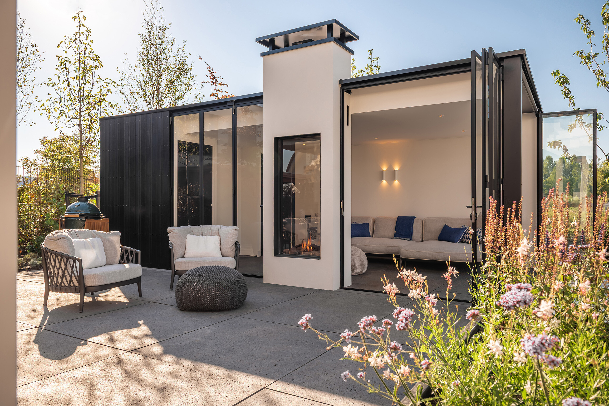 Deze tuinkamer vervult tegelijkertijd de functie als volwaardig poolhouse. Voorzien van een prachtige Element haard is het echt thuiskomen. Zeker na een frisse duik in het zwembad biedt de tuinkamer een heerlijke plek om even van de rust te genieten.