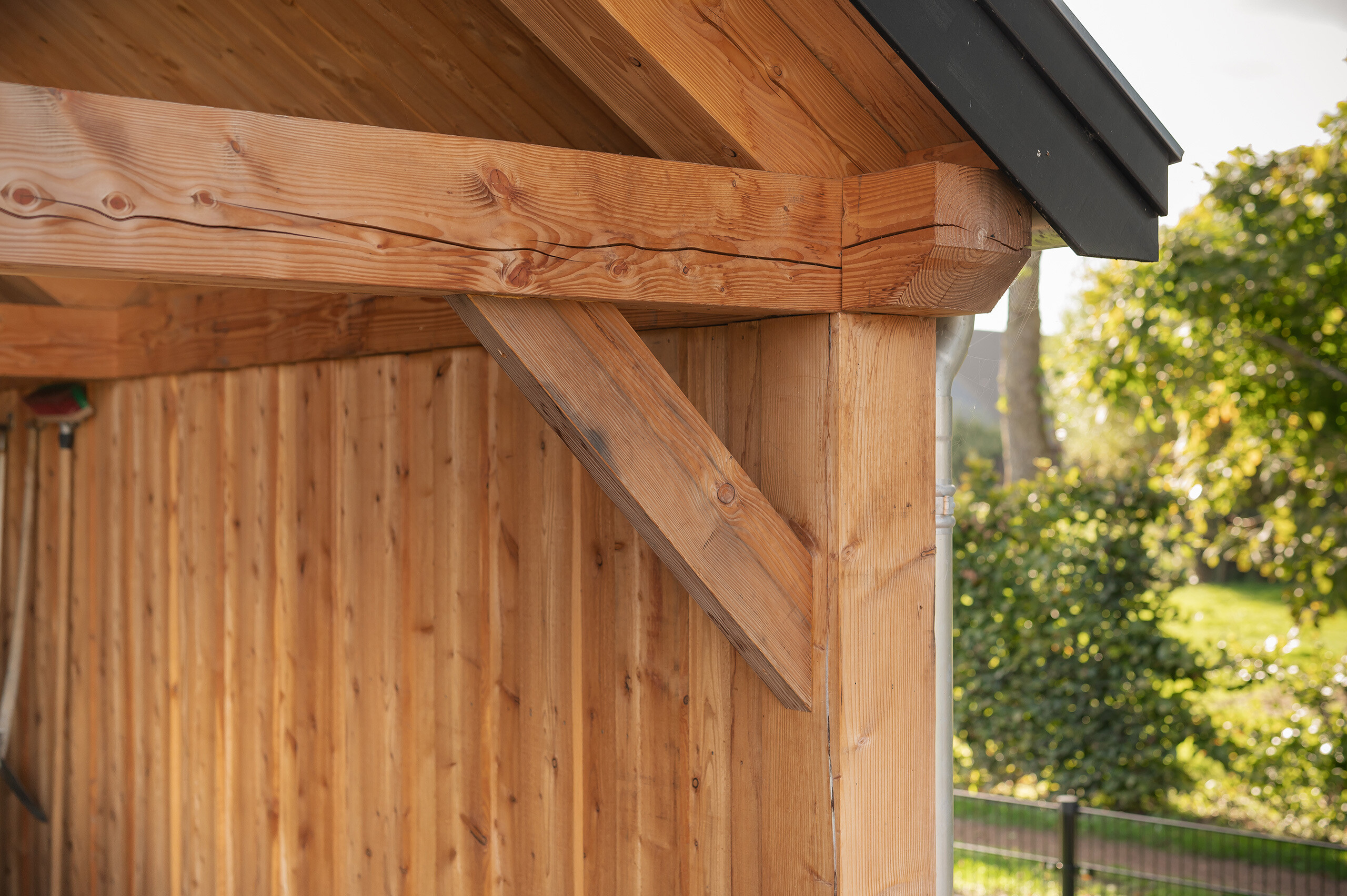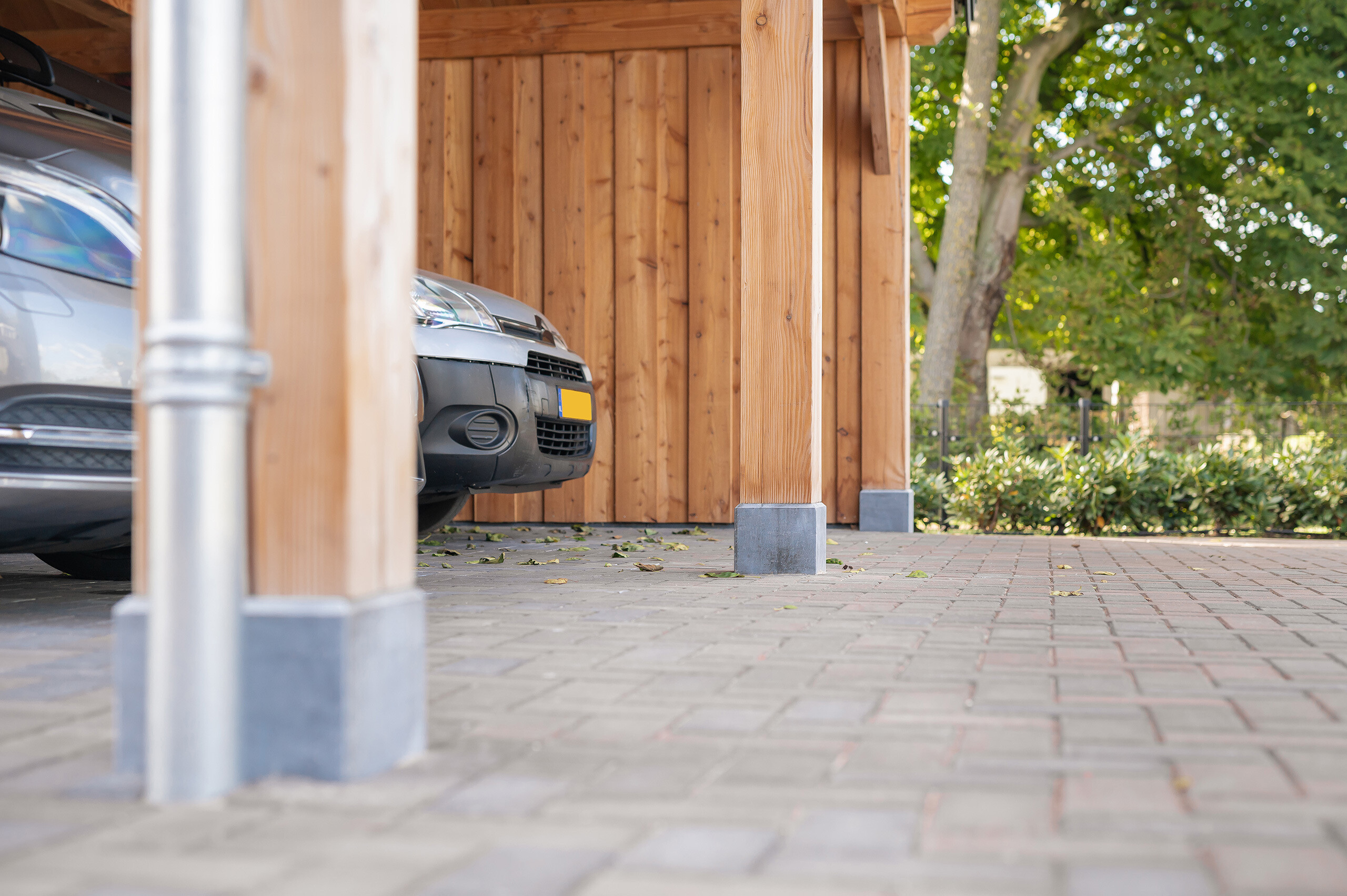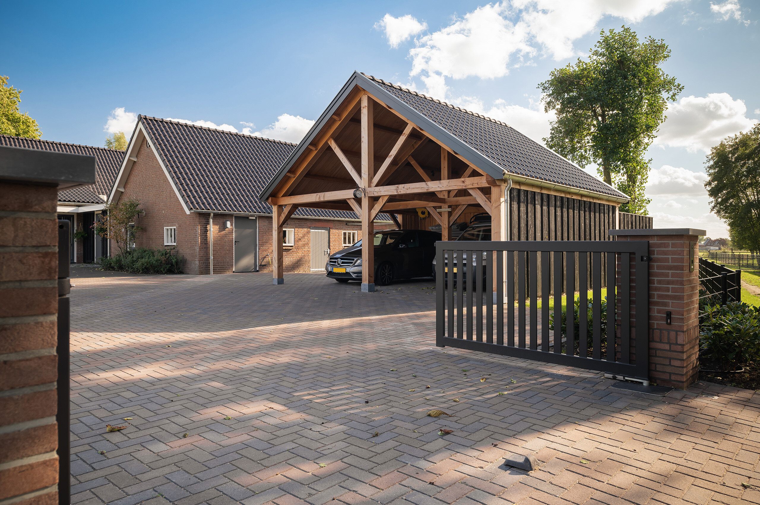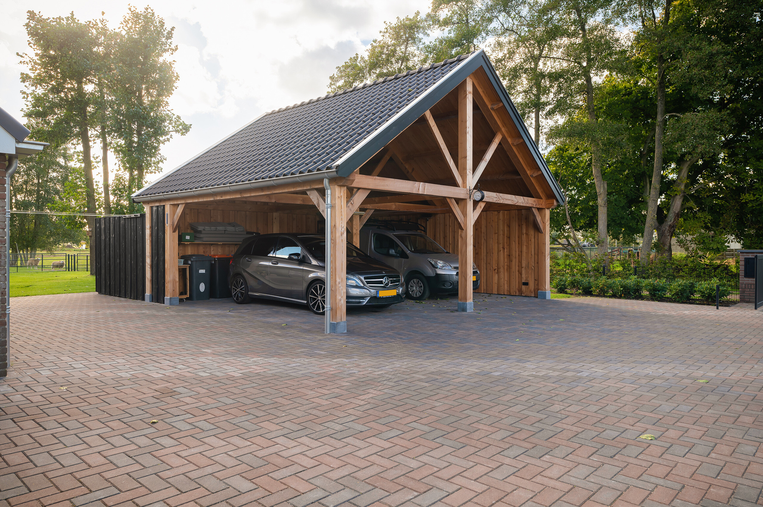 Deze luxe carport is een echte blikvanger. De robuuste Douglas constructie is gebouwd op een betonfundering met hardstenen sokkels.