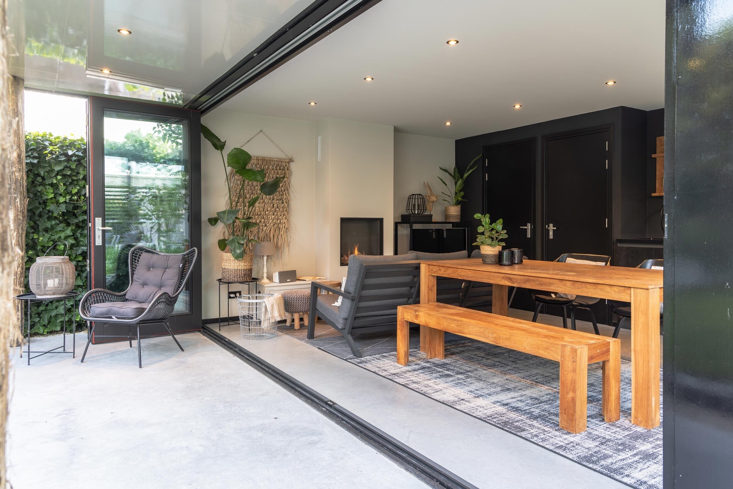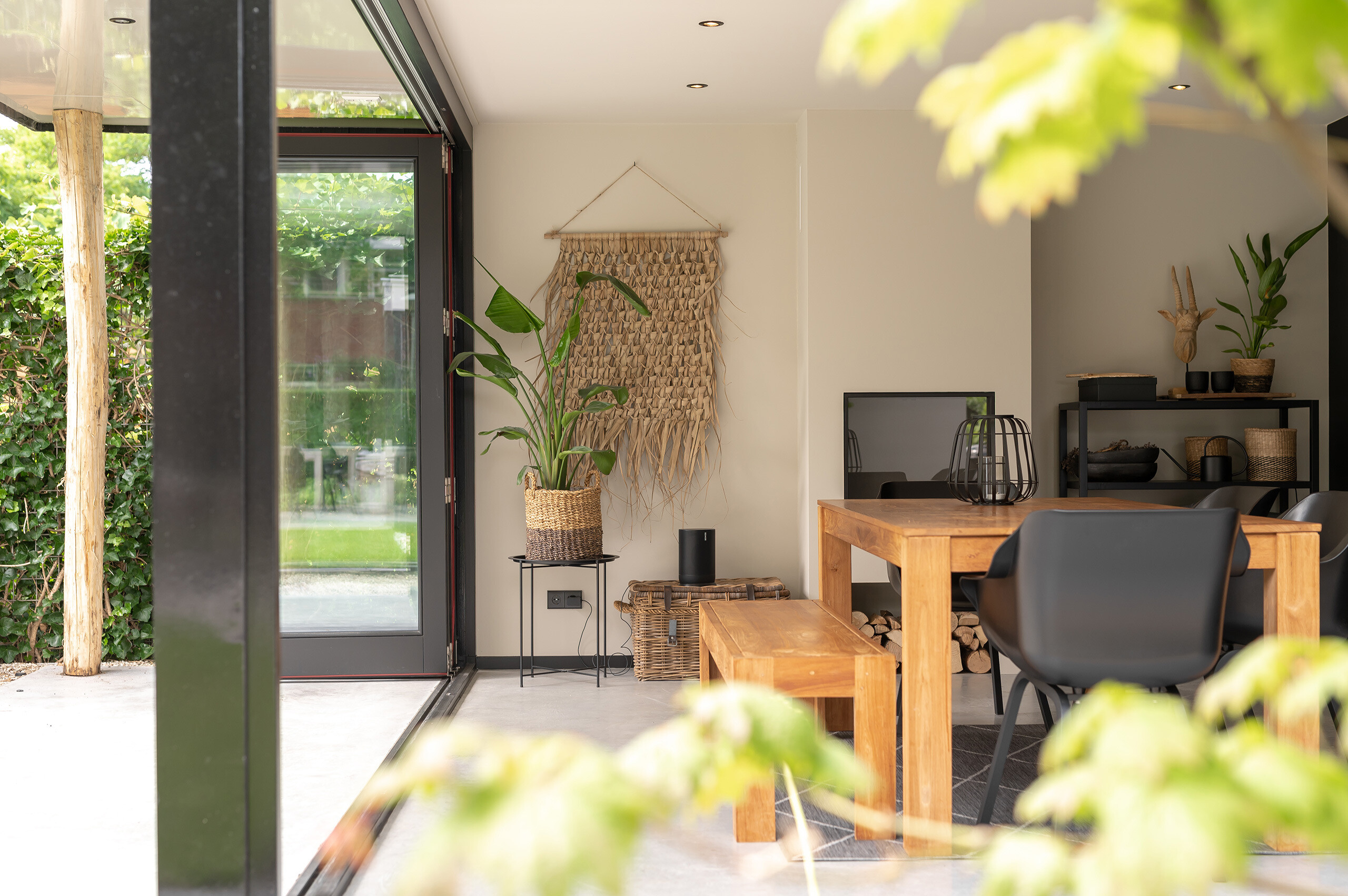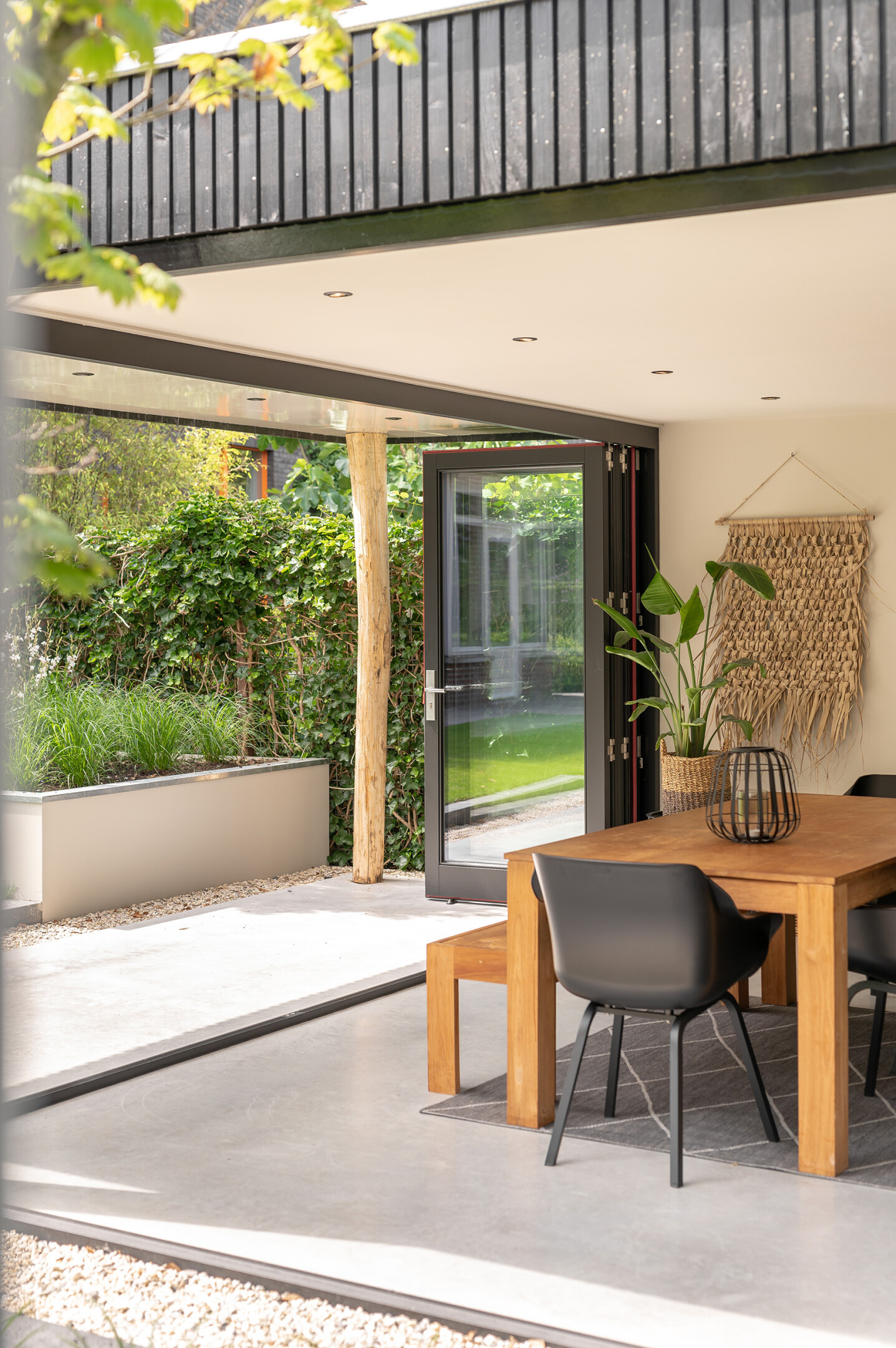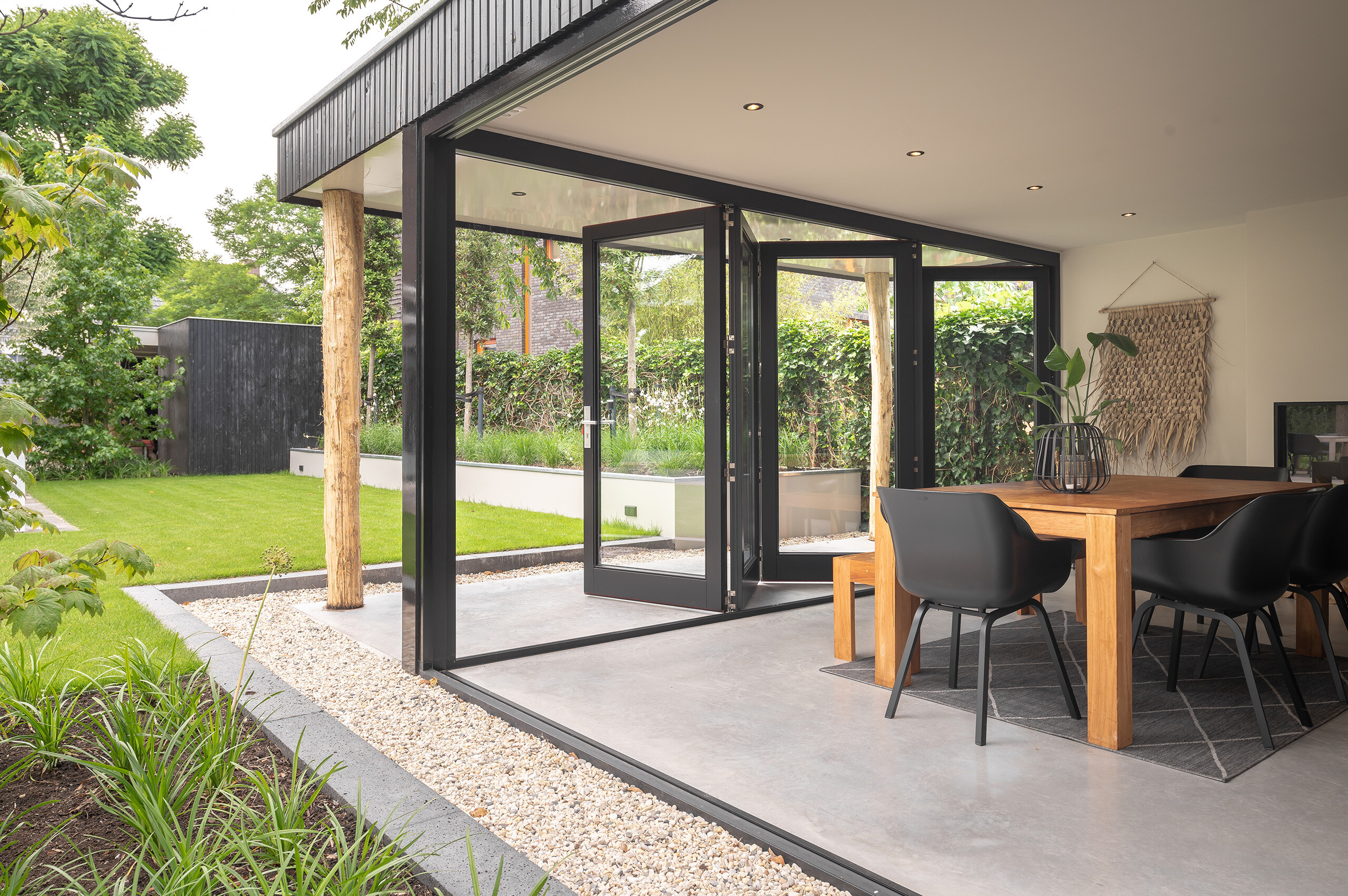 Wat misschien wel het meest opvalt is de vouwwand. De glazen pui is namelijk volledig vouwbaar zodat je het per seizoen, per dag, per moment kan aanpassen. Het glas heeft ook een hoge isolatiewaarde waardoor je er in de winter ook heerlijk kan zitten met de kachel aan.