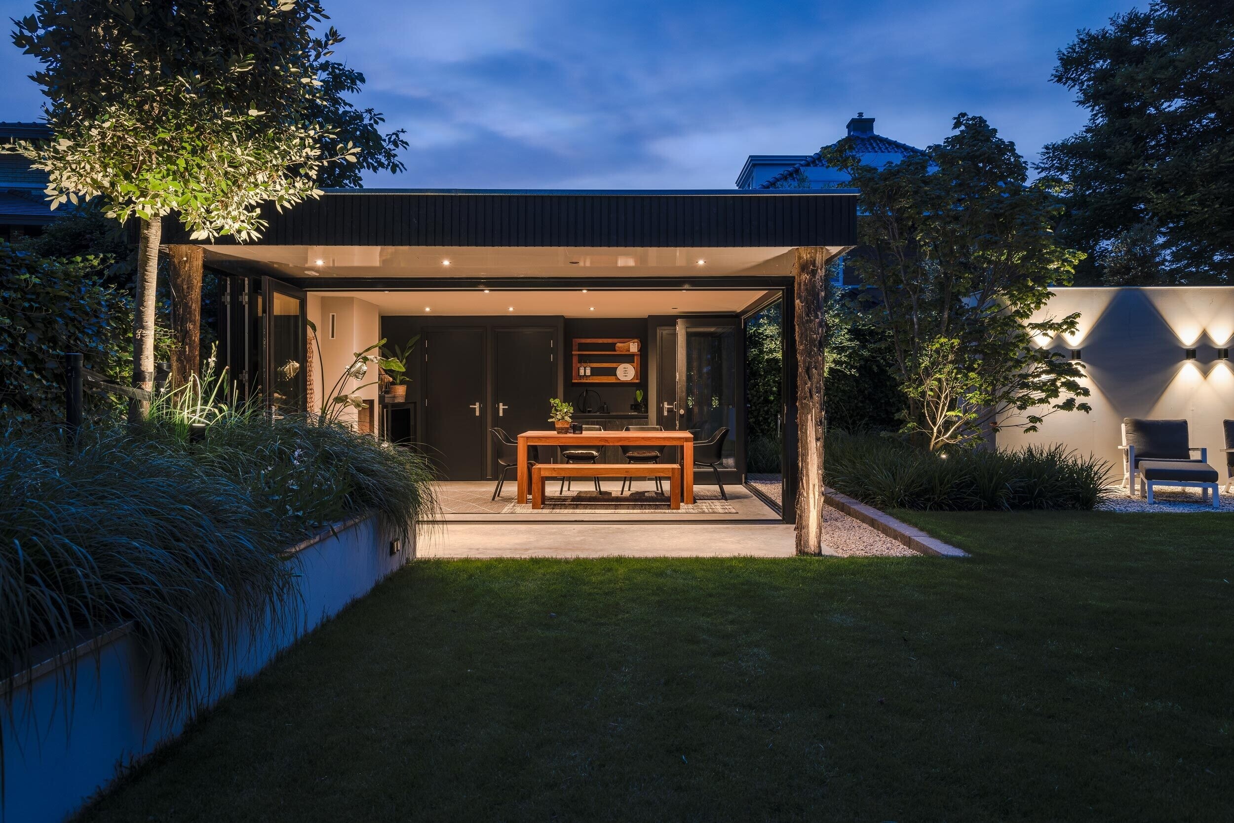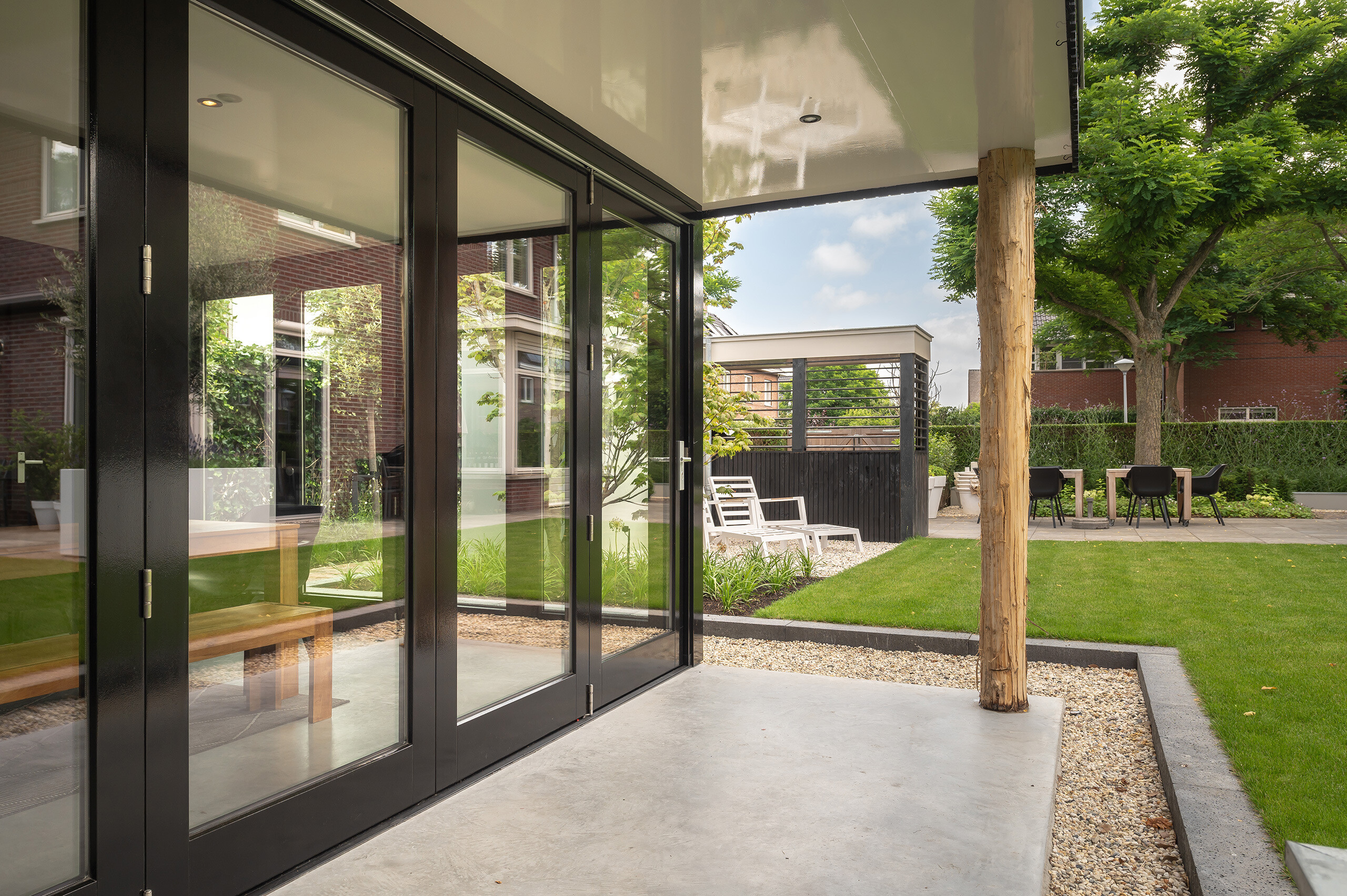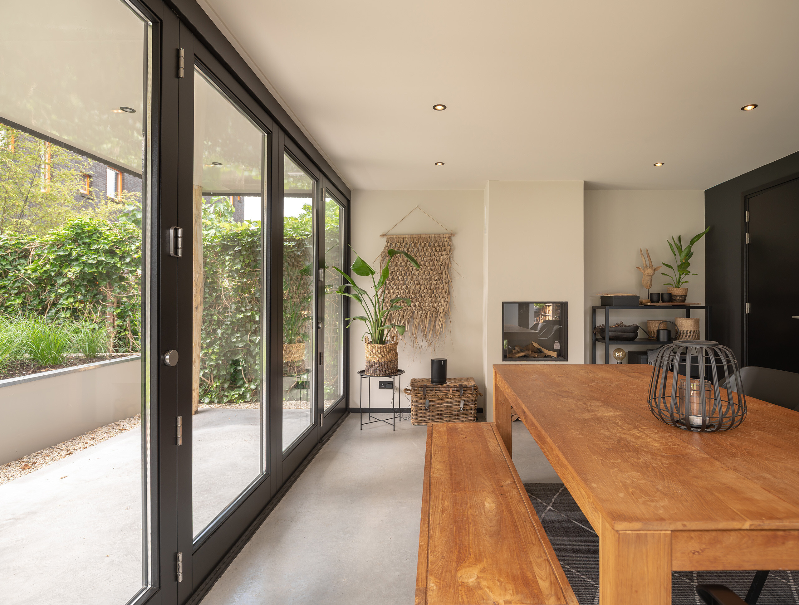 Wat misschien wel het meest opvalt is de vouwwand. De glazen pui is namelijk volledig vouwbaar zodat je het per seizoen, per dag, per moment kan aanpassen. Het glas heeft ook een hoge isolatiewaarde waardoor je er in de winter ook heerlijk kan zitten met de kachel aan.