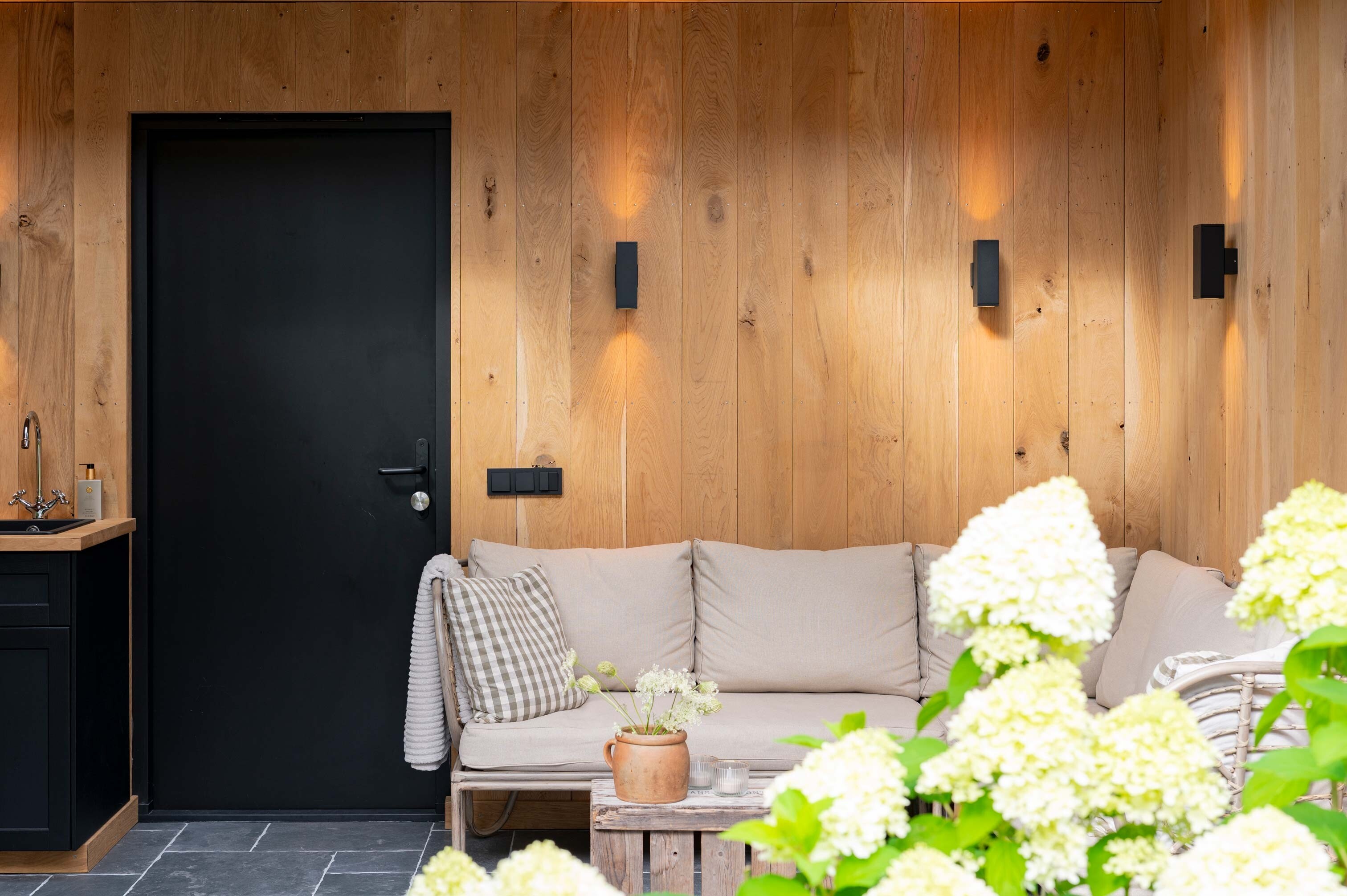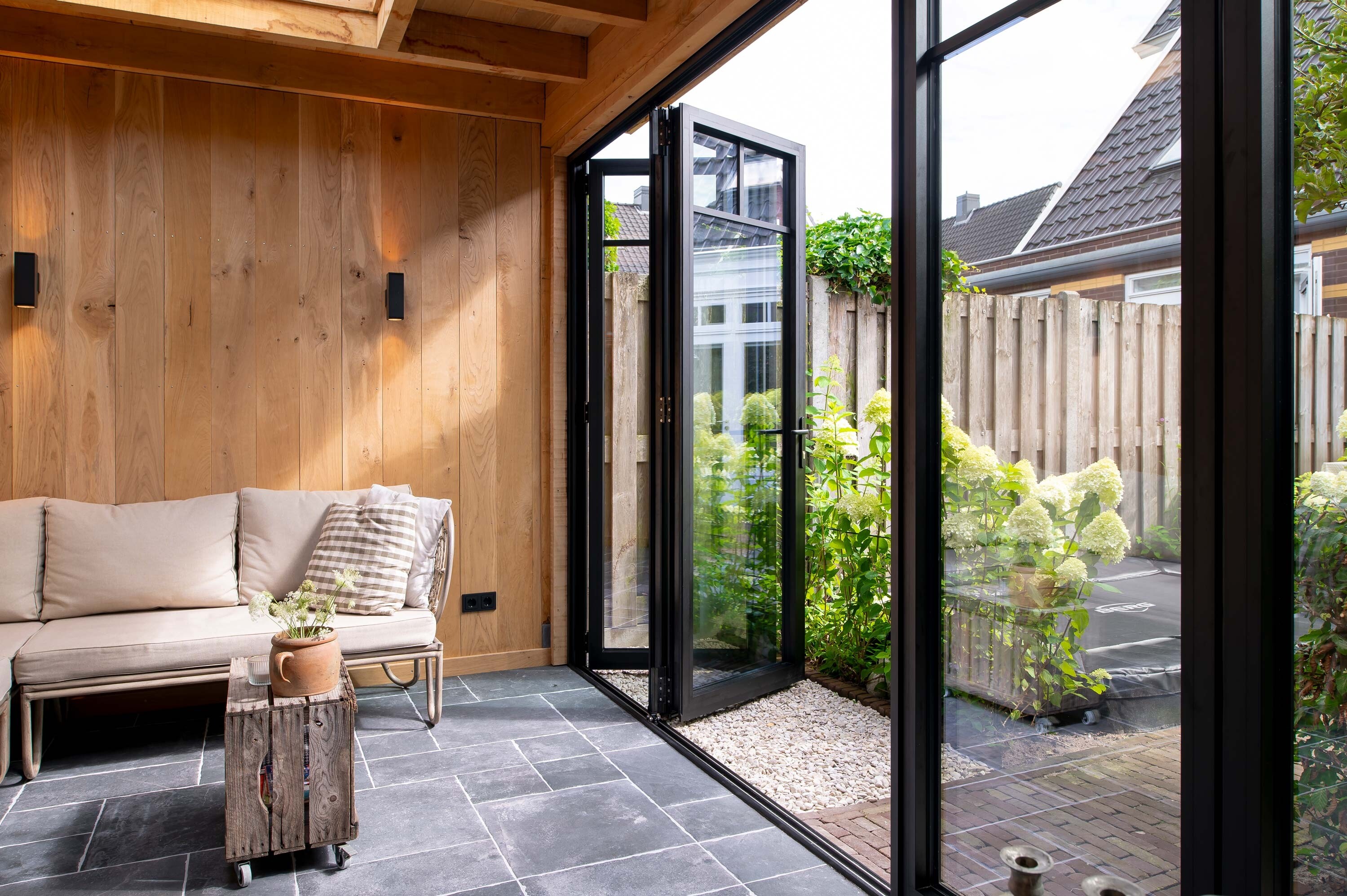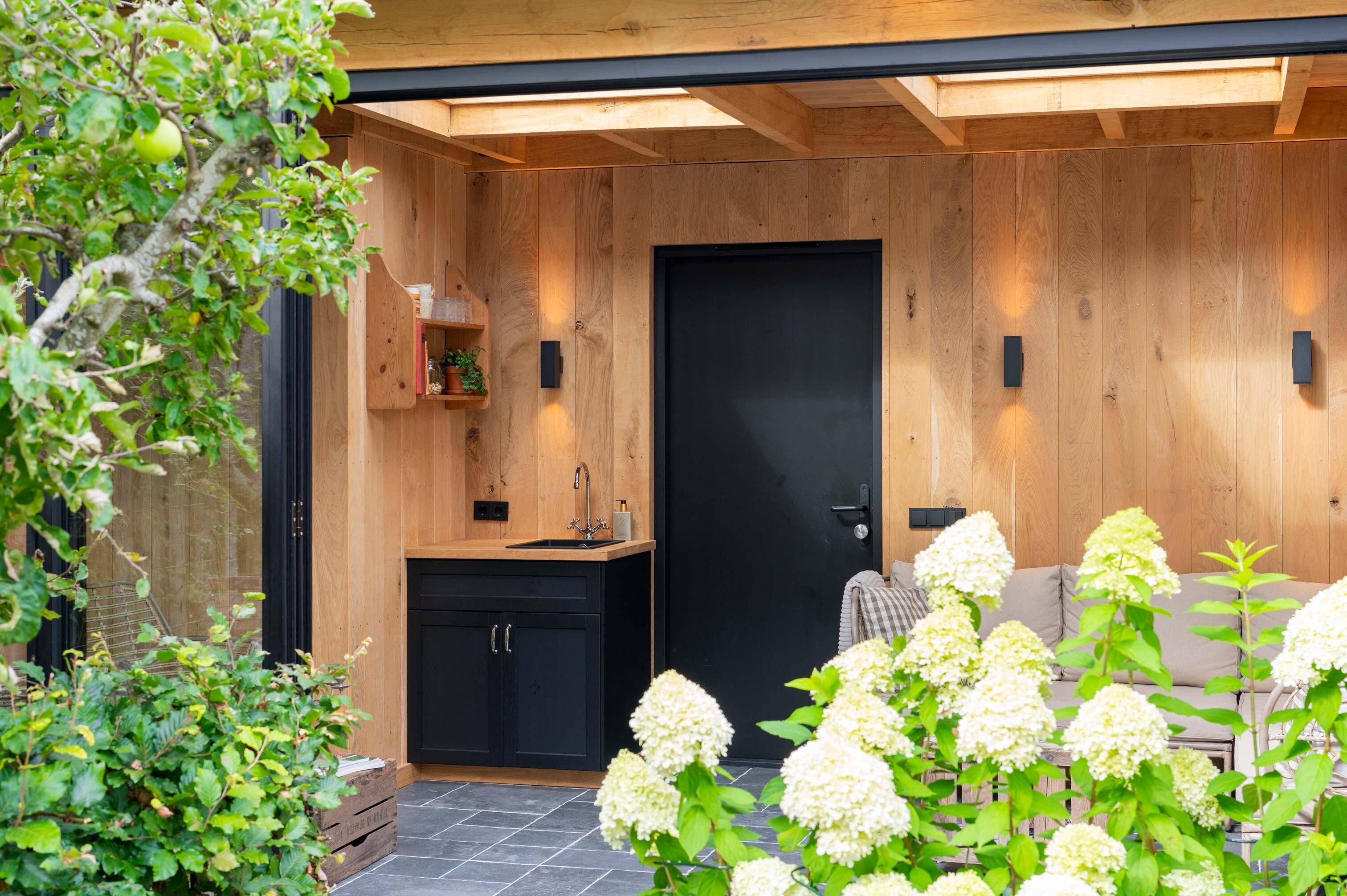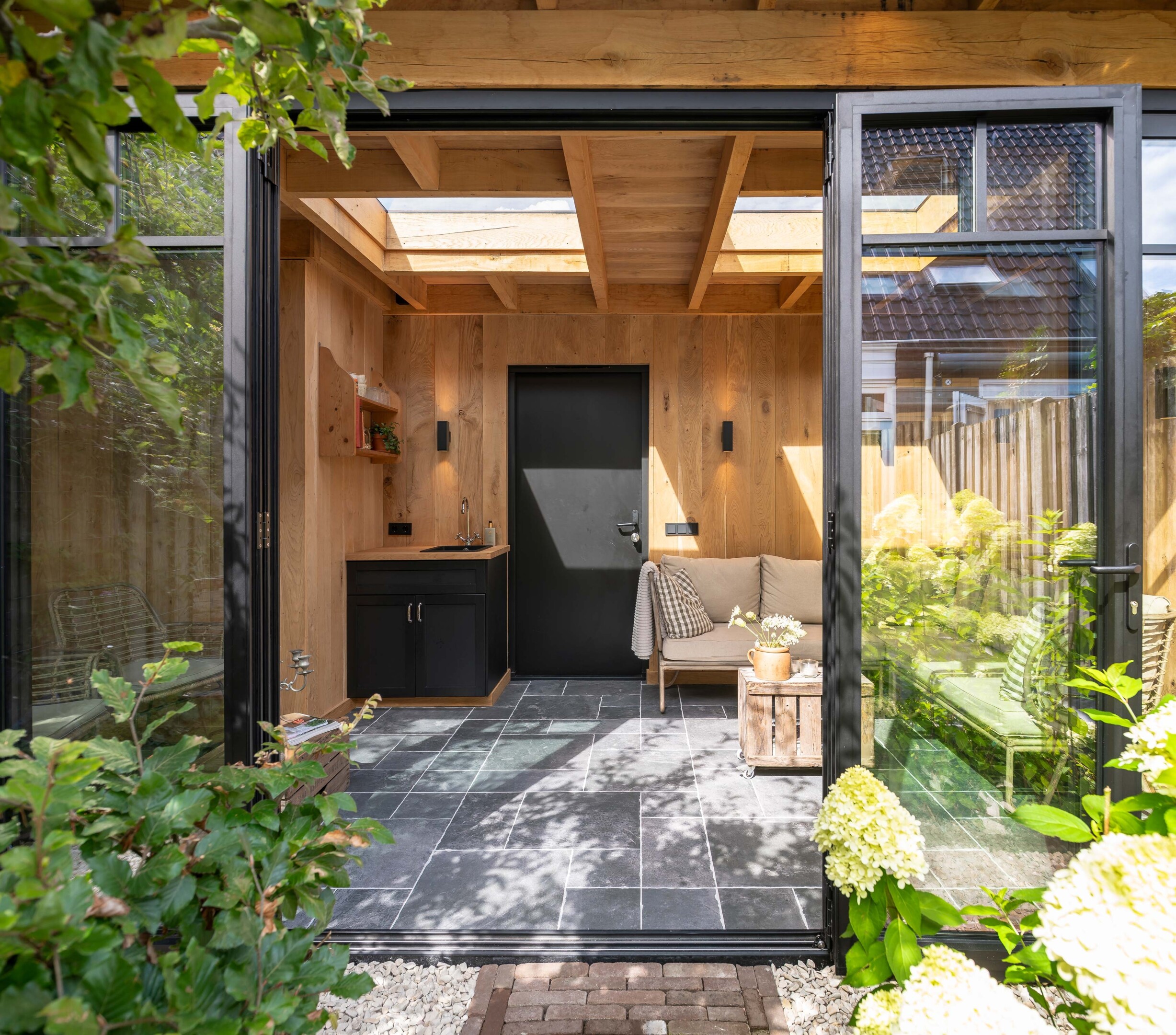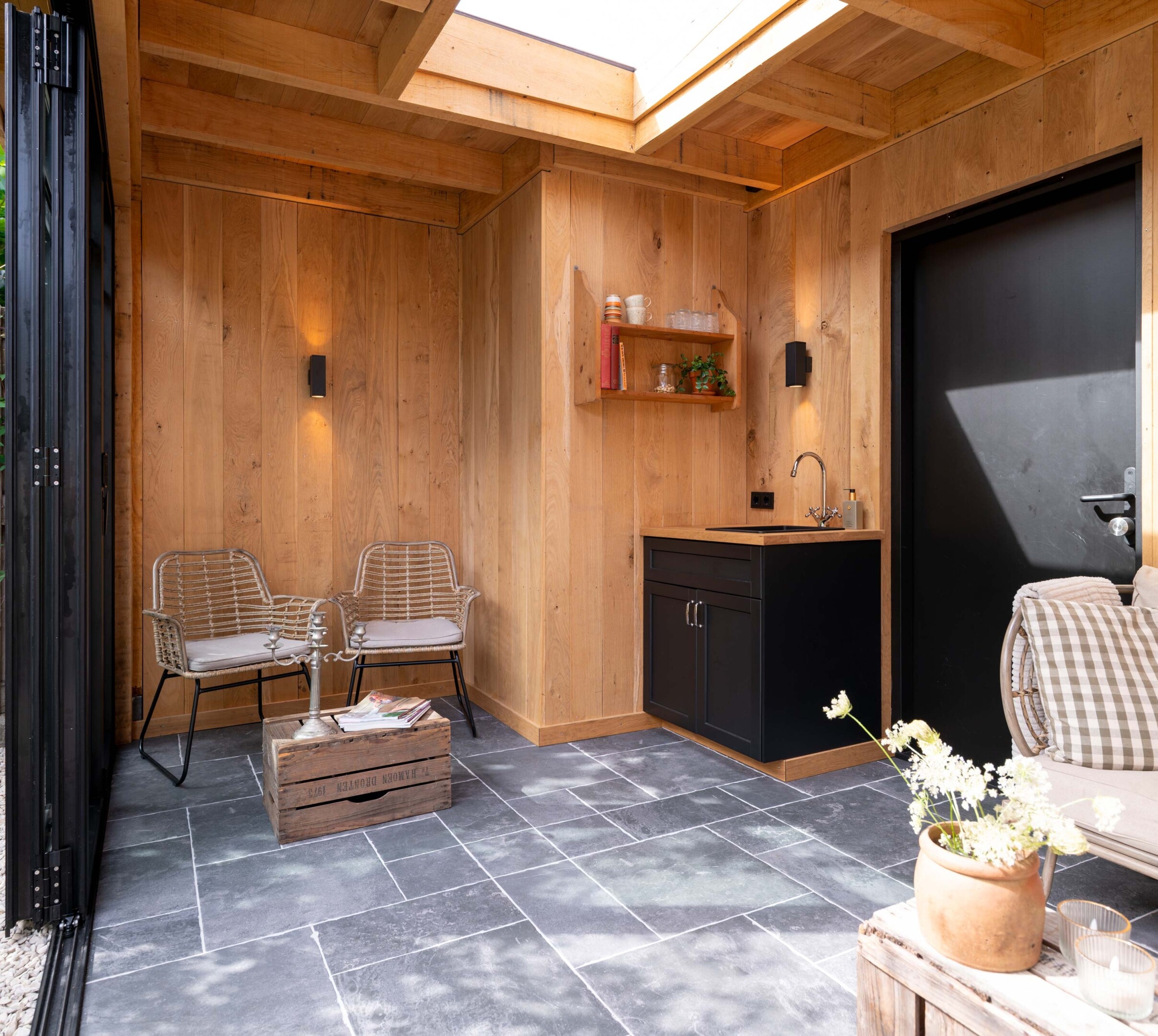 Deze buitenkamer is van fundering tot dak volledig geïsoleerd, waardoor het bouwwerk het hele jaar door comfortabel te gebruiken is. Zelfs de vouwwand en de twee daklichten zijn geïsoleerd: dat levert volop daglicht en tegelijk een aangenaam binnenklimaat. Het eikenhout geeft de ruimte een robuuste, natuurlijke beleving, terwijl de plavuizen vloer zorgt voor een strakke en onderhoudsvriendelijke afwerking. Dankzij het compacte keukenblok is de tuinkamer ook praktisch ingericht voor dagelijks gebruik. Zo ontstaat een stijlvolle tweede woonkamer in de tuin, met de warmte van eiken en het gemak van modern comfort.