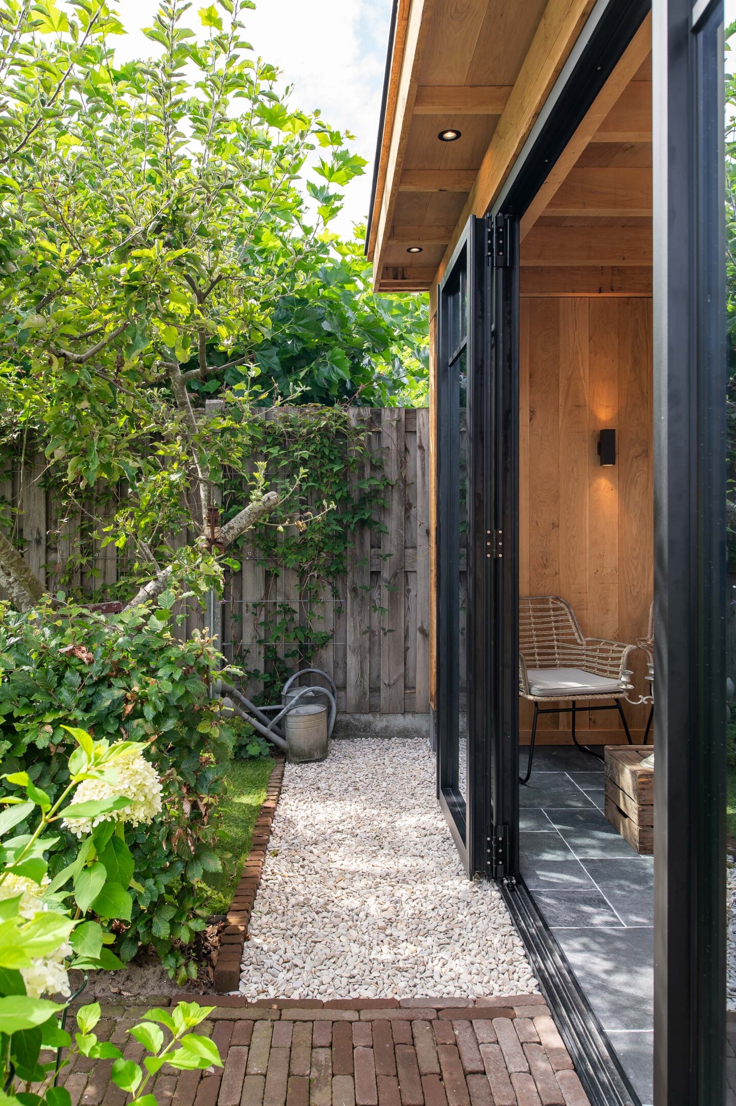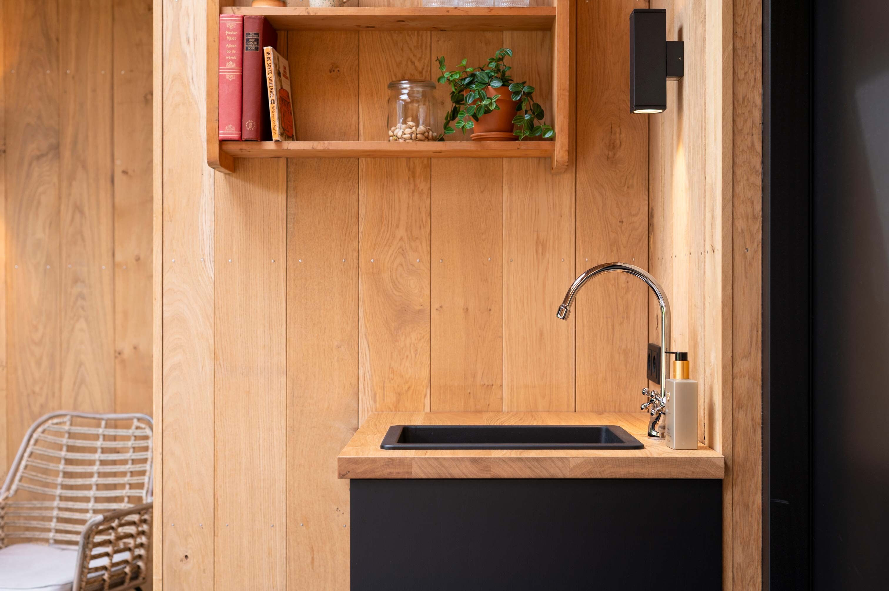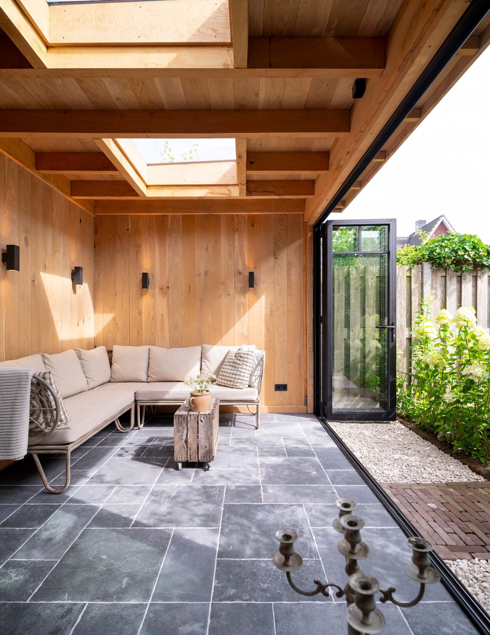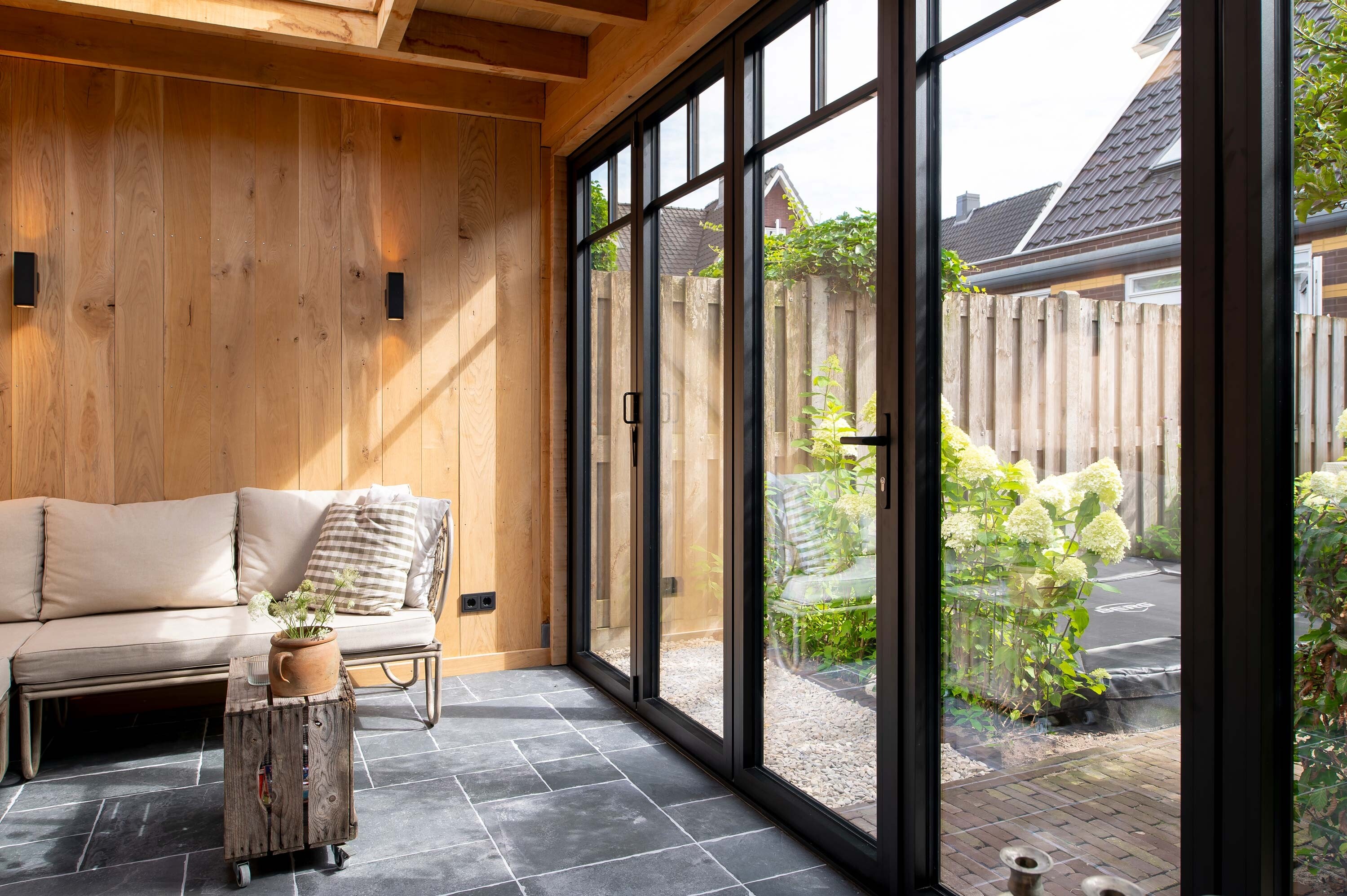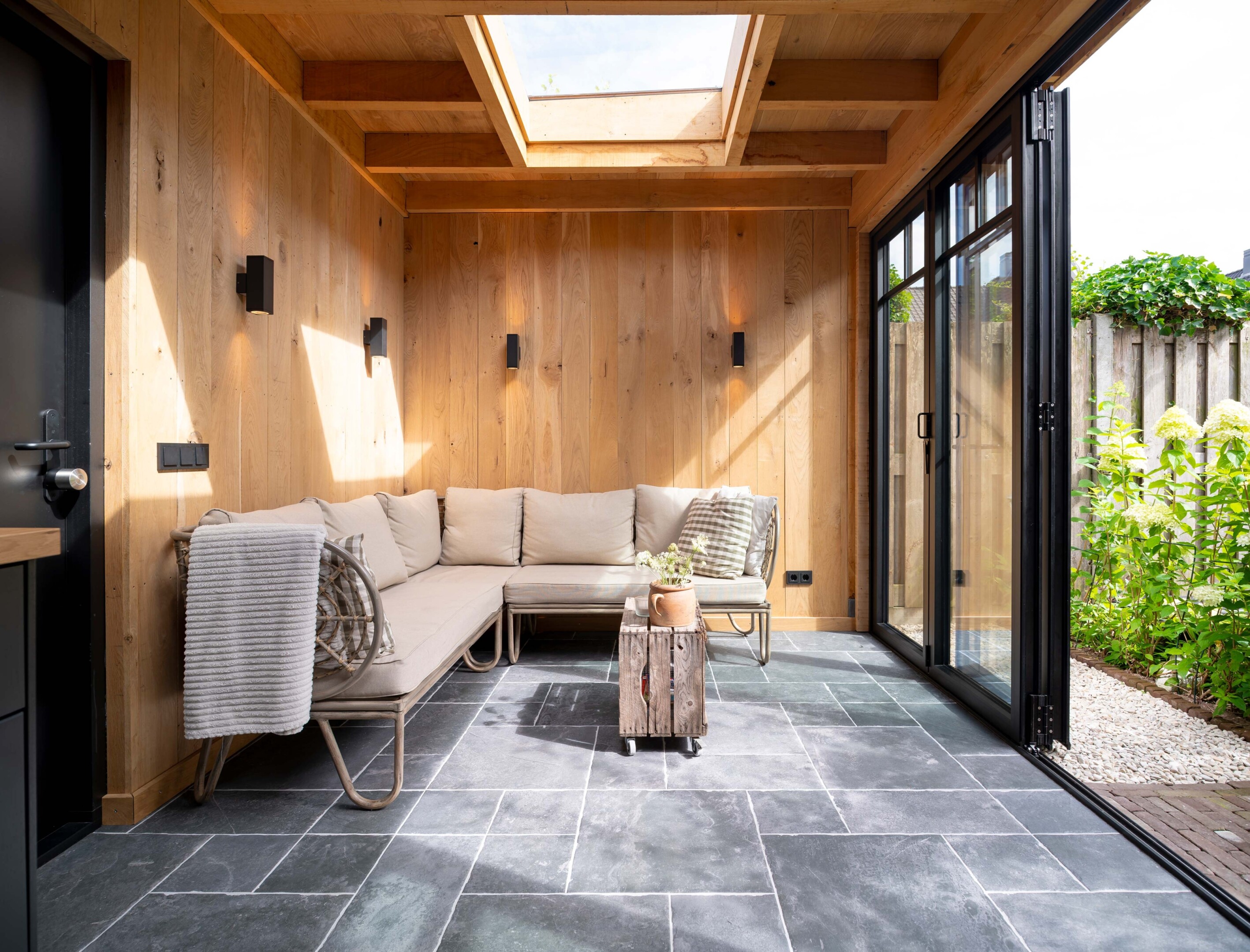 Deze buitenkamer is van fundering tot dak volledig geïsoleerd, waardoor het bouwwerk het hele jaar door comfortabel te gebruiken is. Zelfs de vouwwand en de twee daklichten zijn geïsoleerd: dat levert volop daglicht en tegelijk een aangenaam binnenklimaat. Het eikenhout geeft de ruimte een robuuste, natuurlijke beleving, terwijl de plavuizen vloer zorgt voor een strakke en onderhoudsvriendelijke afwerking. Dankzij het compacte keukenblok is de tuinkamer ook praktisch ingericht voor dagelijks gebruik. Zo ontstaat een stijlvolle tweede woonkamer in de tuin, met de warmte van eiken en het gemak van modern comfort.