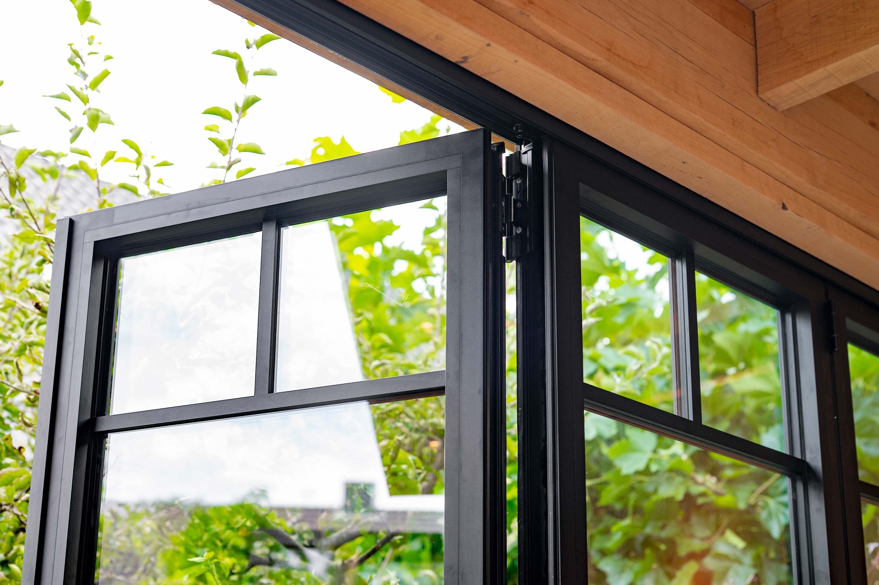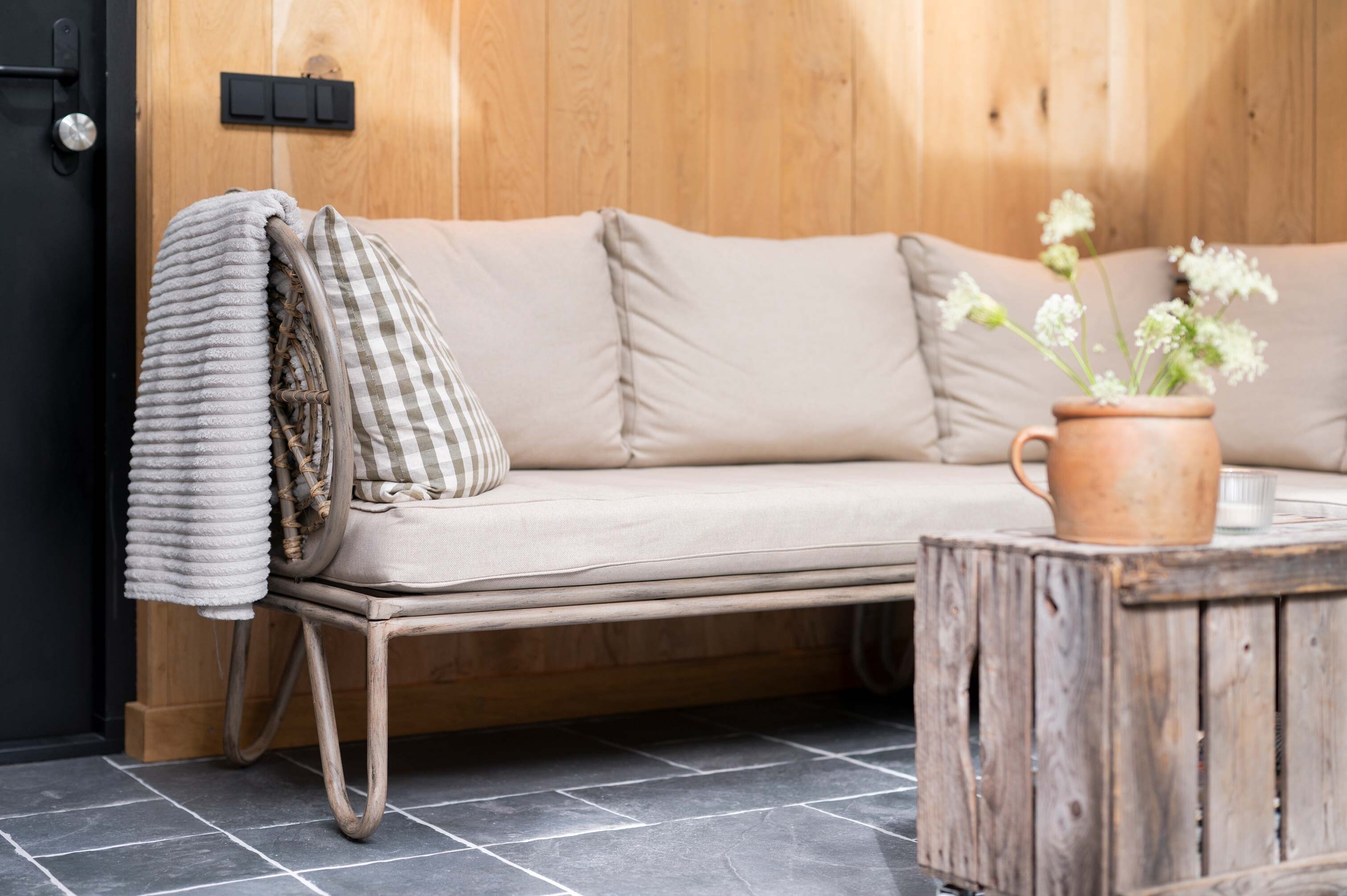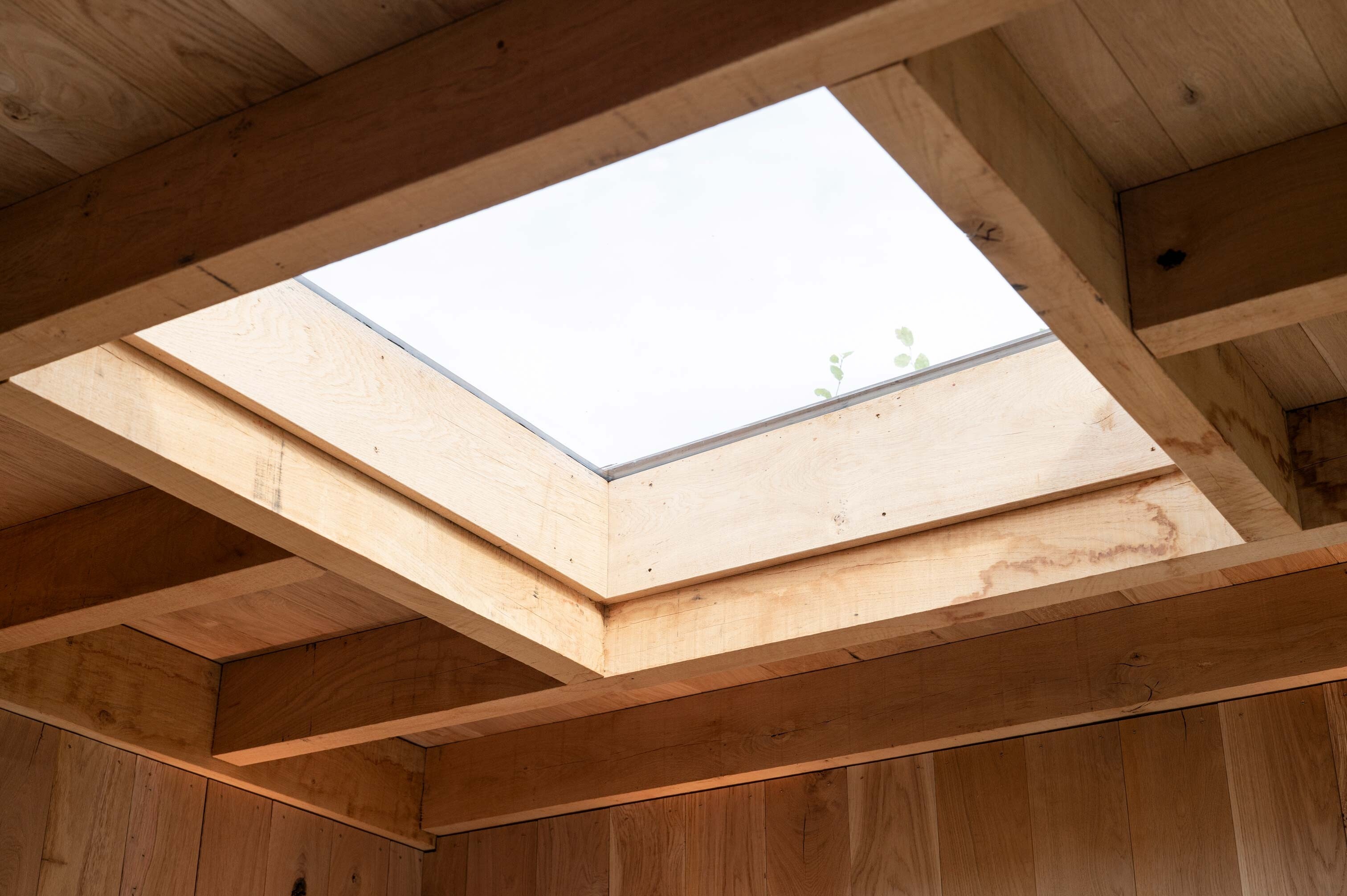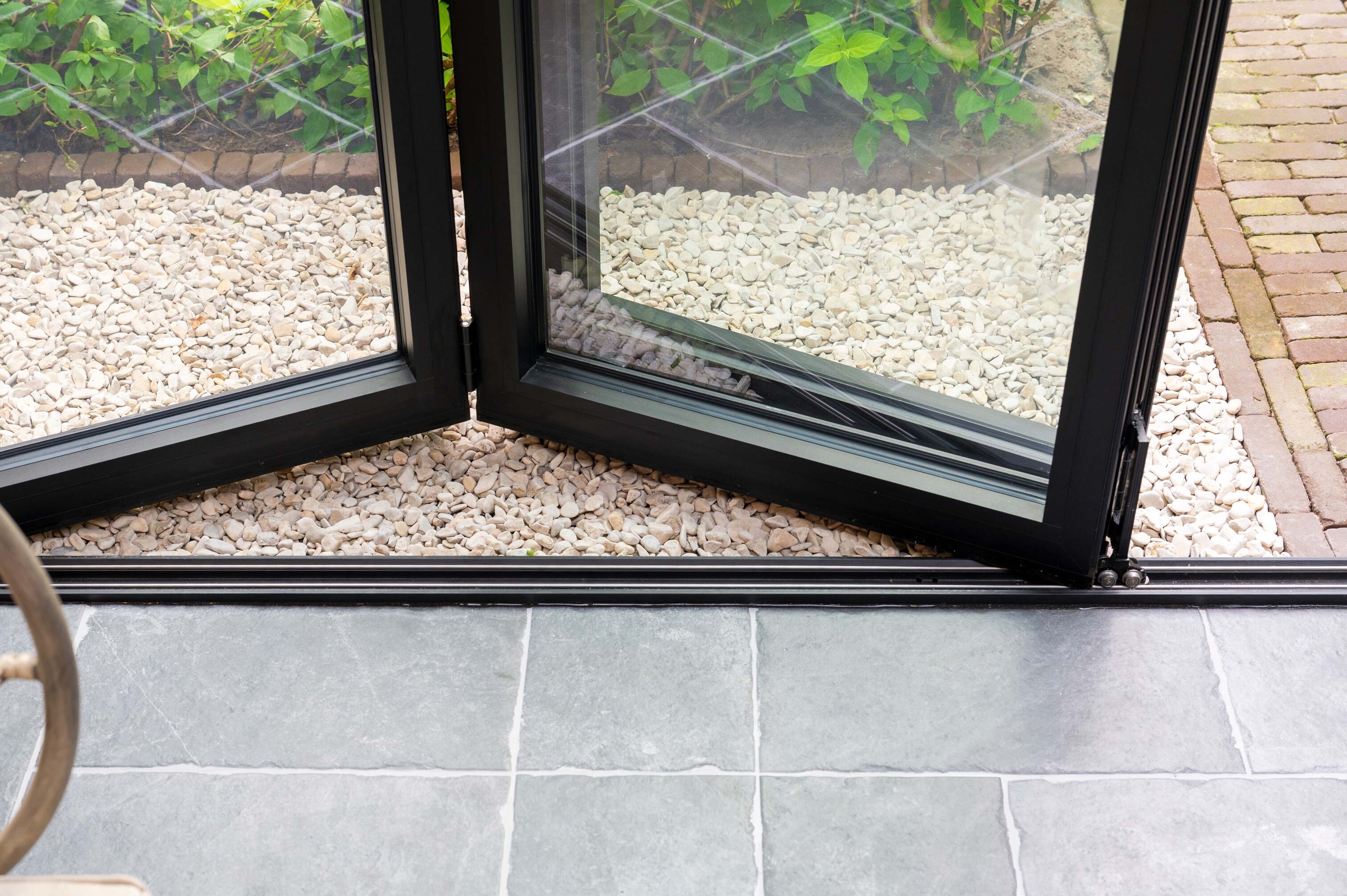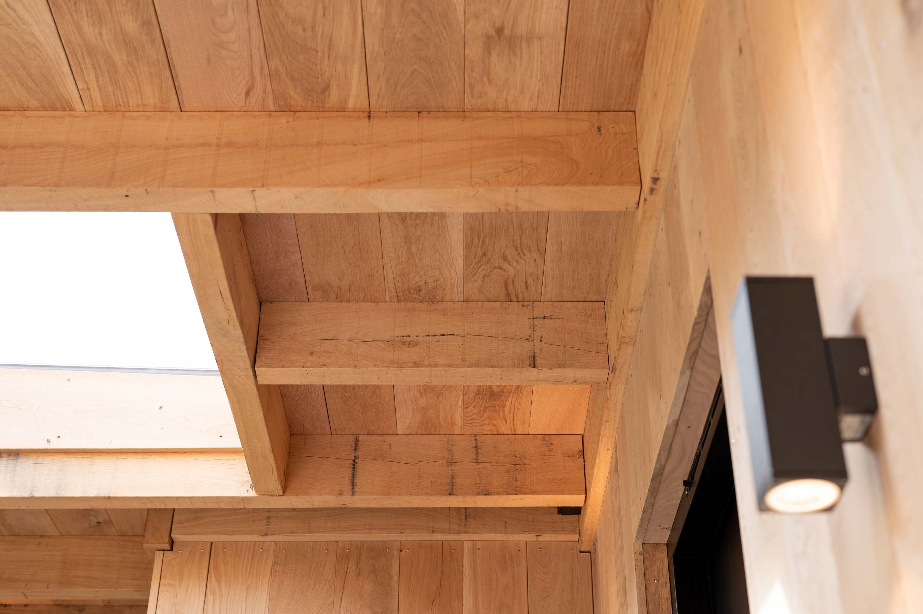 Deze buitenkamer is van fundering tot dak volledig geïsoleerd, waardoor het bouwwerk het hele jaar door comfortabel te gebruiken is. Zelfs de vouwwand en de twee daklichten zijn geïsoleerd: dat levert volop daglicht en tegelijk een aangenaam binnenklimaat. Het eikenhout geeft de ruimte een robuuste, natuurlijke beleving, terwijl de plavuizen vloer zorgt voor een strakke en onderhoudsvriendelijke afwerking. Dankzij het compacte keukenblok is de tuinkamer ook praktisch ingericht voor dagelijks gebruik. Zo ontstaat een stijlvolle tweede woonkamer in de tuin, met de warmte van eiken en het gemak van modern comfort.