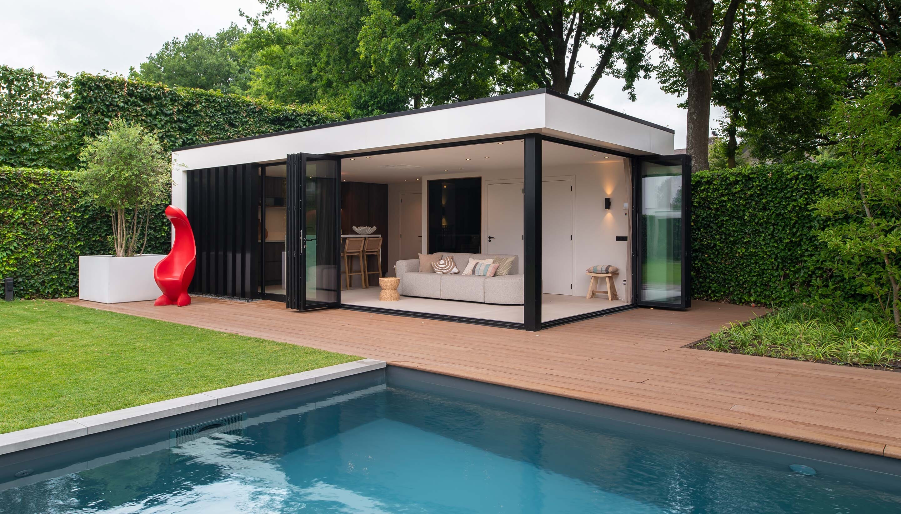 De lijnen van het ontwerp sluiten aan op de voorgevel van het huis. Aan de achterzijde loopt het bouwwerk schuin weg, met een slimme en efficiënte indeling. Zo ontstaat er ruimte voor een maatwerk sauna, een aparte toiletruimte, een inloopdouche en twee techniekruimtes: één voor het zwembad en één als installatieruimte of kast. Dankzij de royale isolatie (200 mm) is het binnen altijd comfortabel, zonder geluidsoverlast naar buiten.