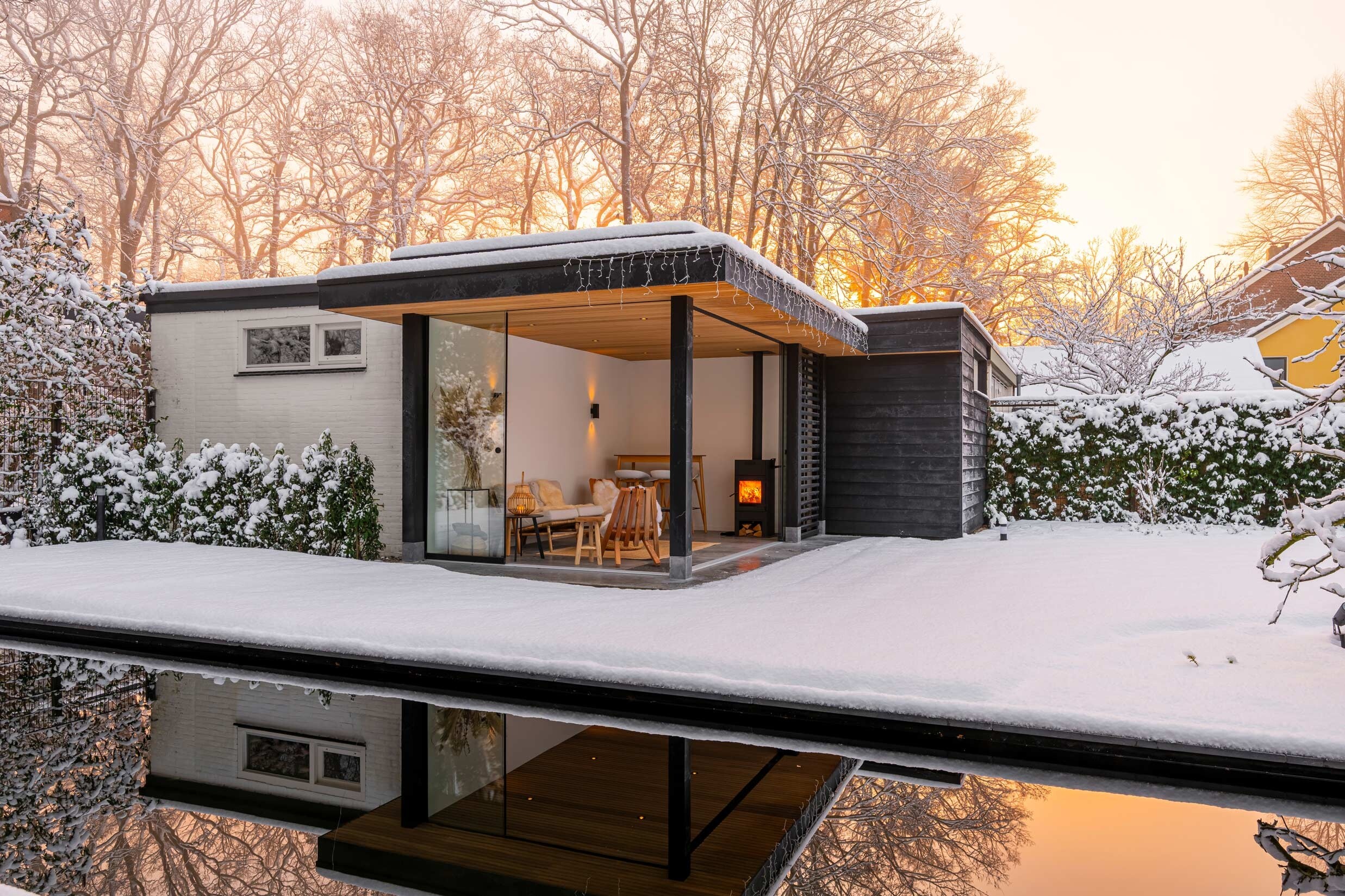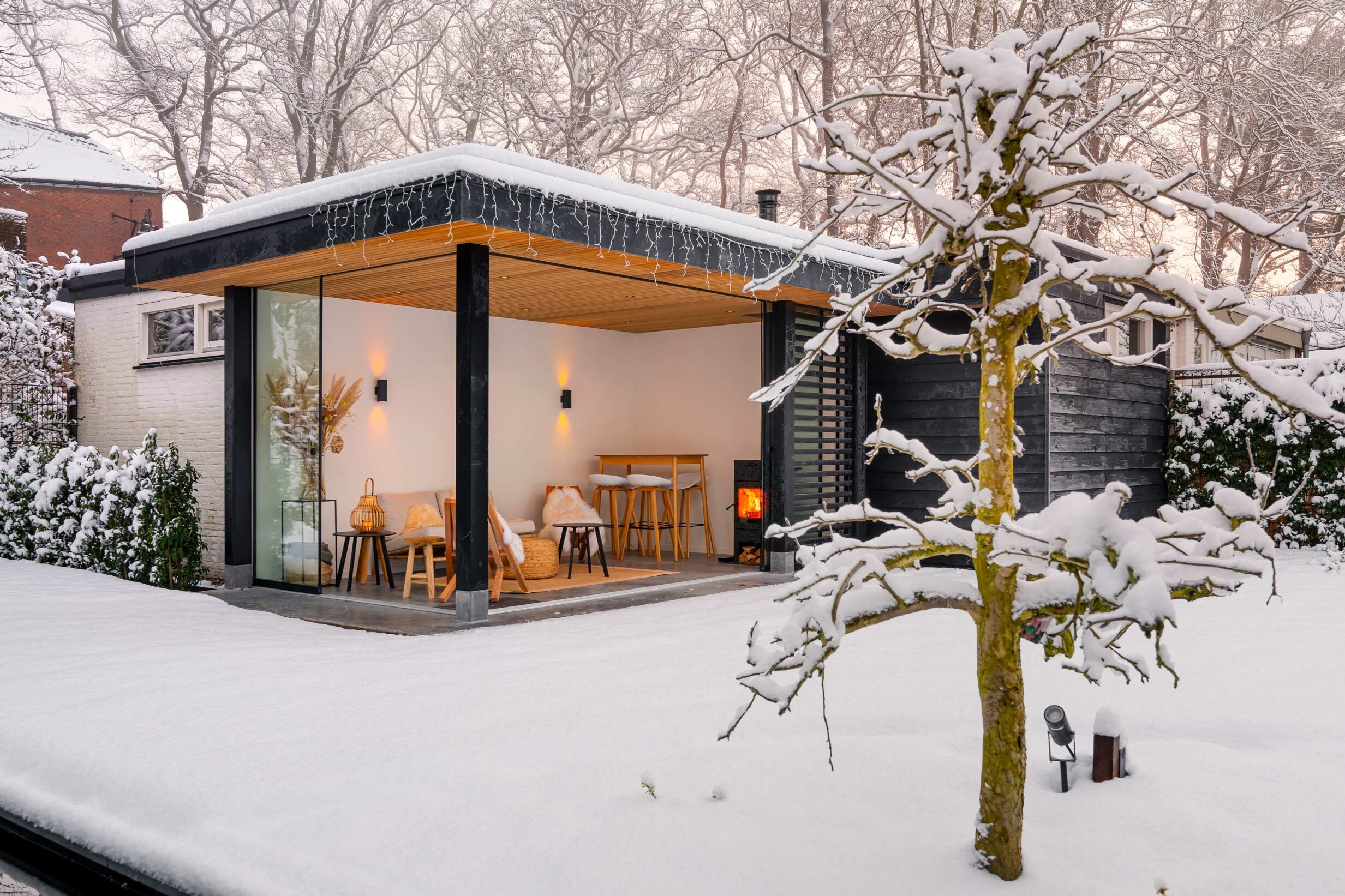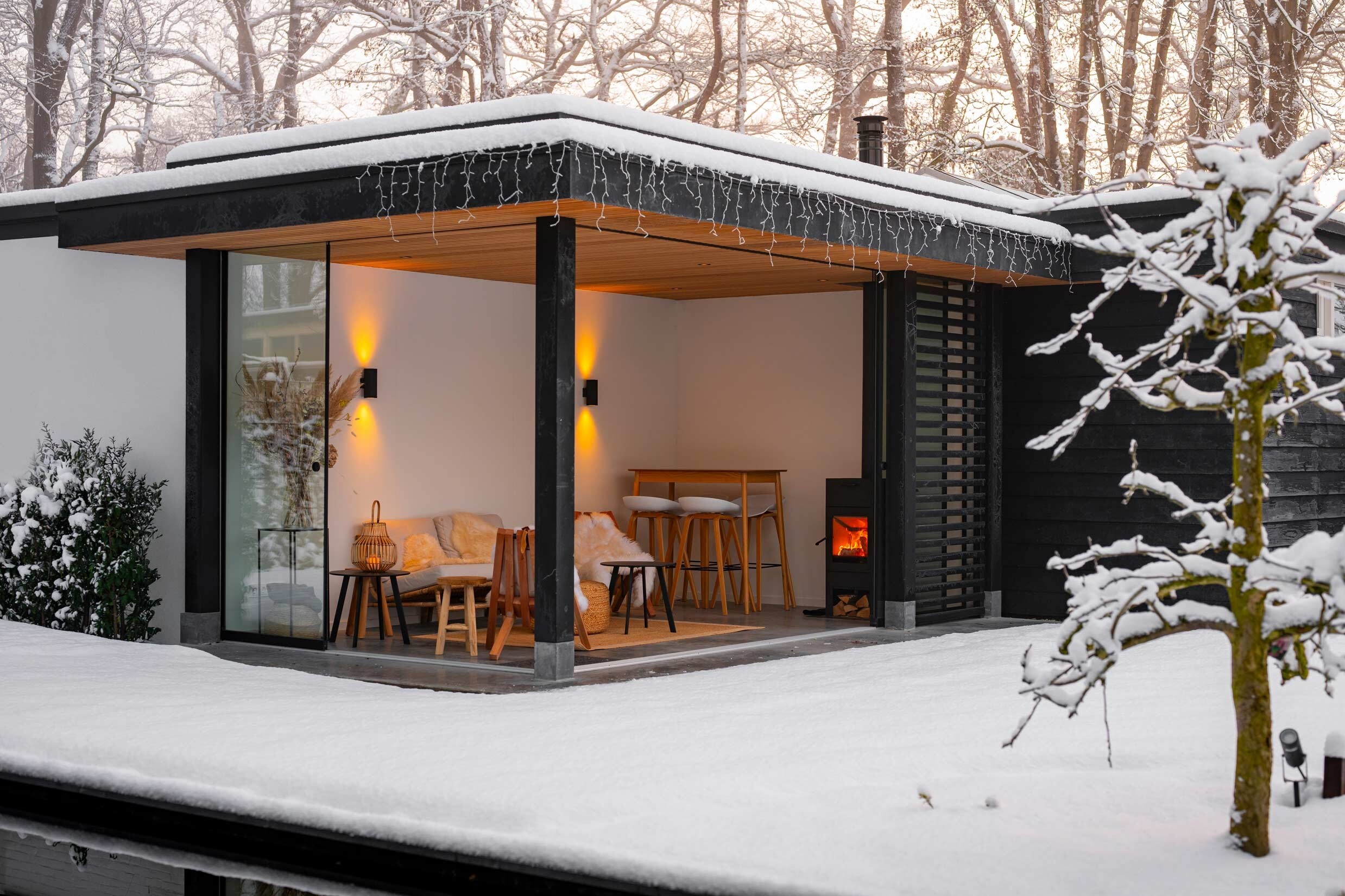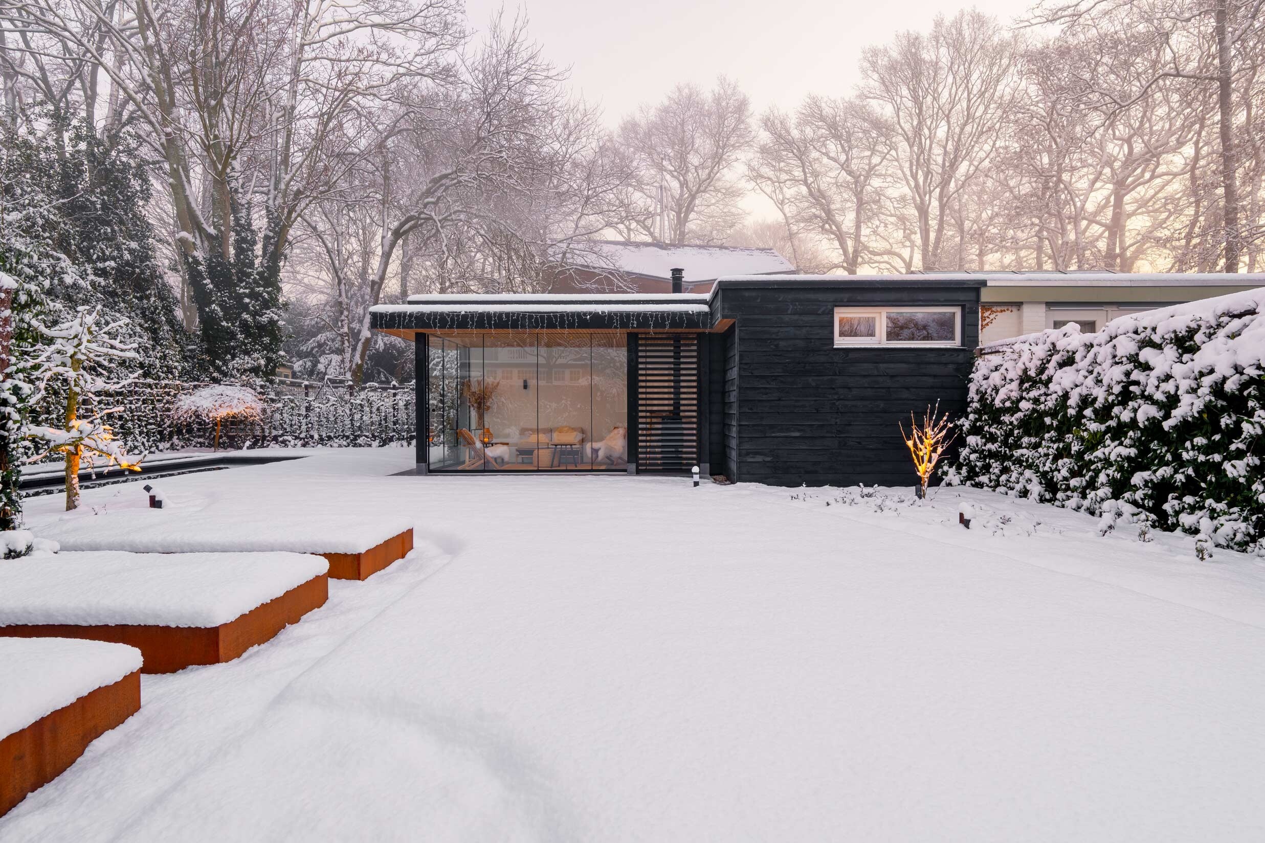 Dat deze tuinkamer een plek is voor vier seizoenen, laten de foto’s perfect zien. Zelfs als het hartje winter is en de tuin bedekt is onder een dik pak sneeuw, is het hier ultiem genieten. Wanneer de dagen frisser worden, sluit je eenvoudig de glazen wanden. Zo zit je heerlijk warm en beschut bij de haard, terwijl je toch dat magische uitzicht houdt op een verstilde, witte tuin.