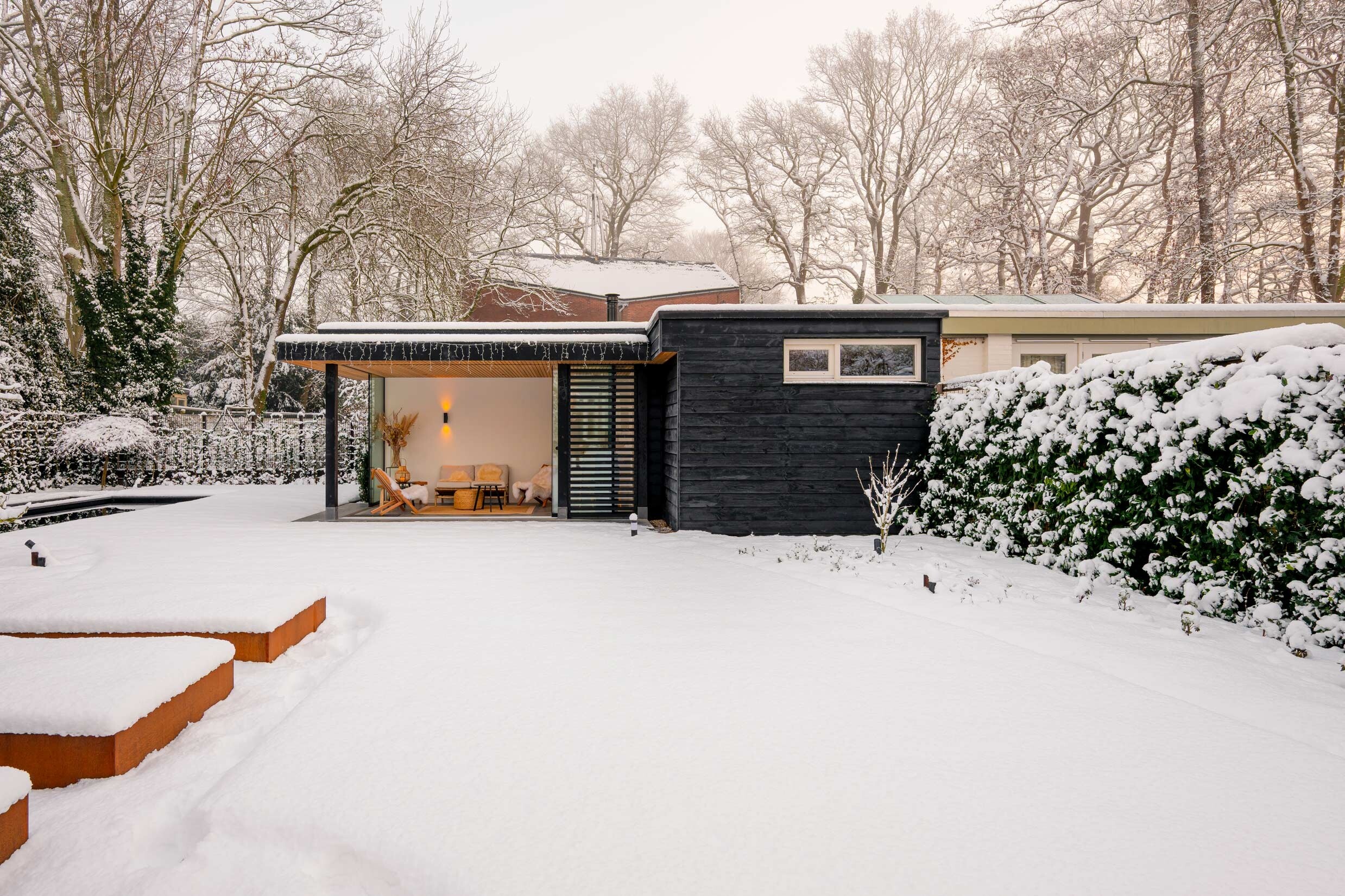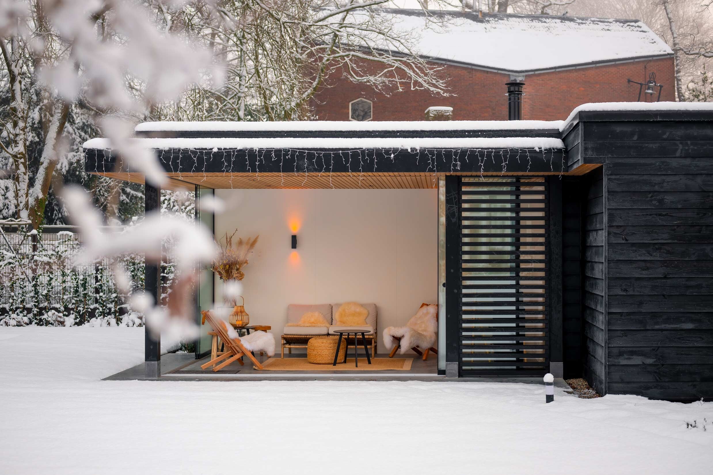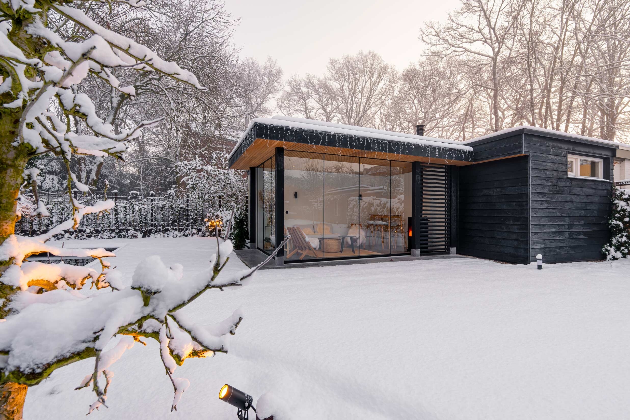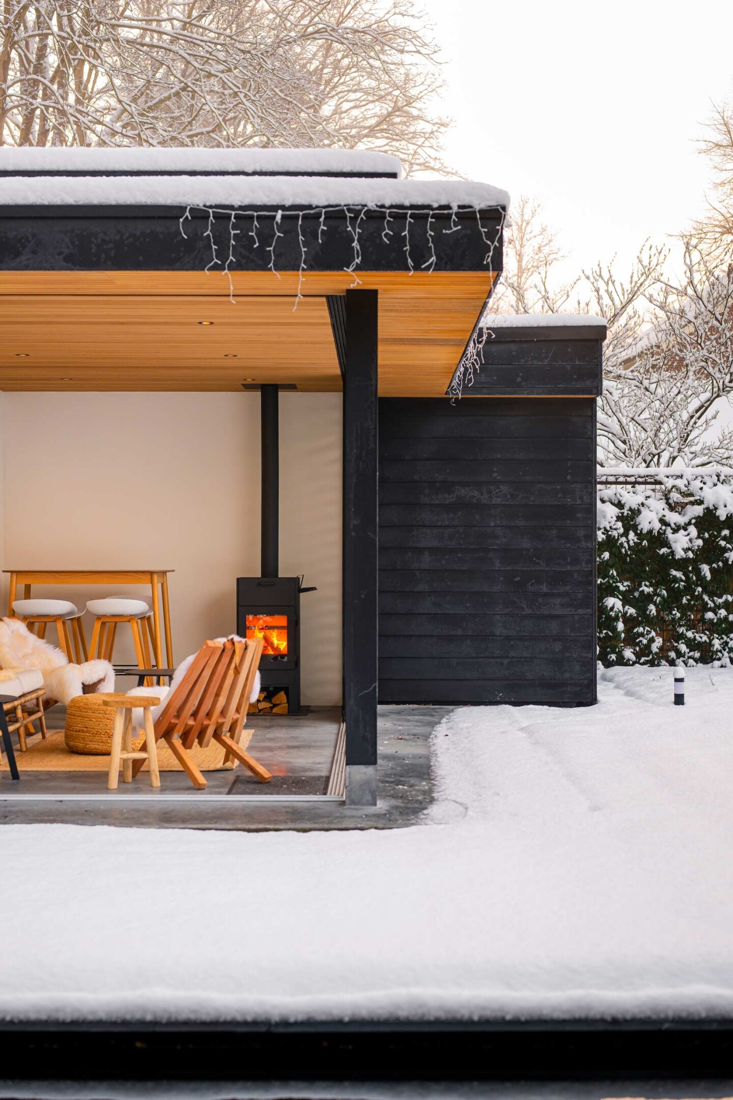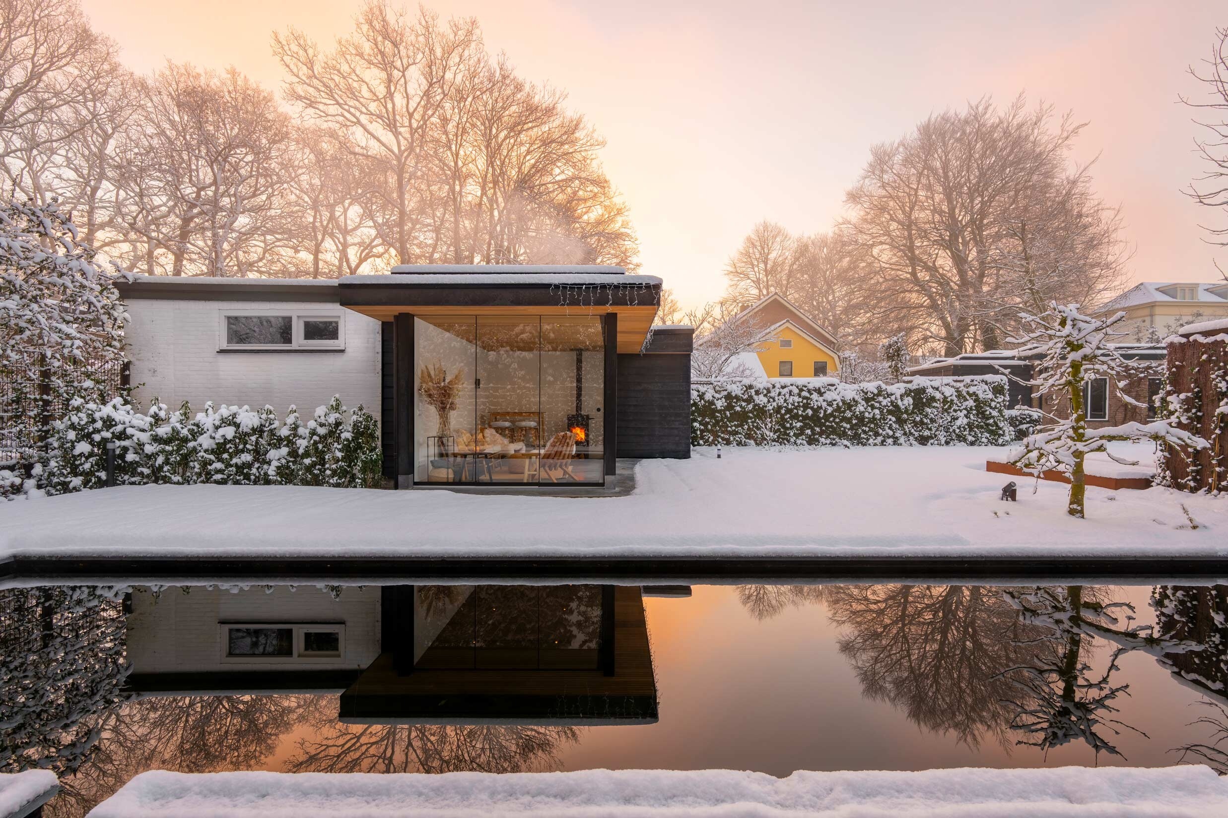 Dat deze tuinkamer een plek is voor vier seizoenen, laten de foto’s perfect zien. Zelfs als het hartje winter is en de tuin bedekt is onder een dik pak sneeuw, is het hier ultiem genieten. Wanneer de dagen frisser worden, sluit je eenvoudig de glazen wanden. Zo zit je heerlijk warm en beschut bij de haard, terwijl je toch dat magische uitzicht houdt op een verstilde, witte tuin.