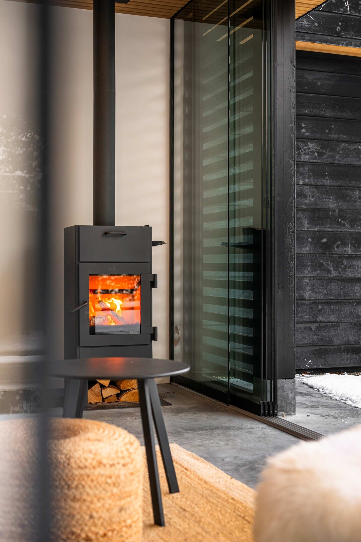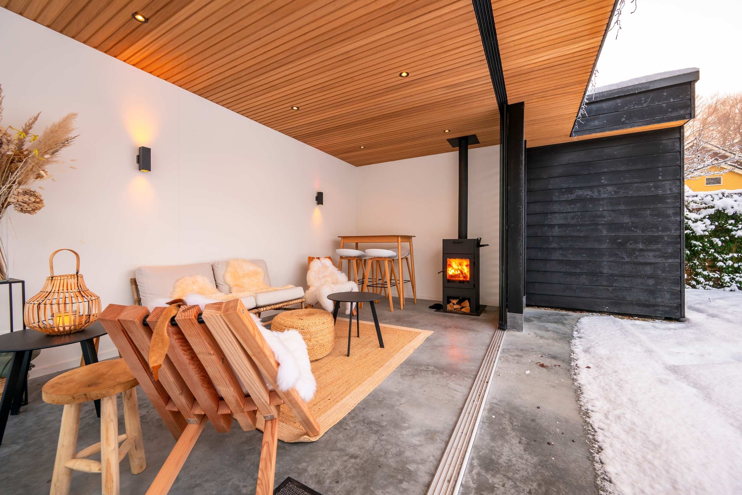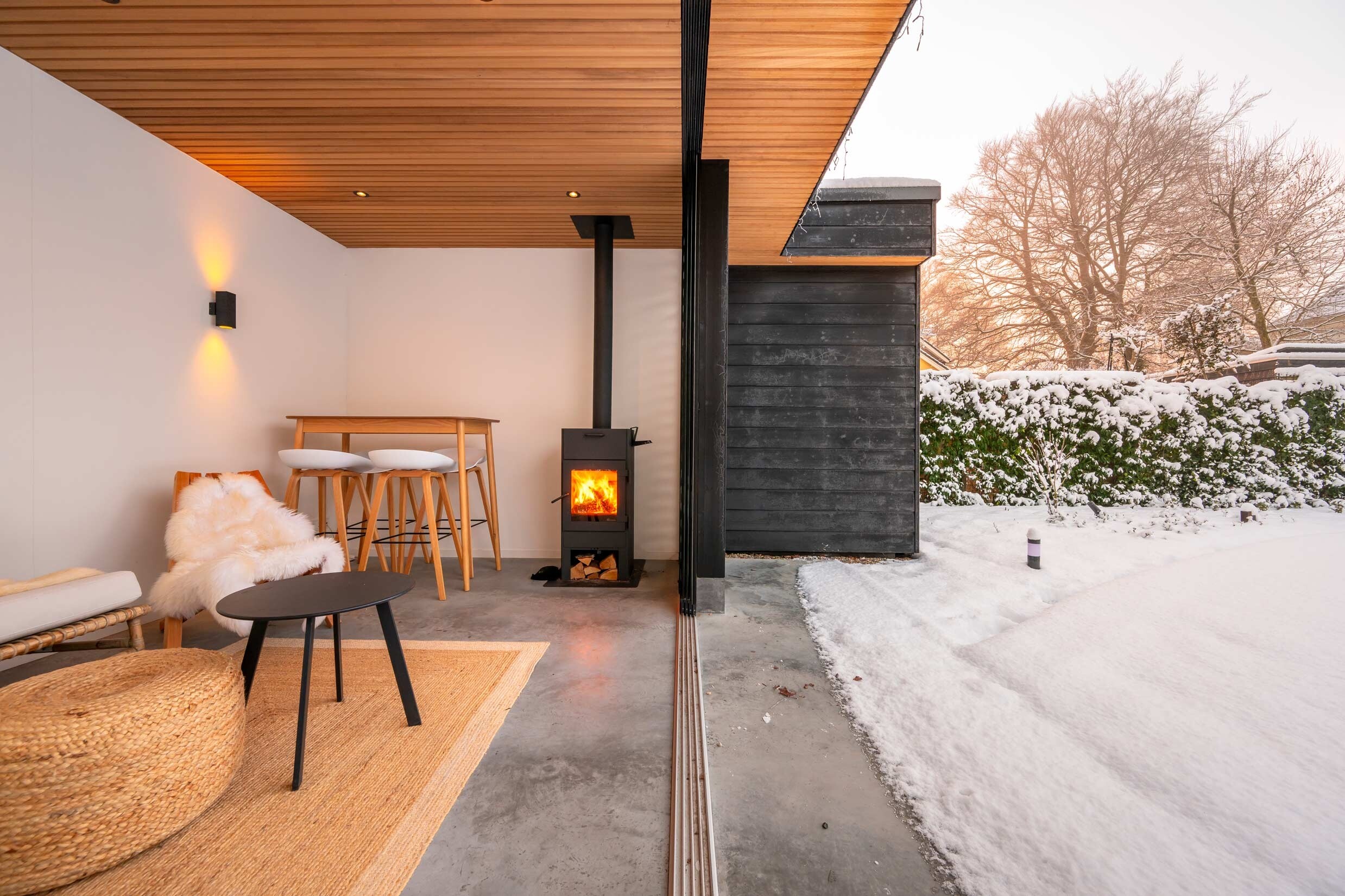 Binnenin vervaagt de grens tussen huis en tuin. De wanden zijn volledig geïsoleerd en aan de binnenzijde strak gestuct, wat direct zorgt voor dat herkenbare, luxe woonkamergevoel. Deze moderne uitstraling wordt prachtig verzacht door het plafond, dat is afgewerkt met sfeervol Thermowood. Om de ruimte niet alleen mooi, maar ook behaaglijk te maken, is er een sfeerhaard geplaatst. Dankzij de uitstekende isolatie blijft de warmte hier goed behouden, waardoor het binnen altijd comfortabel is.